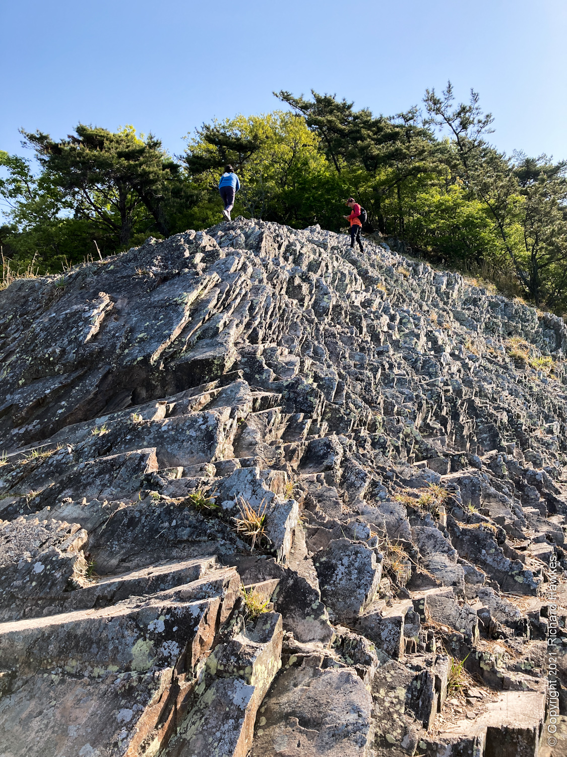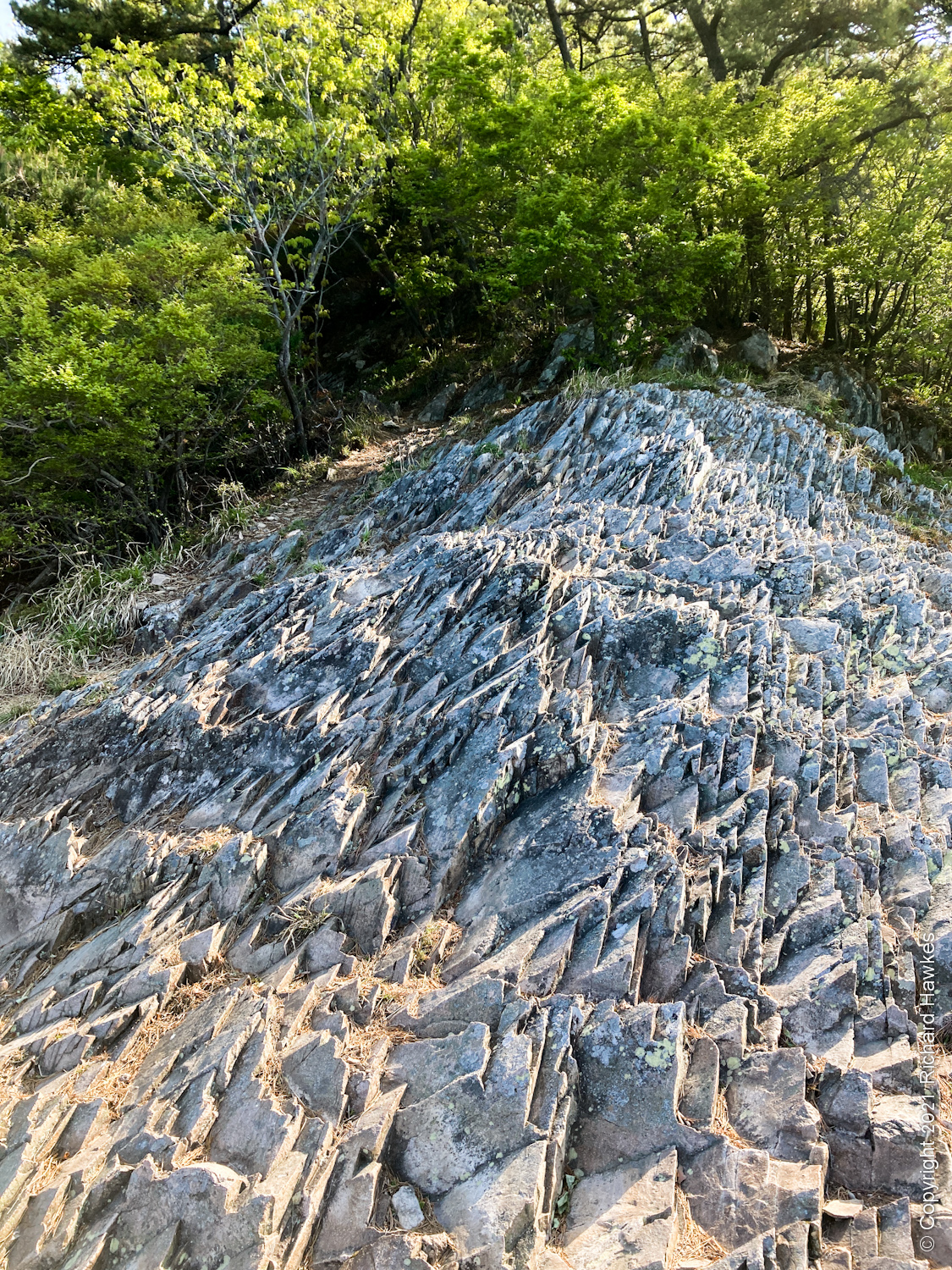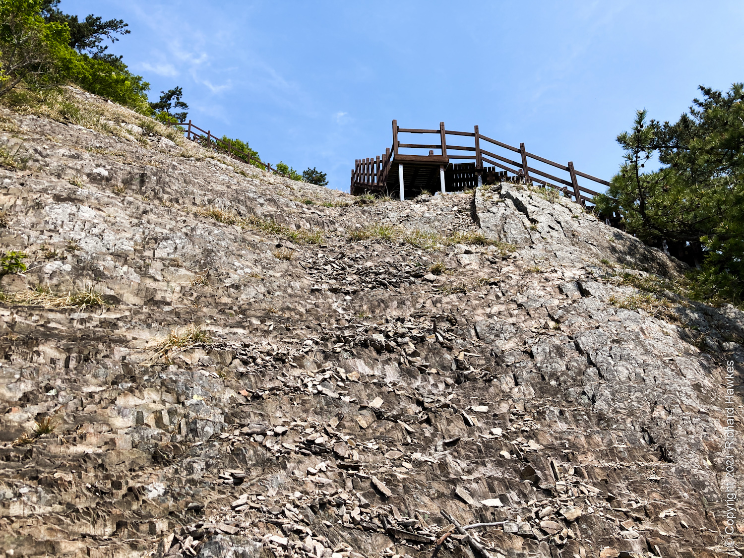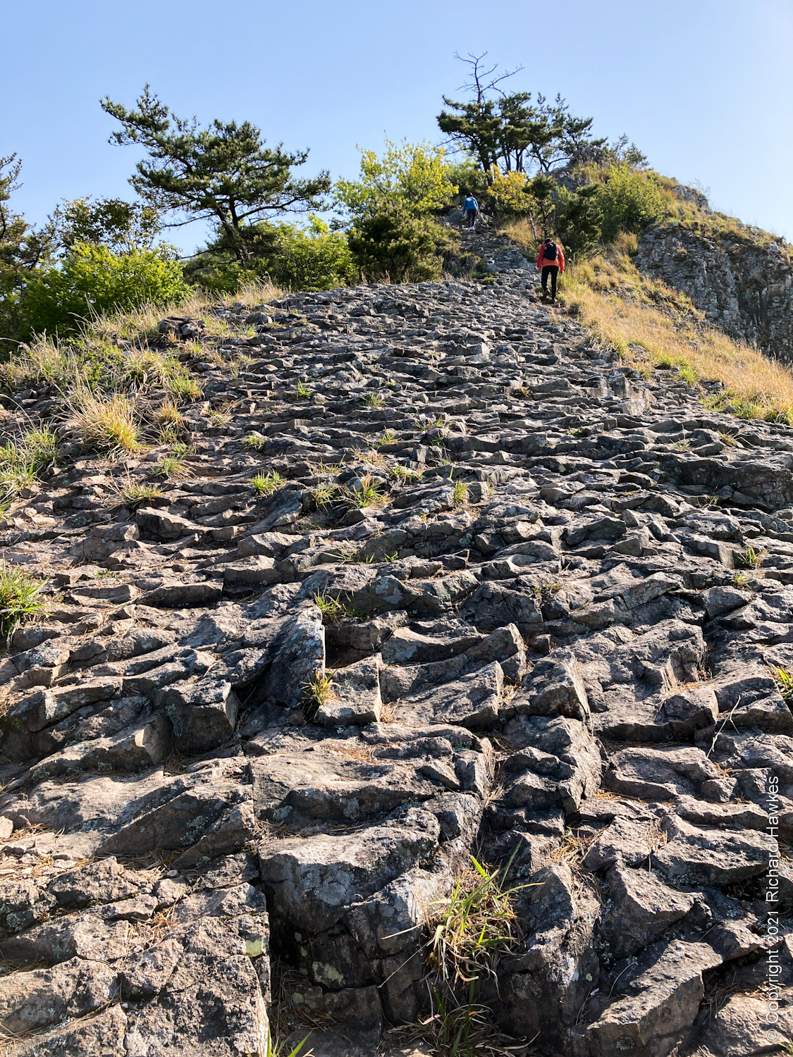 There was an older couple some way in front who I could see through the first part of the wooded trail. Soon after I got to the first rocks and saw what would lie ahead; the rock was angular and somewhat like really thick slate compressed at an angle. This first piece of rock I might have tried to go around as it seemed a bit steep, but fortunately there was a sign and I could see the couple had already started going up. It was easy to get up, but any fall on here would definitely hurt; these were not the ‘friendly’ boulders of Seoul mountains! There were a few of these steep, sharp but solid parts meaning you get high relatively soon. They were all sections I was happy to go up, but would be much less happy about going down!