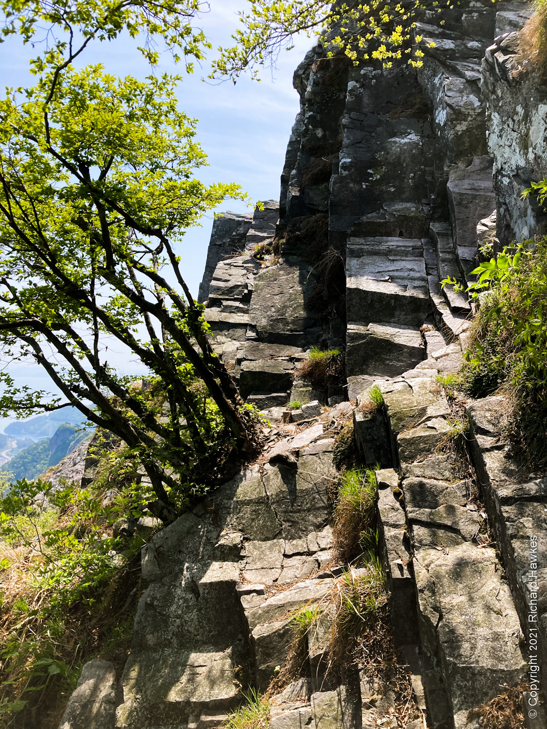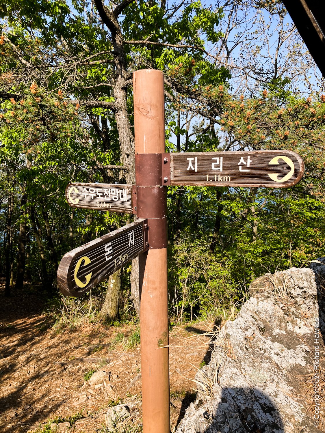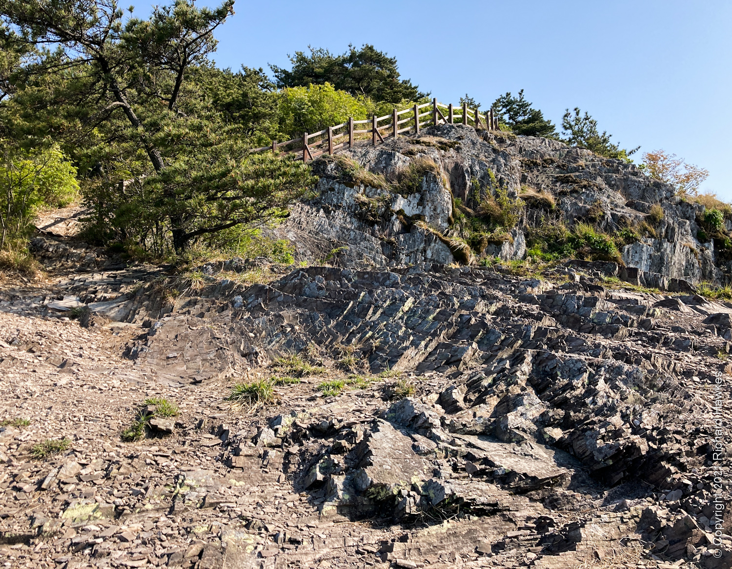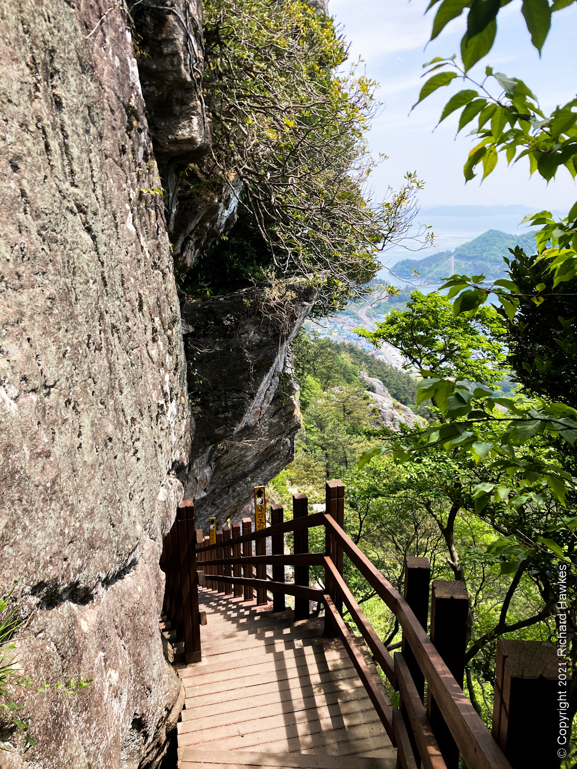 There was an older couple some way in front who I could see through the first part of the wooded trail. Soon after I got to the first rocks and saw what would lie ahead; the rock was angular and somewhat like really thick slate compressed at an angle. This first piece of rock I might have tried to go around as it seemed a bit steep, but fortunately there was a sign and I could see the couple had already started going up. It was easy to get up, but any fall on here would definitely hurt; these were not the ‘friendly’ boulders of Seoul mountains! There were a few of these steep, sharp but solid parts meaning you get high relatively soon. They were all sections I was happy to go up, but would be much less happy about going down!