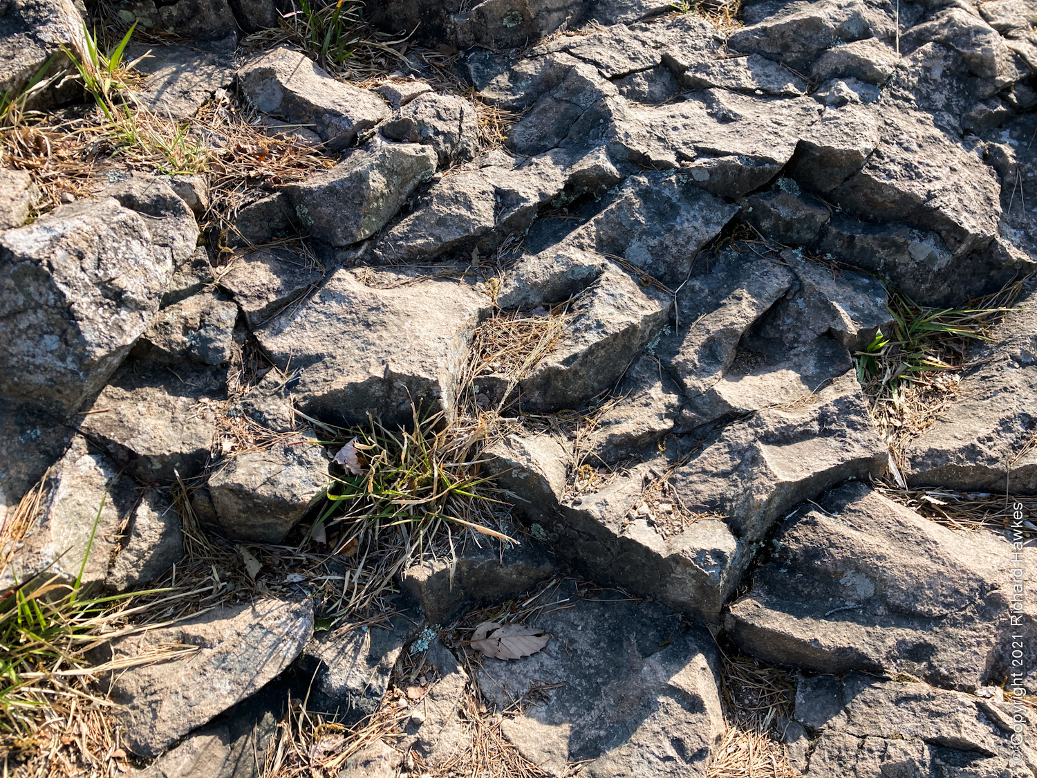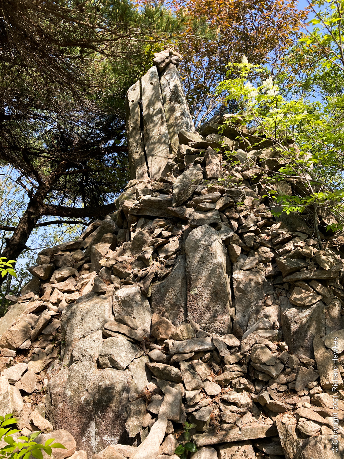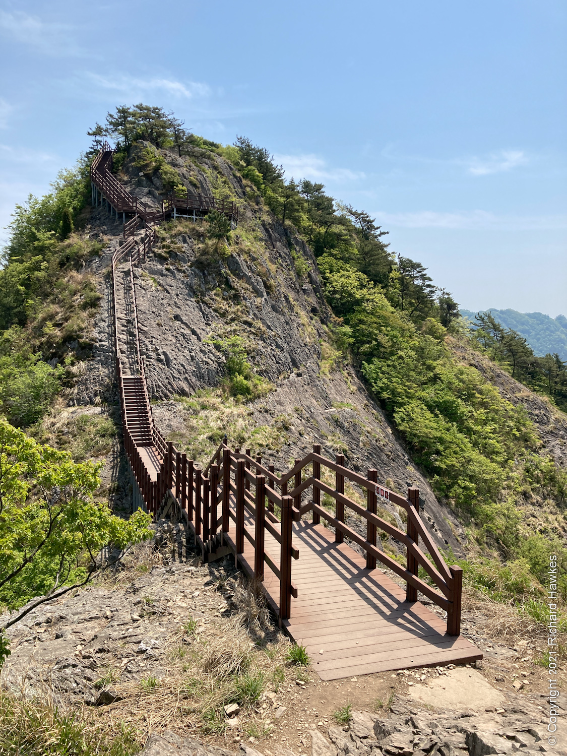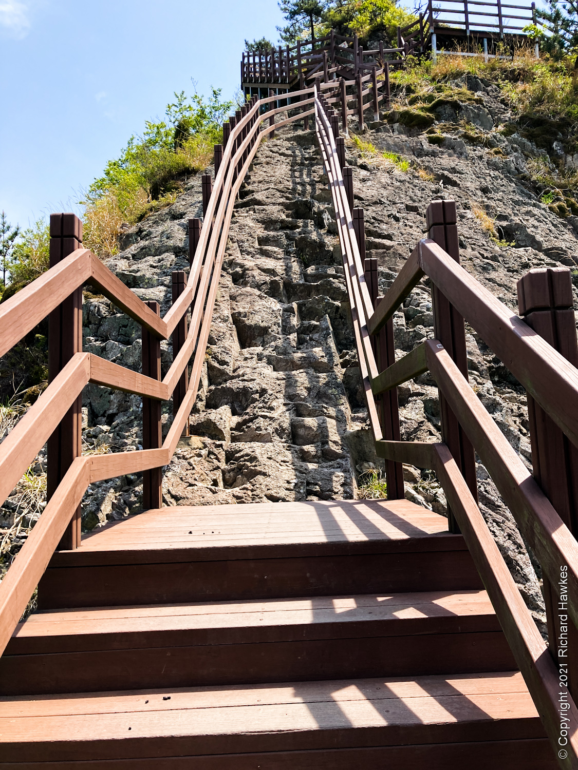 There was an older couple some way in front who I could see through the first part of the wooded trail. Soon after I got to the first rocks and saw what would lie ahead; the rock was angular and somewhat like really thick slate compressed at an angle. This first piece of rock I might have tried to go around as it seemed a bit steep, but fortunately there was a sign and I could see the couple had already started going up. It was easy to get up, but any fall on here would definitely hurt; these were not the ‘friendly’ boulders of Seoul mountains! There were a few of these steep, sharp but solid parts meaning you get high relatively soon. They were all sections I was happy to go up, but would be much less happy about going down!