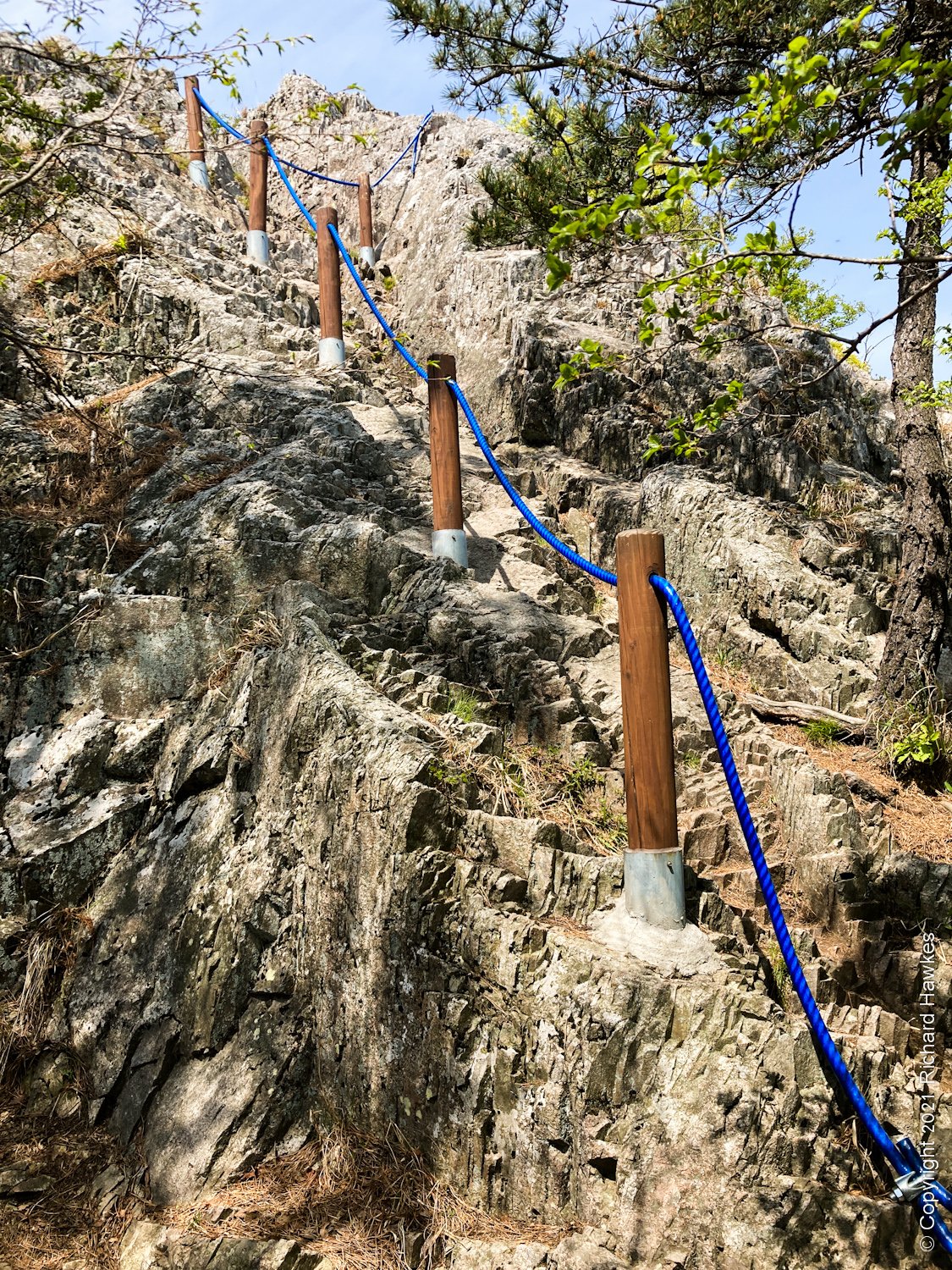 The ridge is quite long and not too hard to go along. I could see it was coming to an end and I was expecting some nice wooden steps… I was so wrong… Getting off the ridge was the toughest, slowest part of the hike; the way off wasn’t too clear, there were the hard jagged rock and some really steep sections, with and without rails! Also, there were sections with loose shards which worried me about slipping. I should also add that I hadn’t seen a soul since passing the older couple a looong way back. I just took it really carefully (=slowly) not wanting to go off the trail here at all. It was slow going but I made it without incident and realised this hike was actually more mentally than physically tiring!