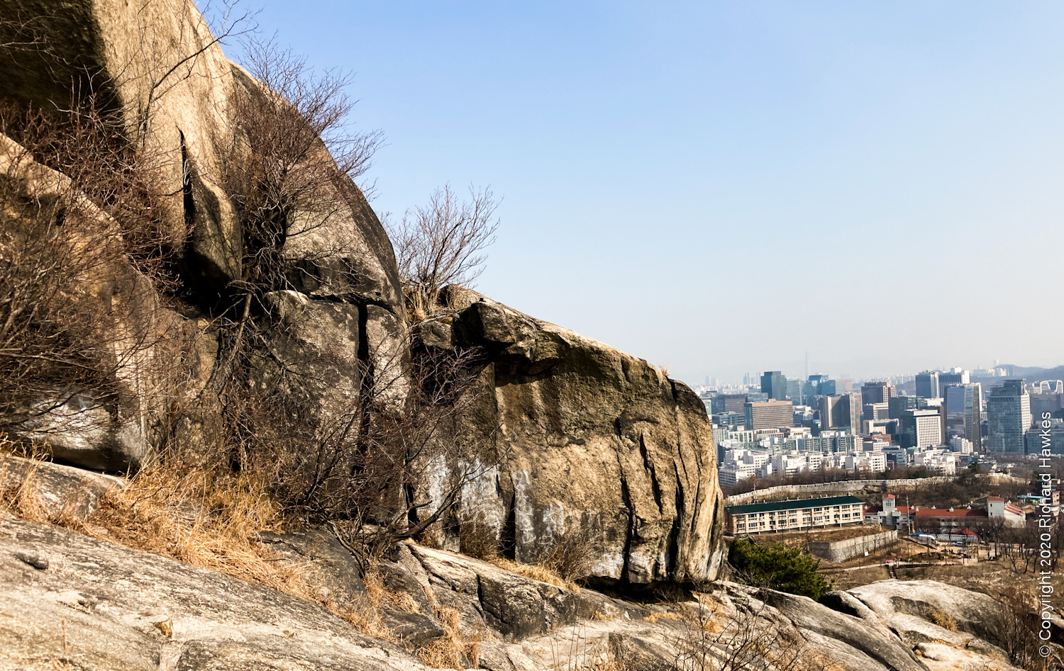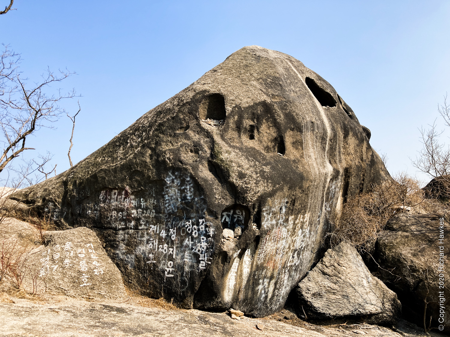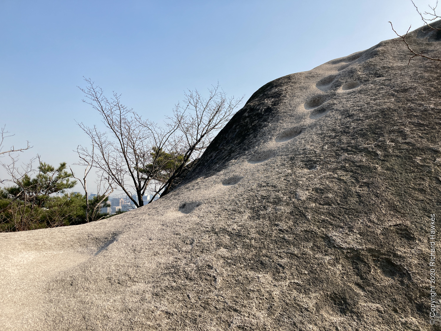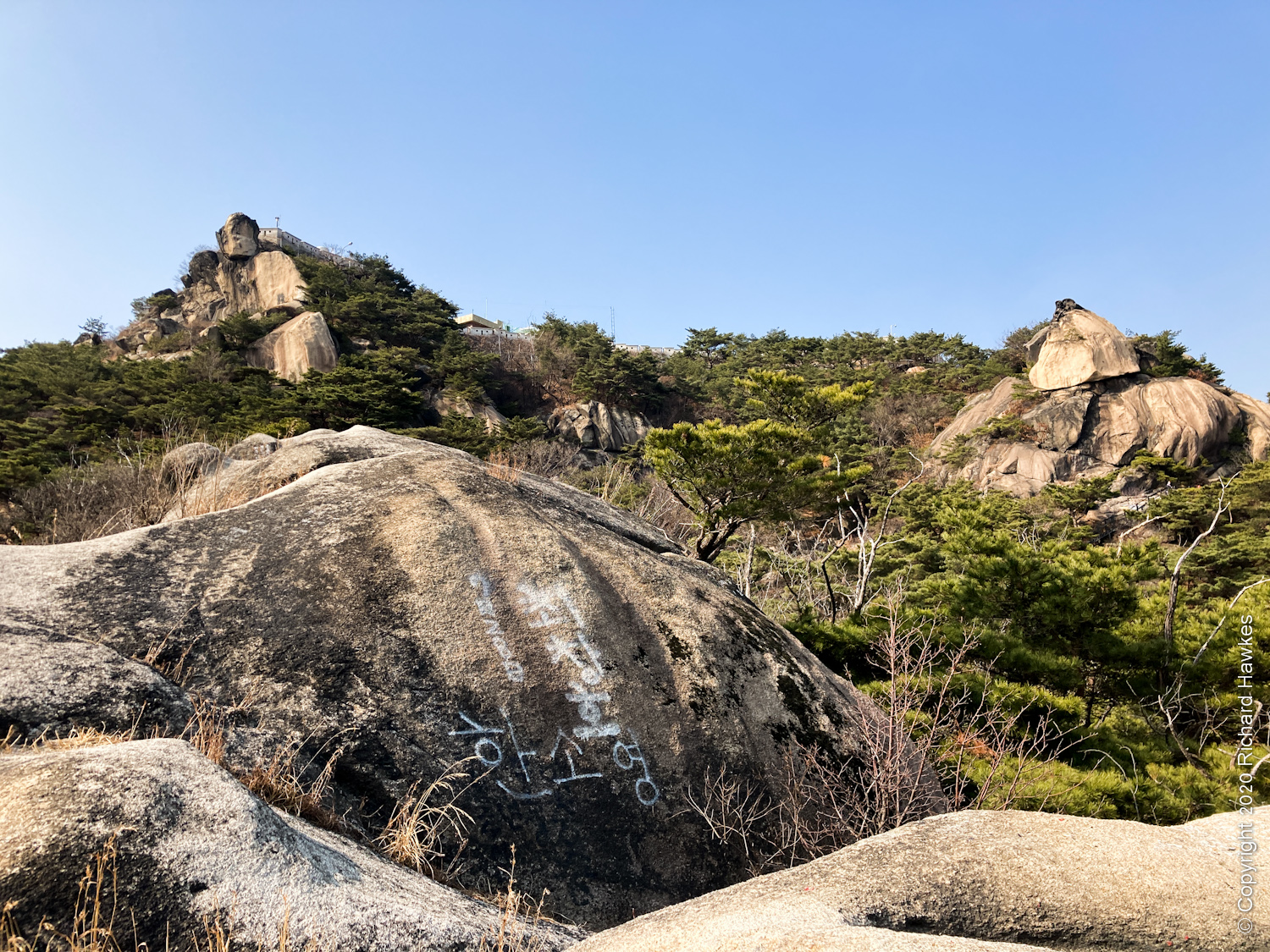 A bit further up, the steps gave way to rock and here was where the white writing started; white messages or prayers written onto the boulders. People seemed to come up here and pray. A bit higher up was a boulder with pits formed into steps for getting to the top. You could look down onto the places I’d just been to, plus over to Ansan mountain in the west, along with the prison museum in the Independence Park.