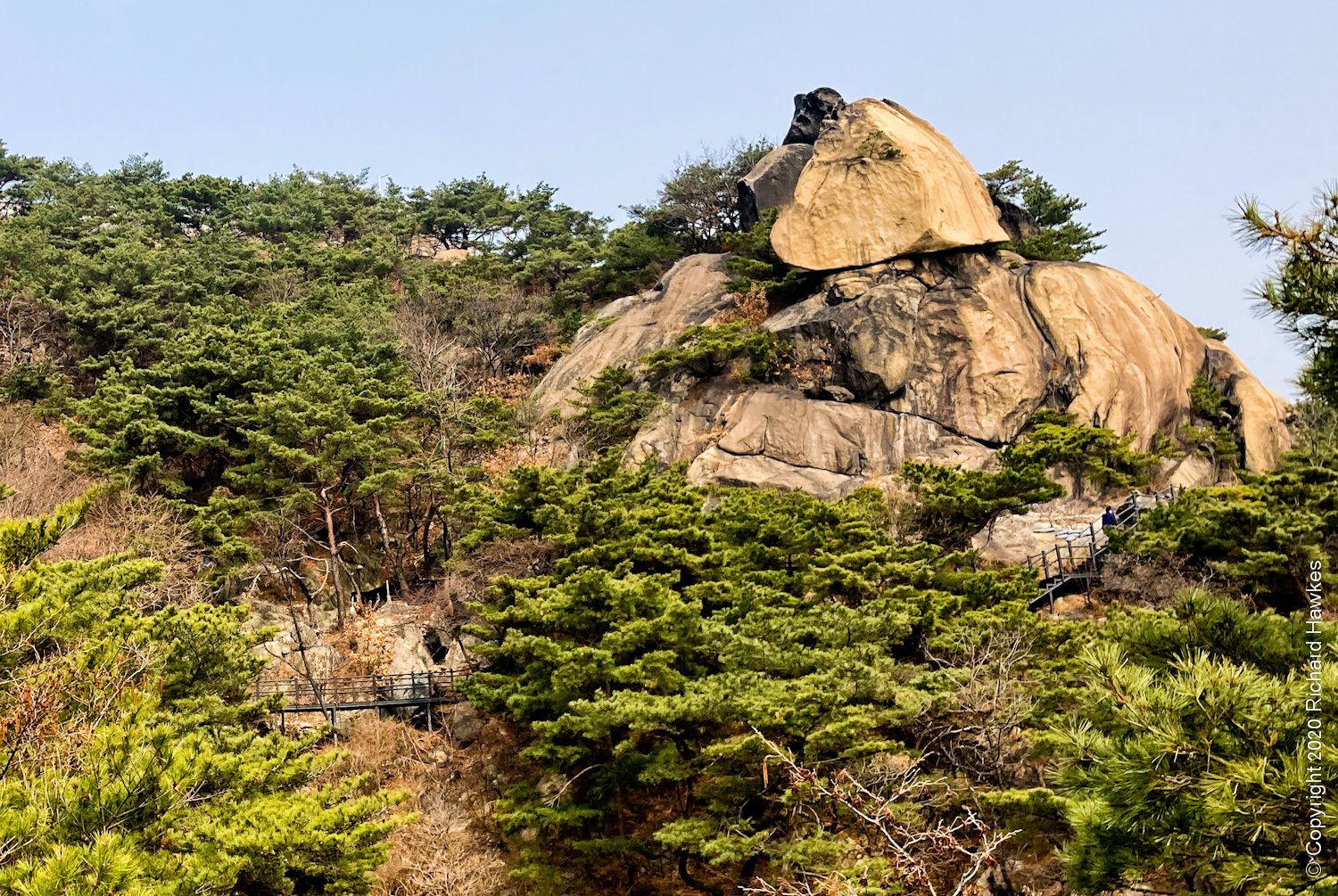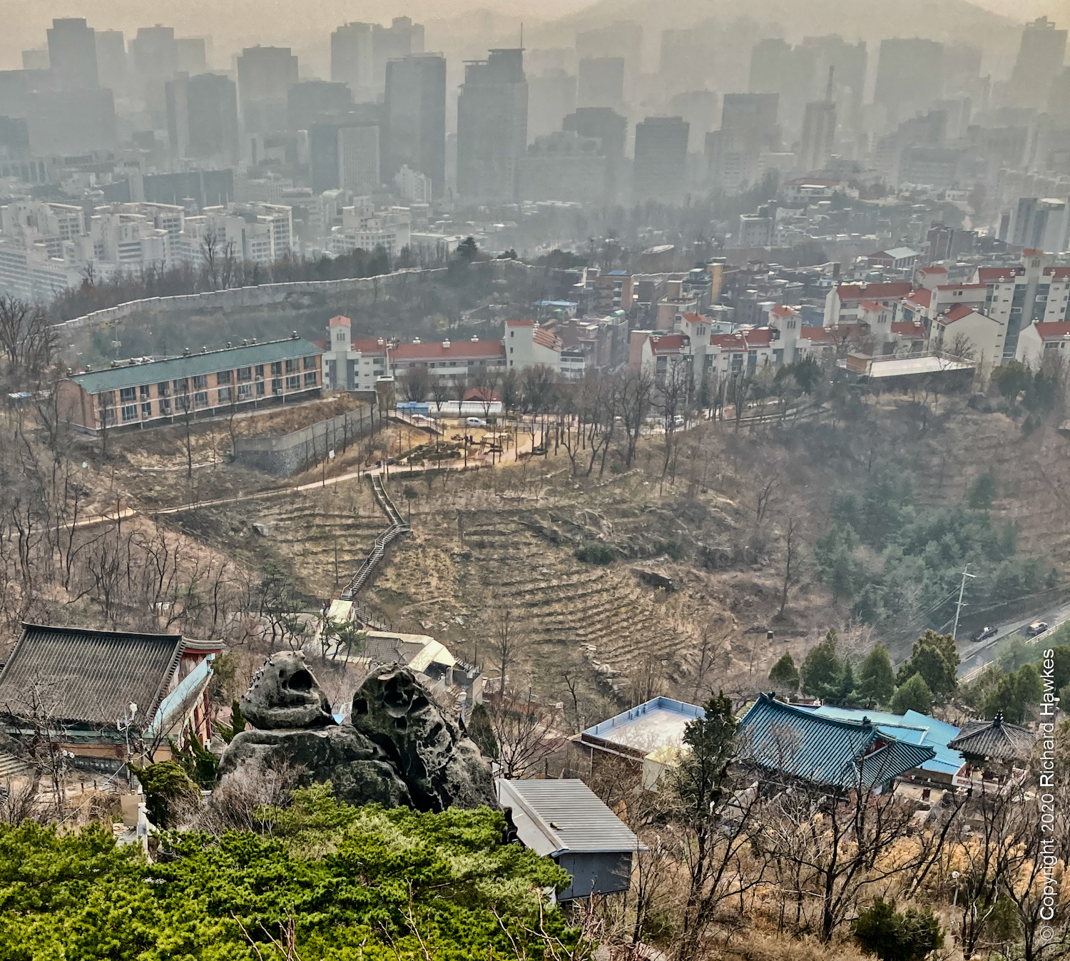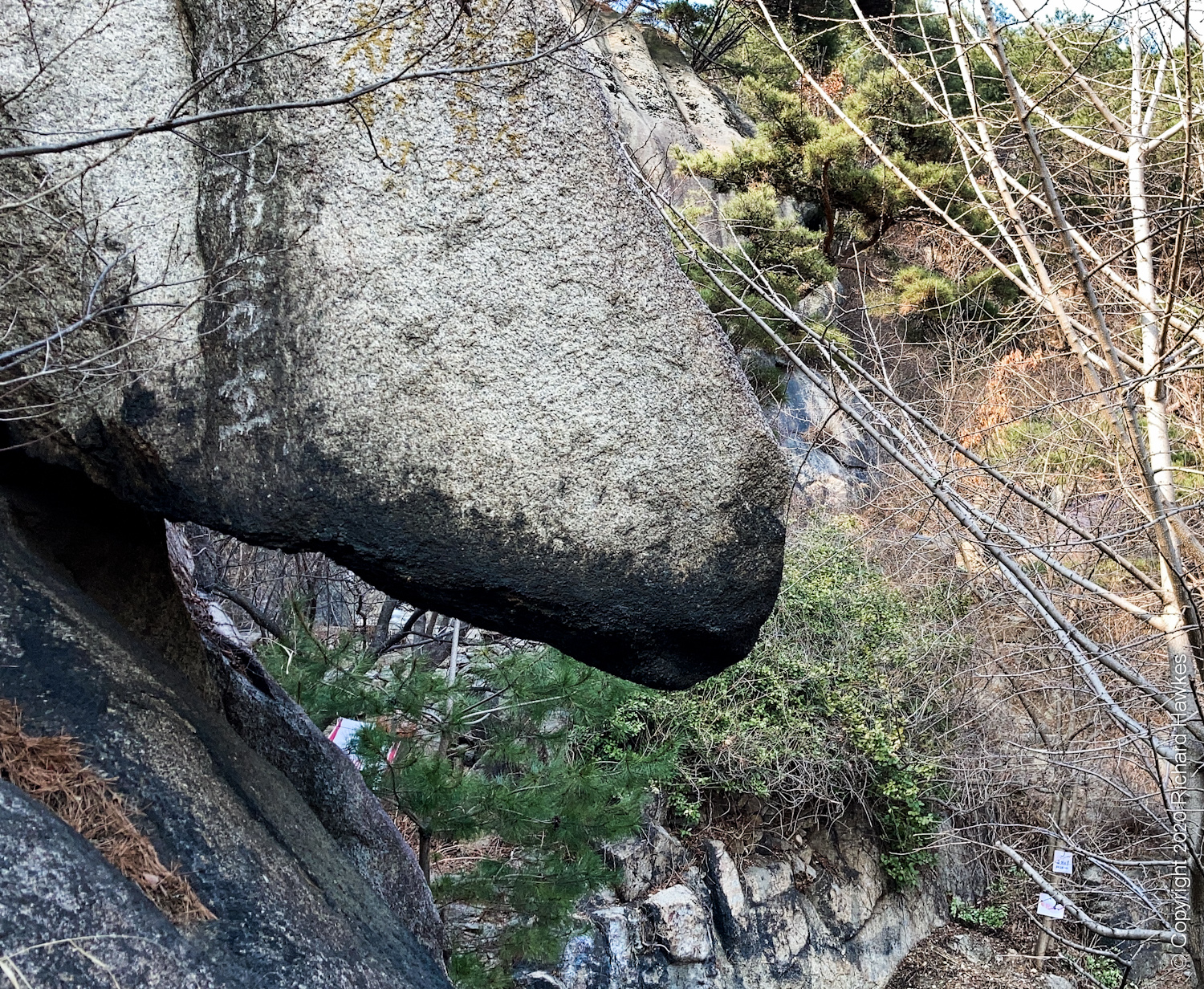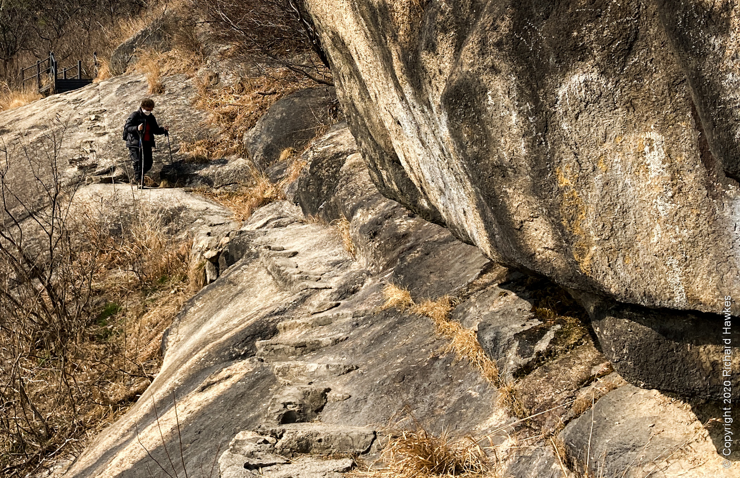 A bit further up, the steps gave way to rock and here was where the white writing started; white messages or prayers written onto the boulders. People seemed to come up here and pray. A bit higher up was a boulder with pits formed into steps for getting to the top. You could look down onto the places I’d just been to, plus over to Ansan mountain in the west, along with the prison museum in the Independence Park.