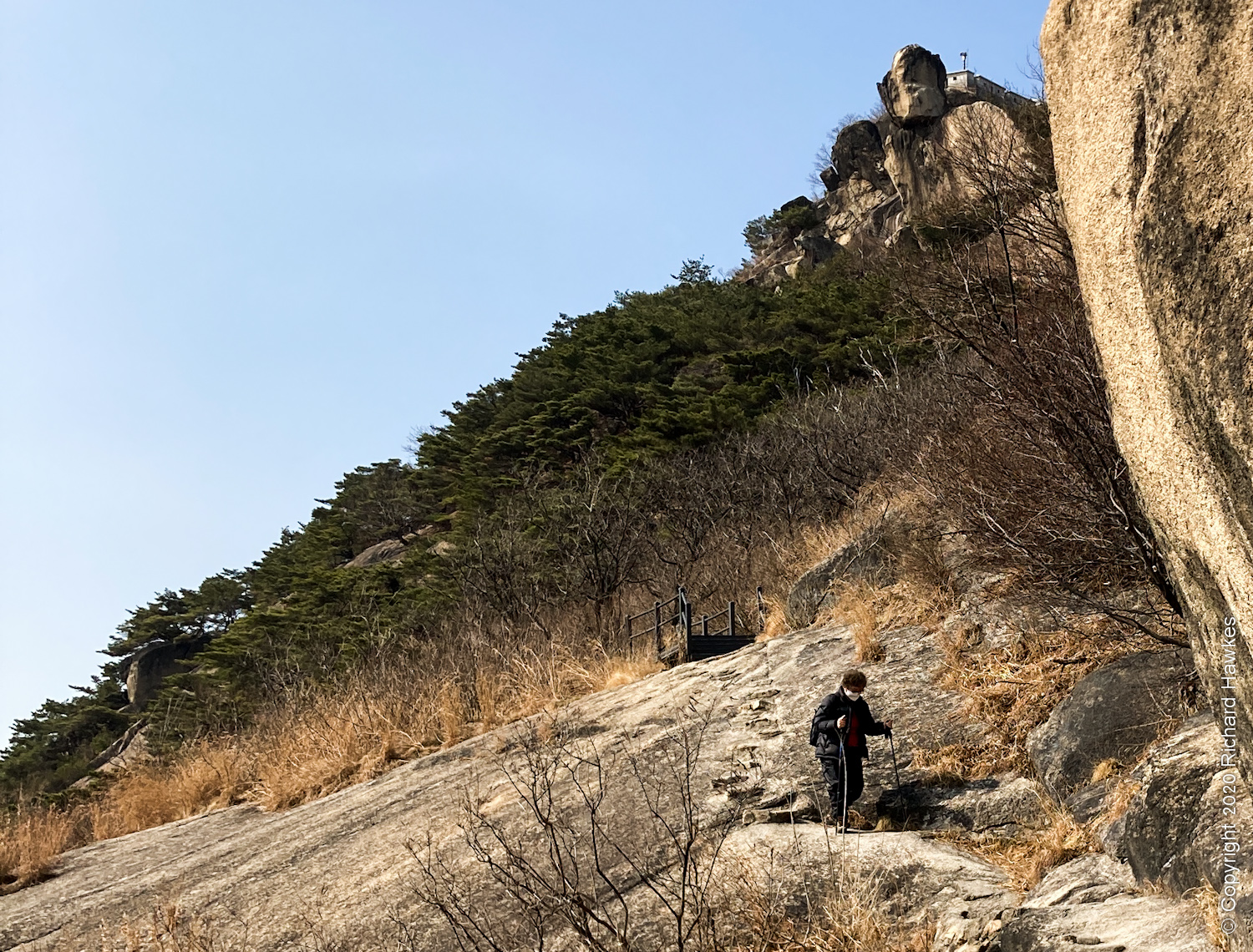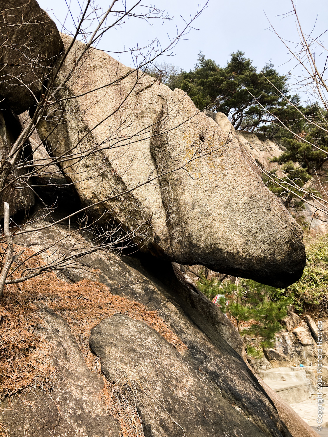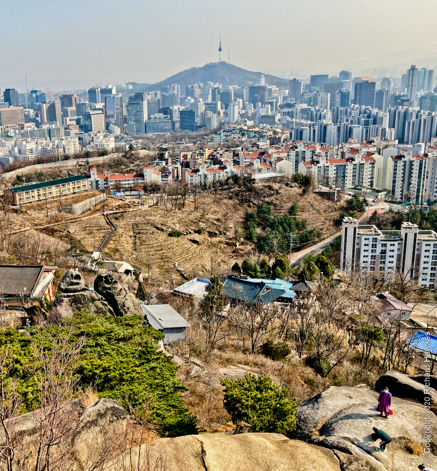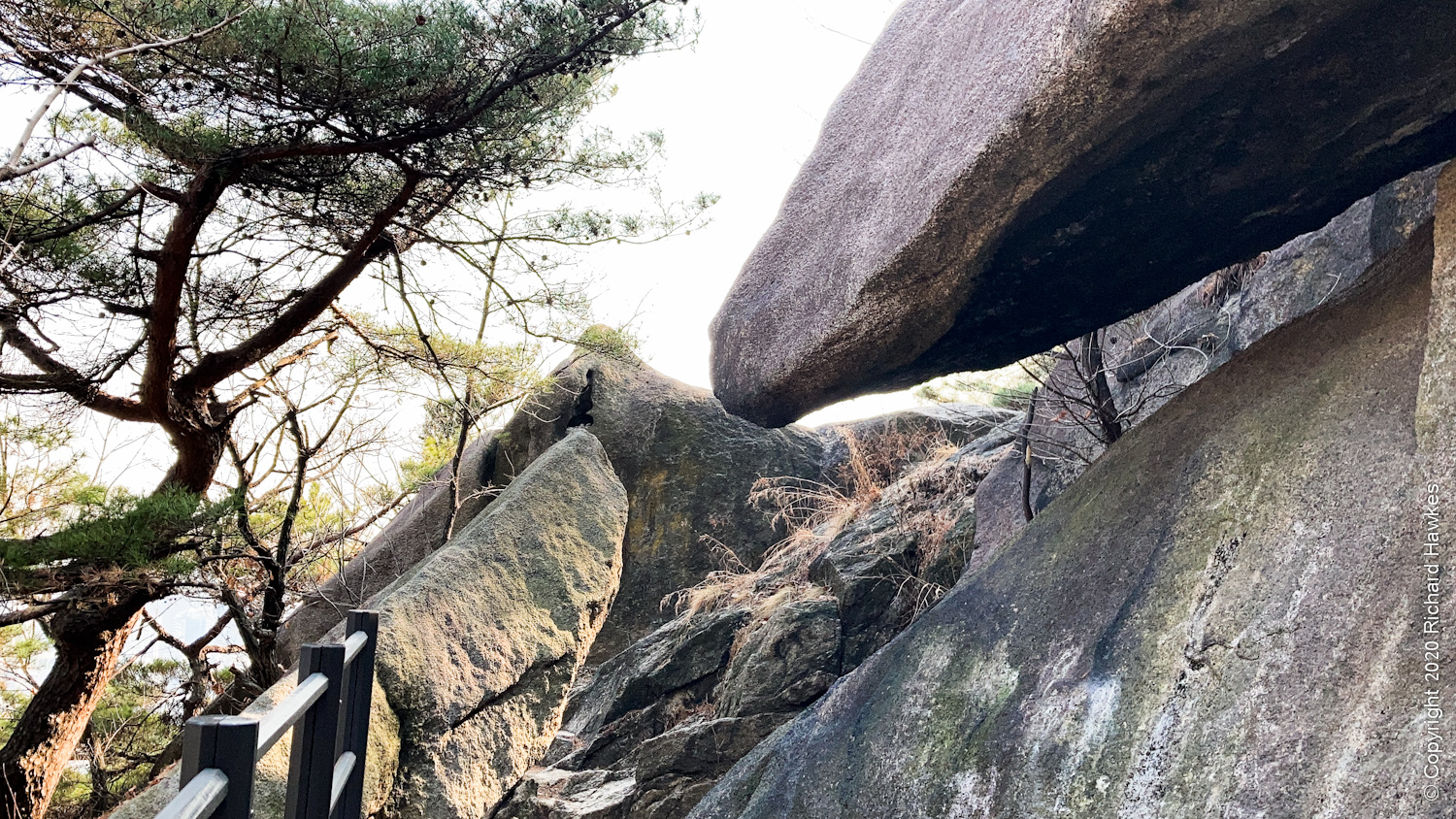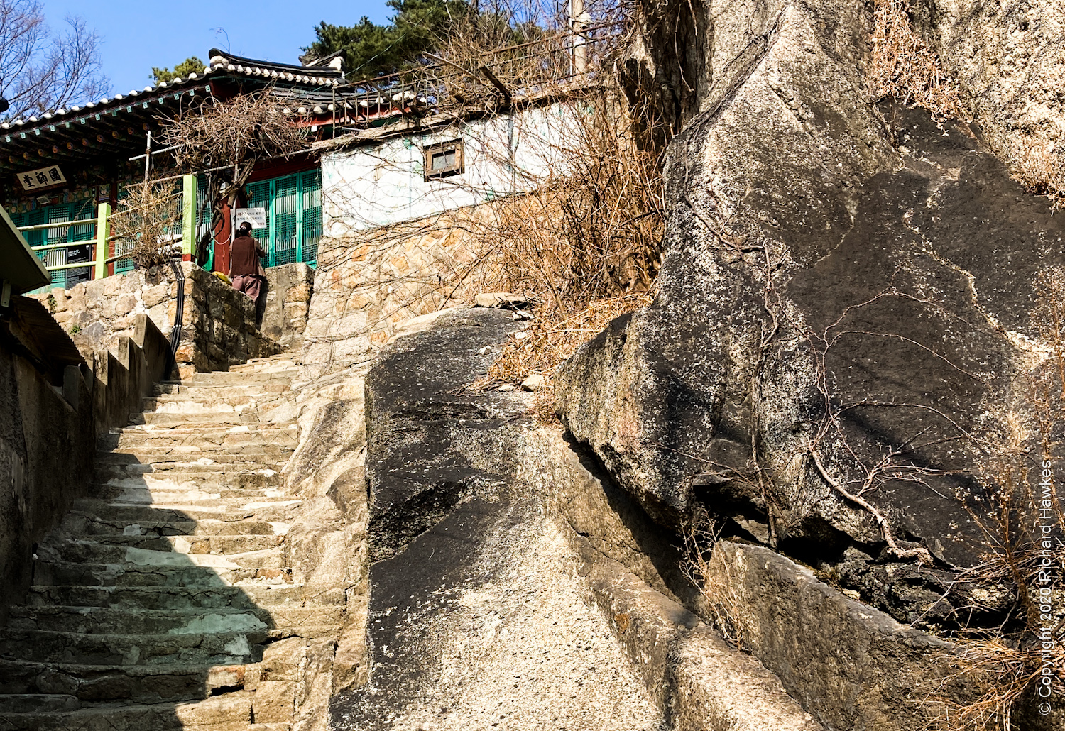 A bit further up, the steps gave way to rock and here was where the white writing started; white messages or prayers written onto the boulders. People seemed to come up here and pray. A bit higher up was a boulder with pits formed into steps for getting to the top. You could look down onto the places I’d just been to, plus over to Ansan mountain in the west, along with the prison museum in the Independence Park.
