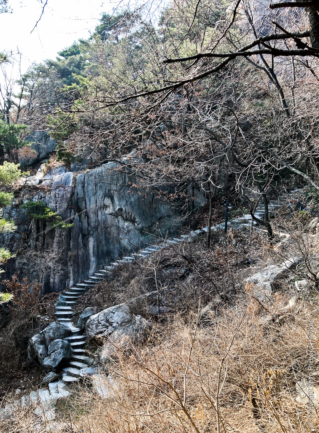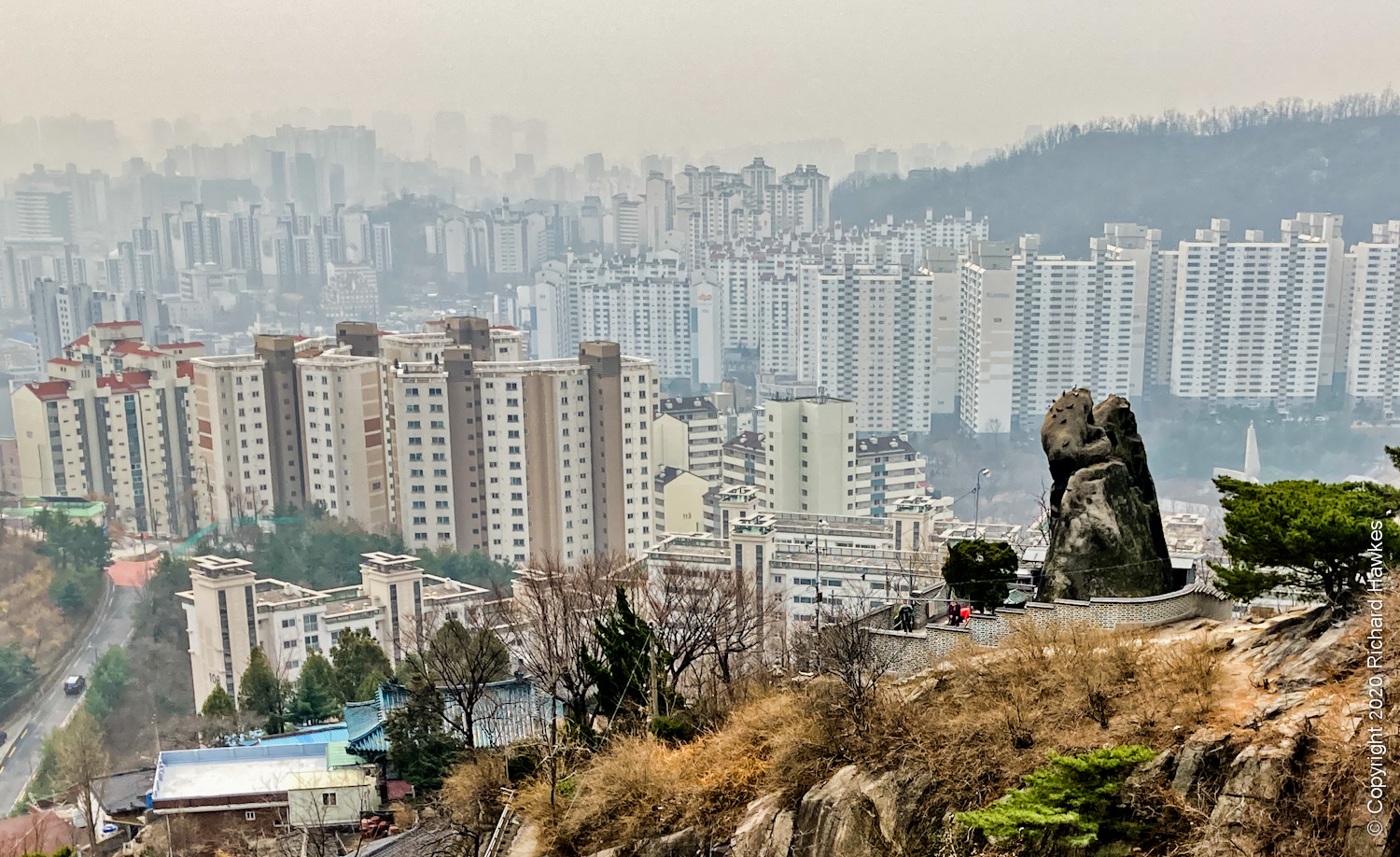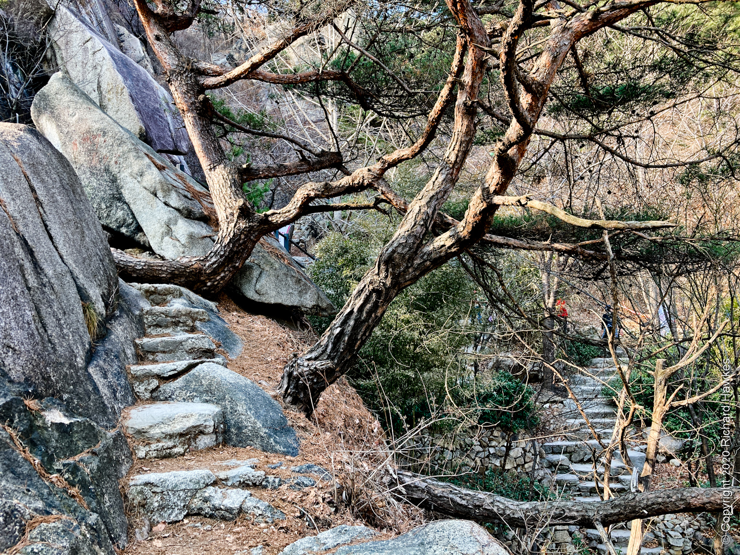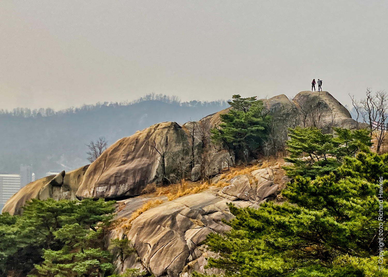 A bit further up, the steps gave way to rock and here was where the white writing started; white messages or prayers written onto the boulders. People seemed to come up here and pray. A bit higher up was a boulder with pits formed into steps for getting to the top. You could look down onto the places I’d just been to, plus over to Ansan mountain in the west, along with the prison museum in the Independence Park.
