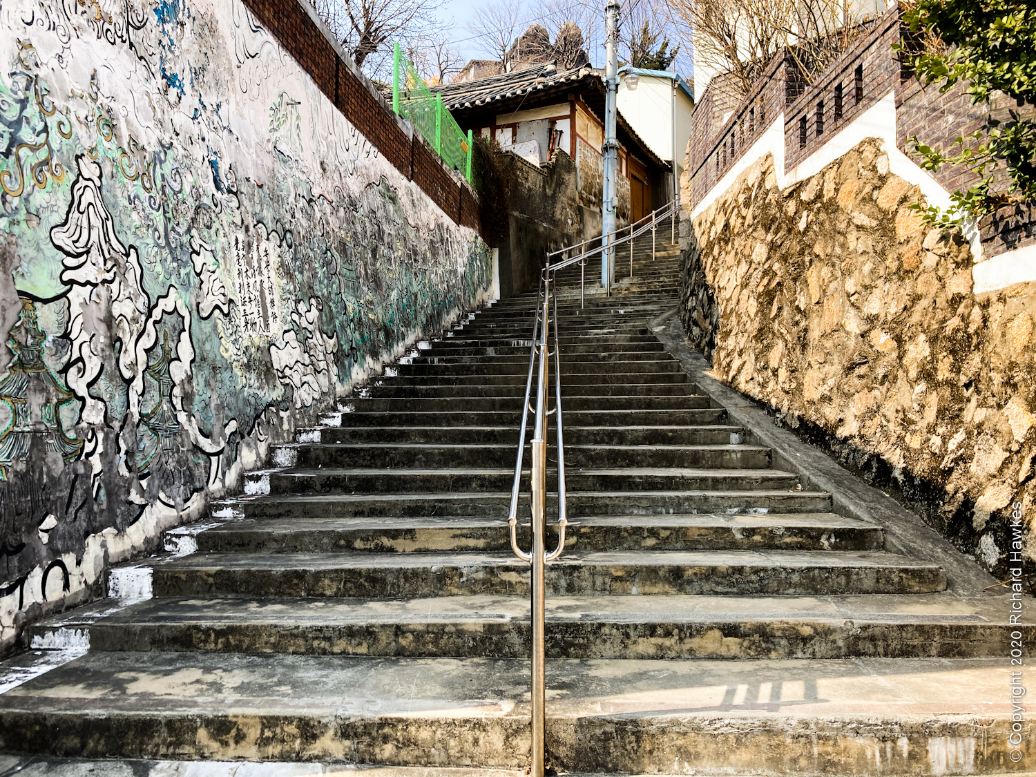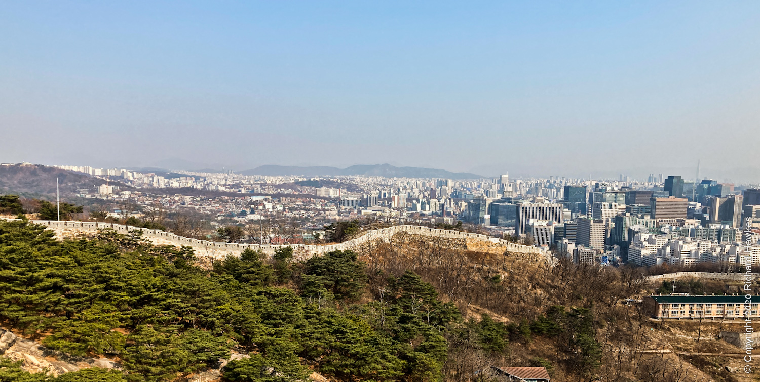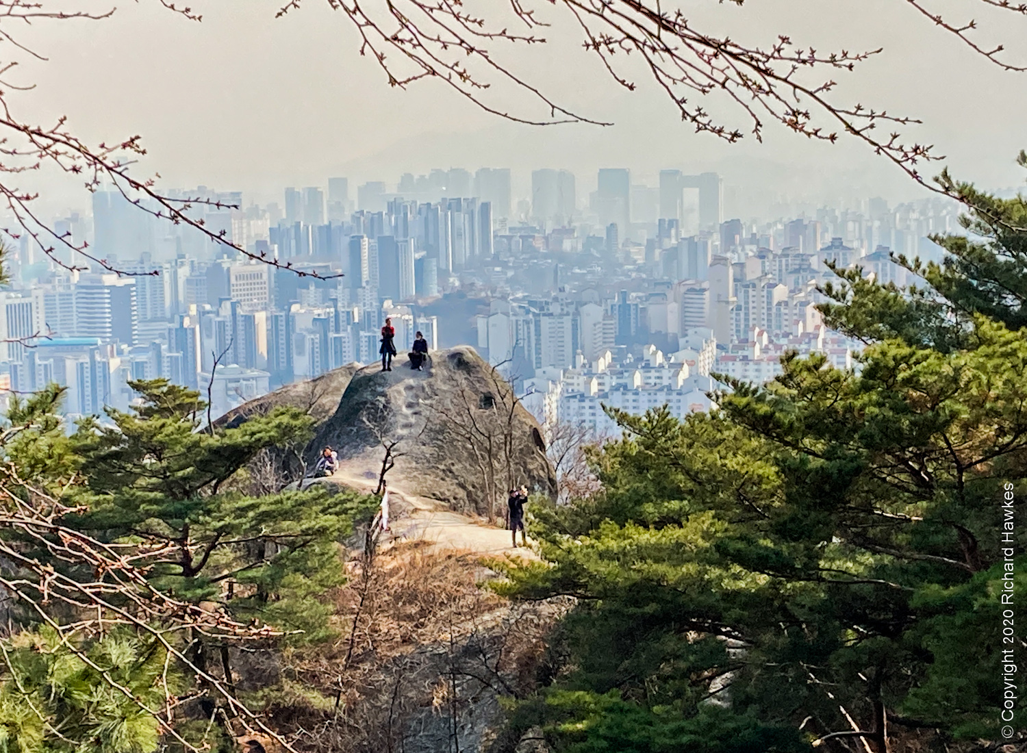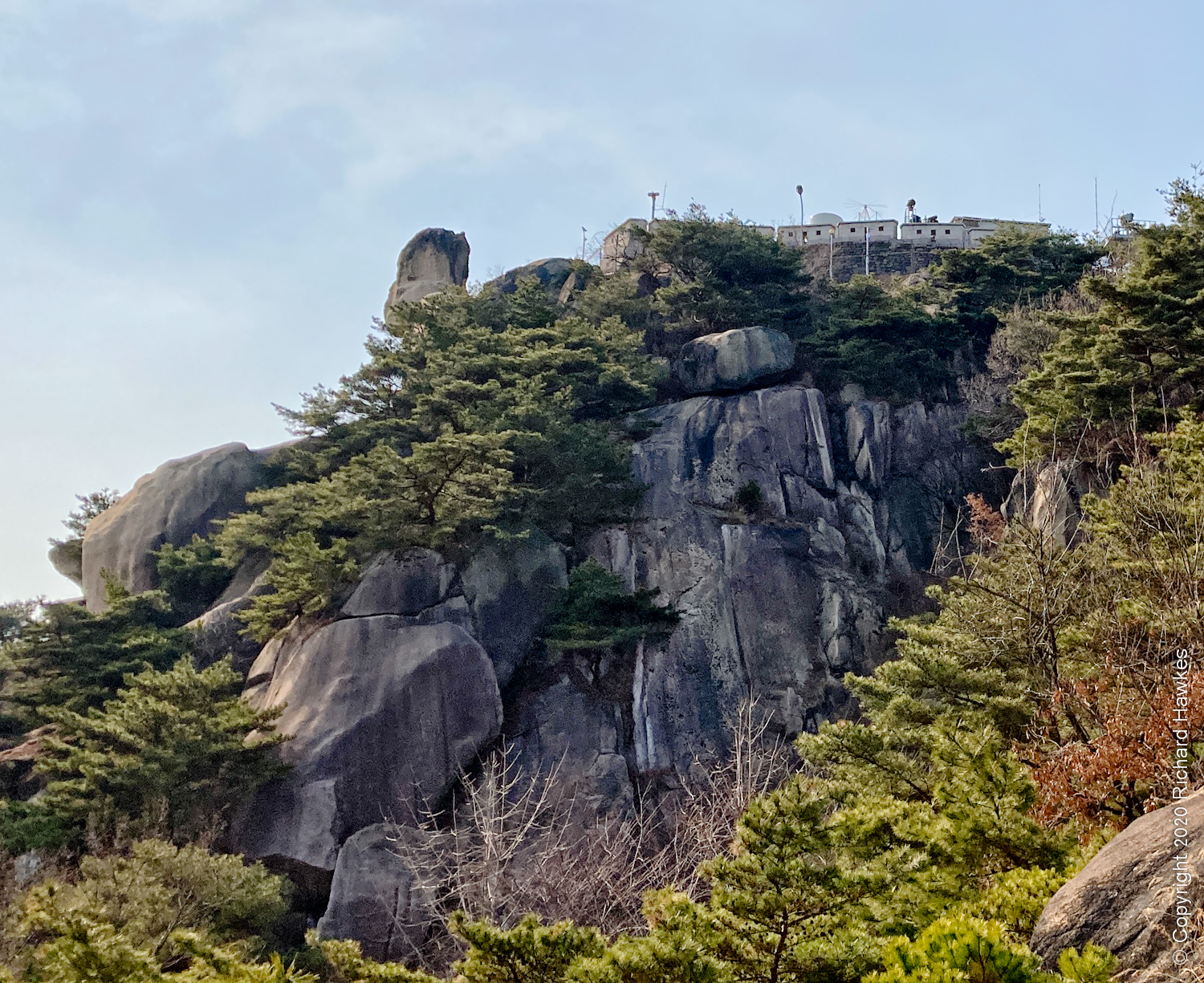 A bit further up, the steps gave way to rock and here was where the white writing started; white messages or prayers written onto the boulders. People seemed to come up here and pray. A bit higher up was a boulder with pits formed into steps for getting to the top. You could look down onto the places I’d just been to, plus over to Ansan mountain in the west, along with the prison museum in the Independence Park.
