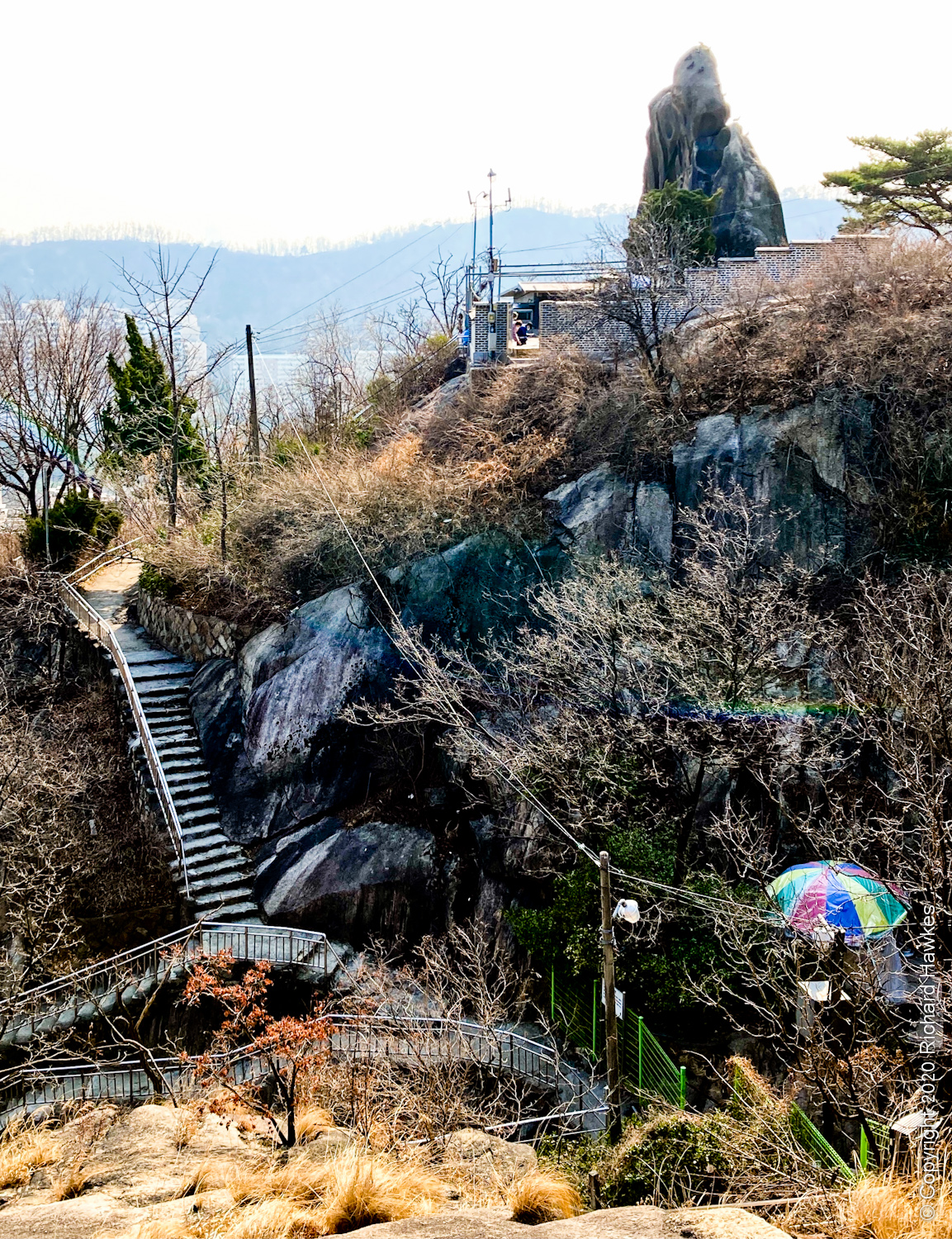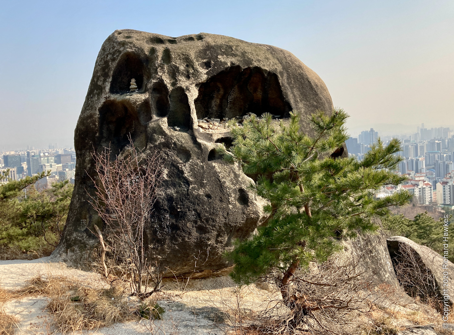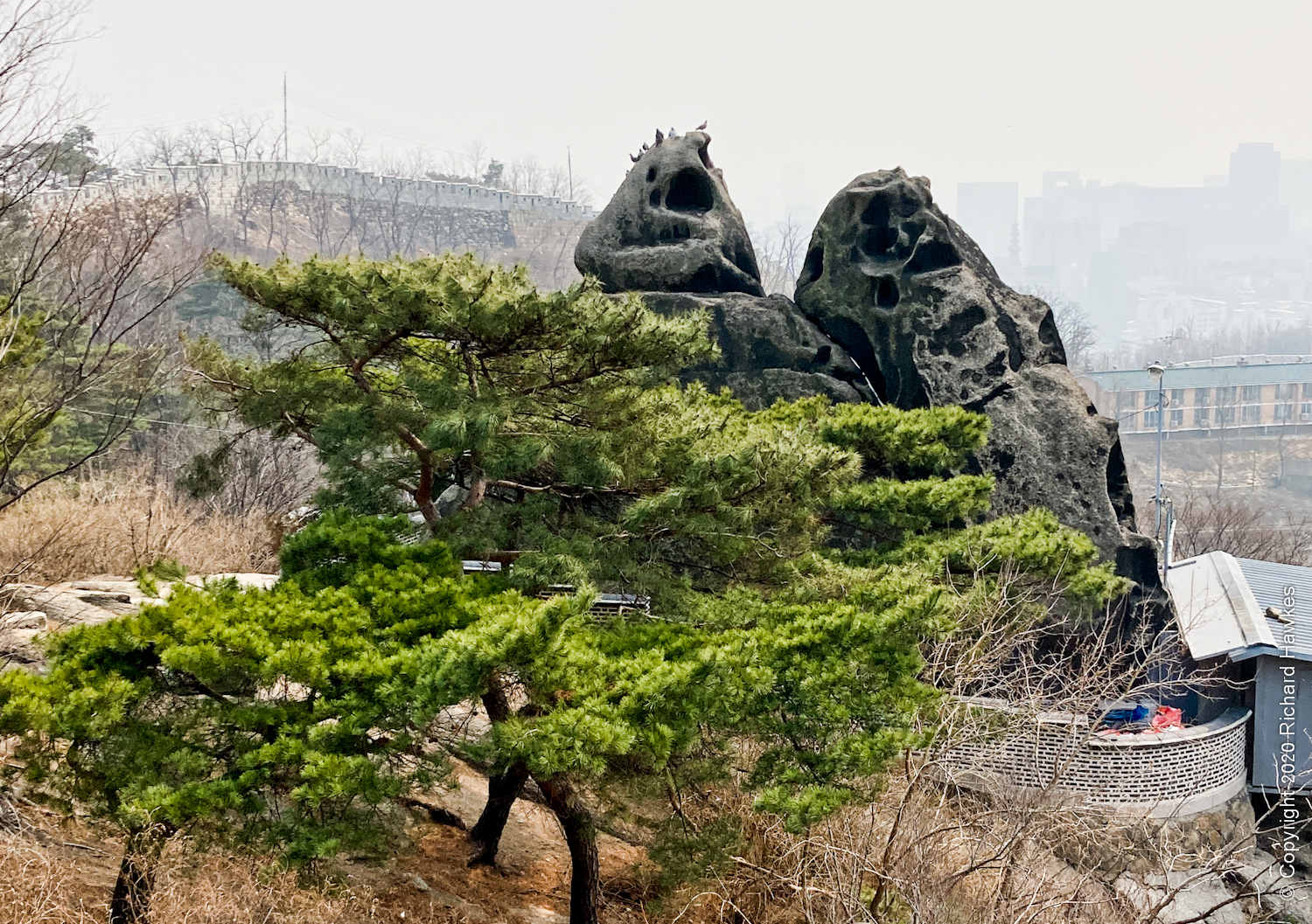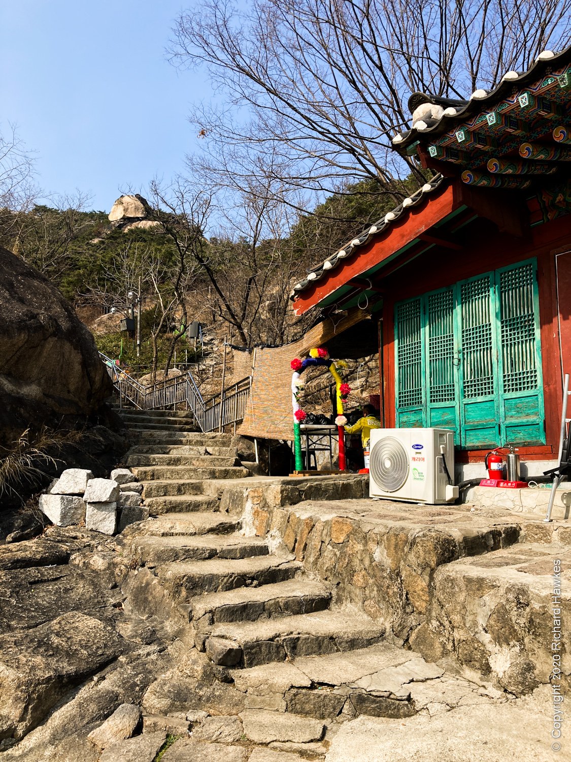 Up the steps there was a temple or music training building where drumming practice noises emerged. A bit further on are some step leading to Seonbawi rock (선바위), a uniquely shaped, pitted black rock with prayer area in front. What was interesting were the larger number of birds just perched on top. Whenever they were disturbed, they’d fly away in unison, circle round, then perch right back where they were. They did this a number of times.