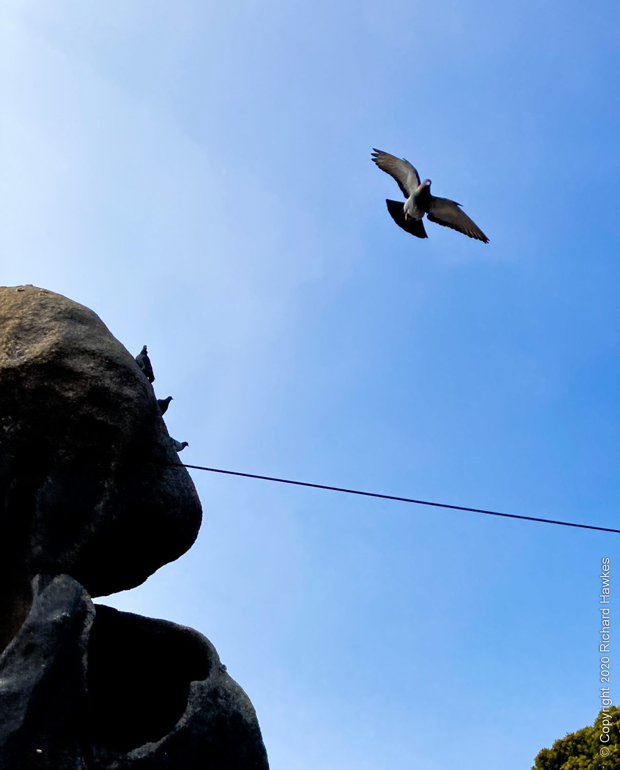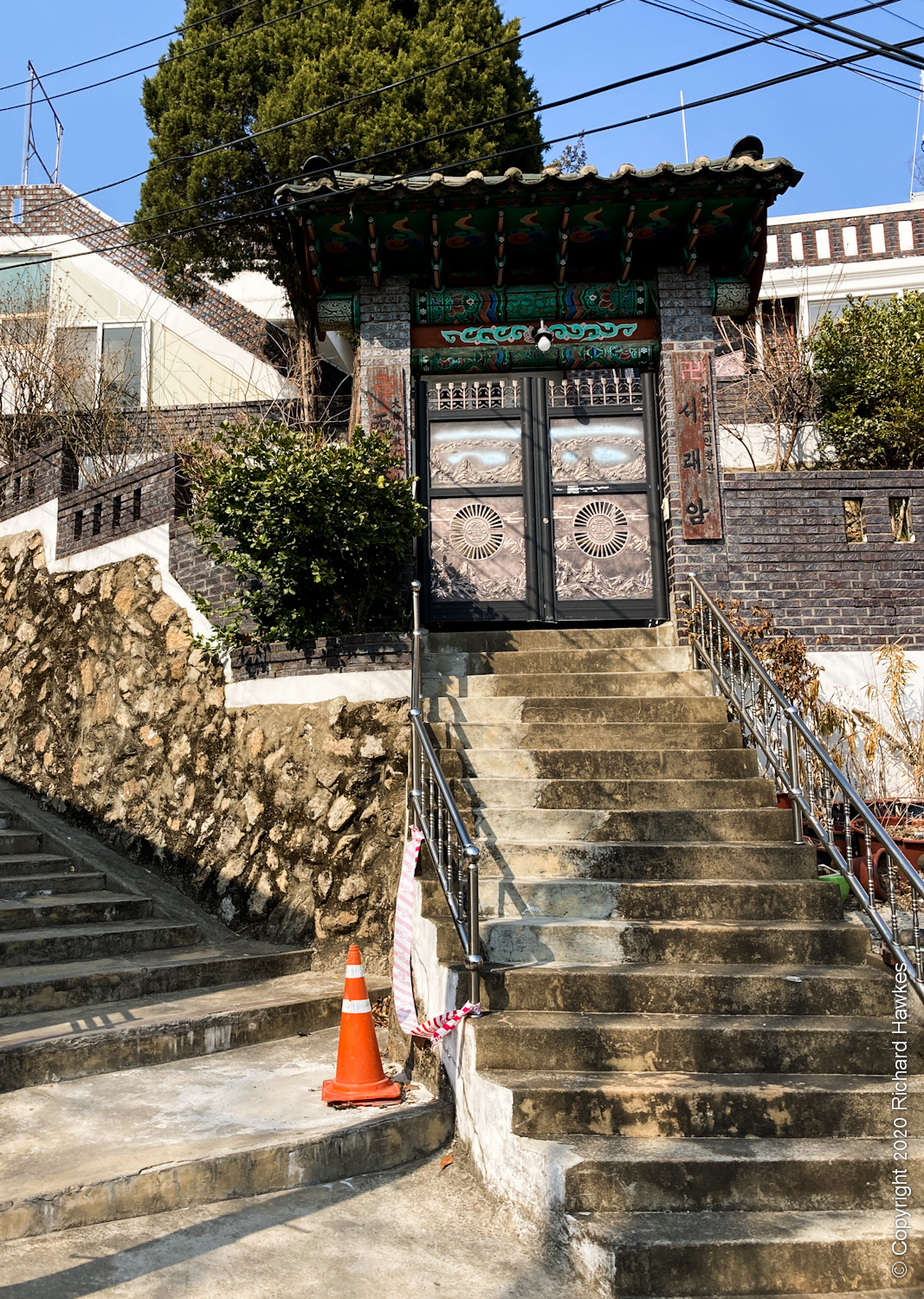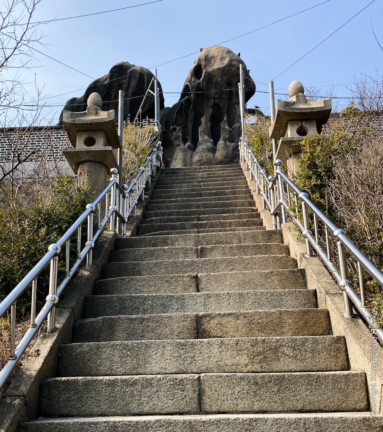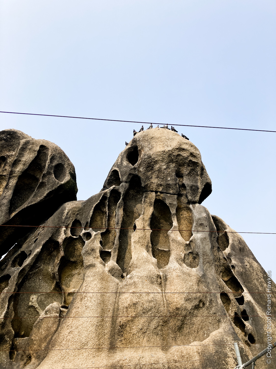 Up the steps there was a temple or music training building where drumming practice noises emerged. A bit further on are some step leading to Seonbawi rock (선바위), a uniquely shaped, pitted black rock with prayer area in front. What was interesting were the larger number of birds just perched on top. Whenever they were disturbed, they’d fly away in unison, circle round, then perch right back where they were. They did this a number of times.