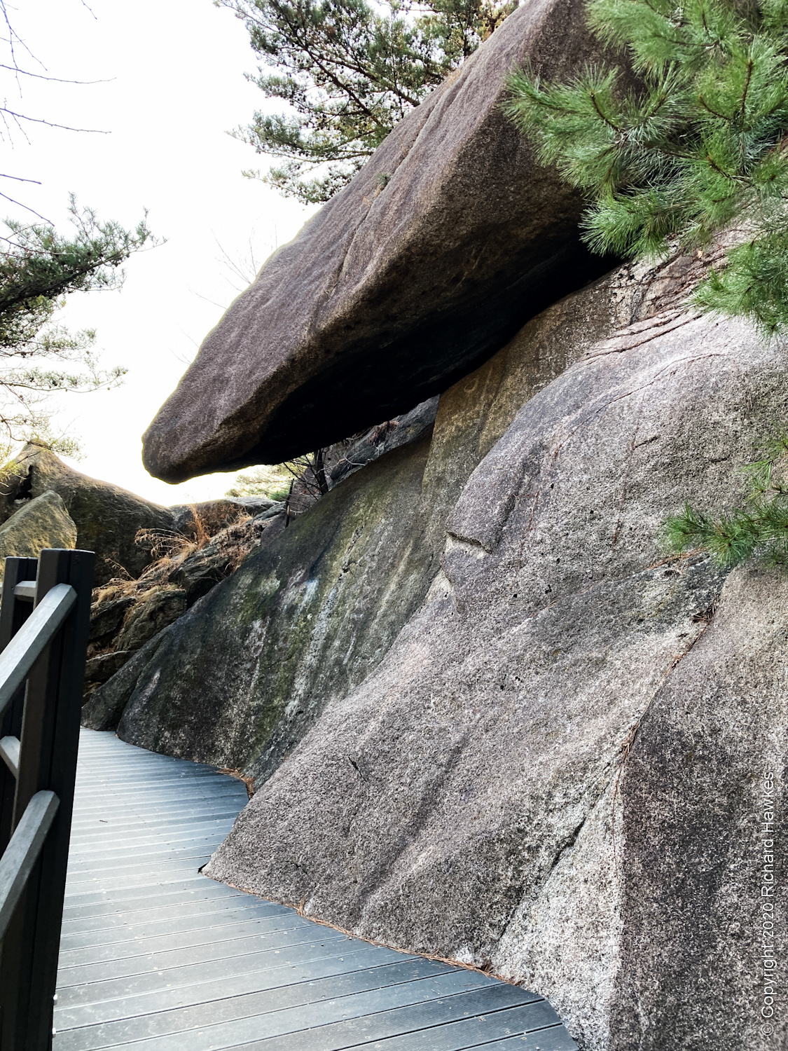 After this, I walked into a forested area that led to more shrine areas. On the way, paths leading up and down and across were apparent, resulting in a cool, crisscrossing of paths. There’s a huge, precariously perched rock that looks about ready to slide onto the next passerby!