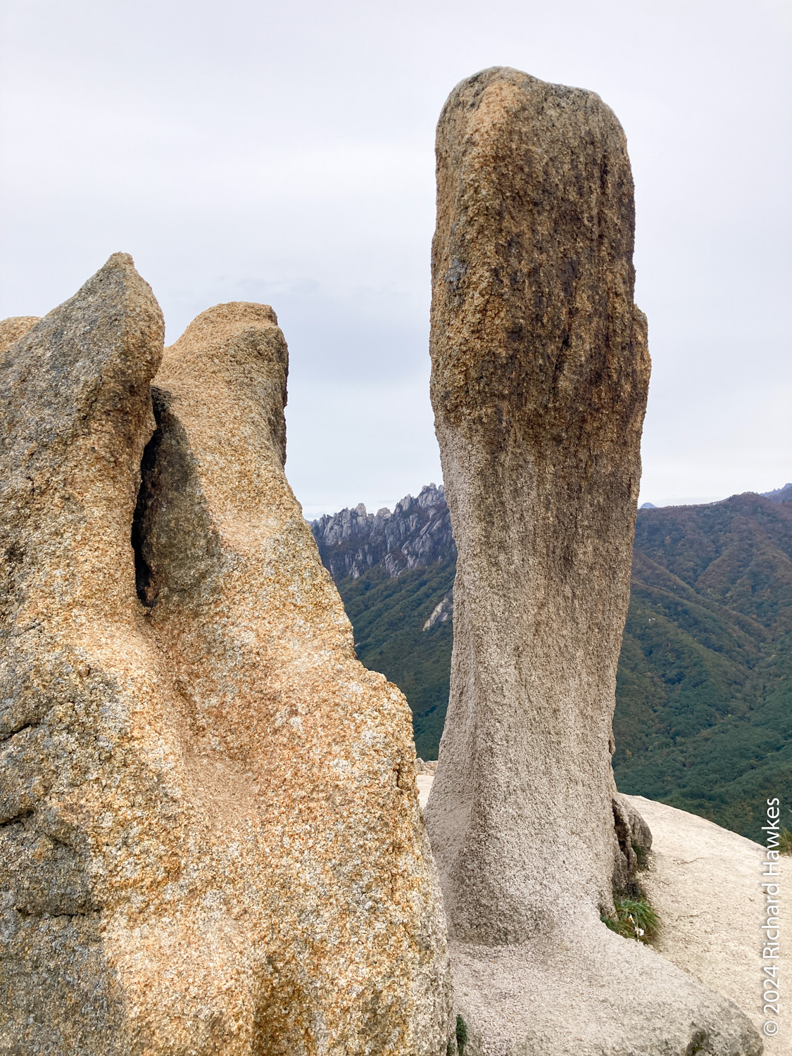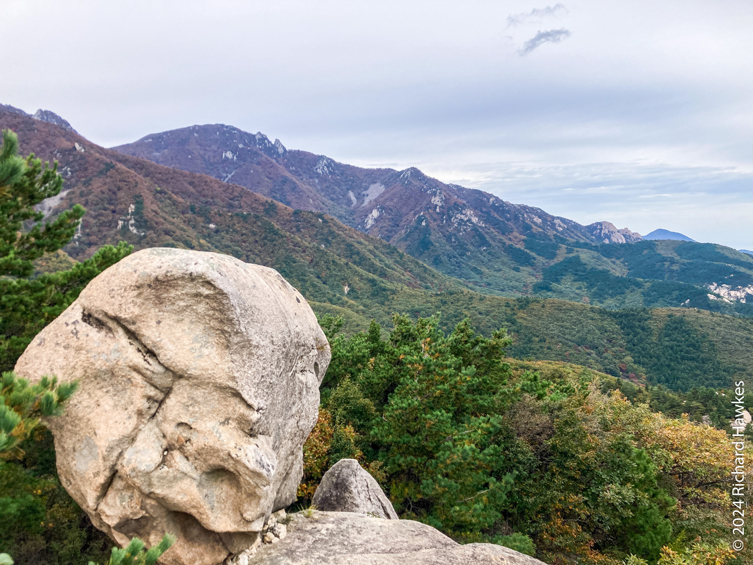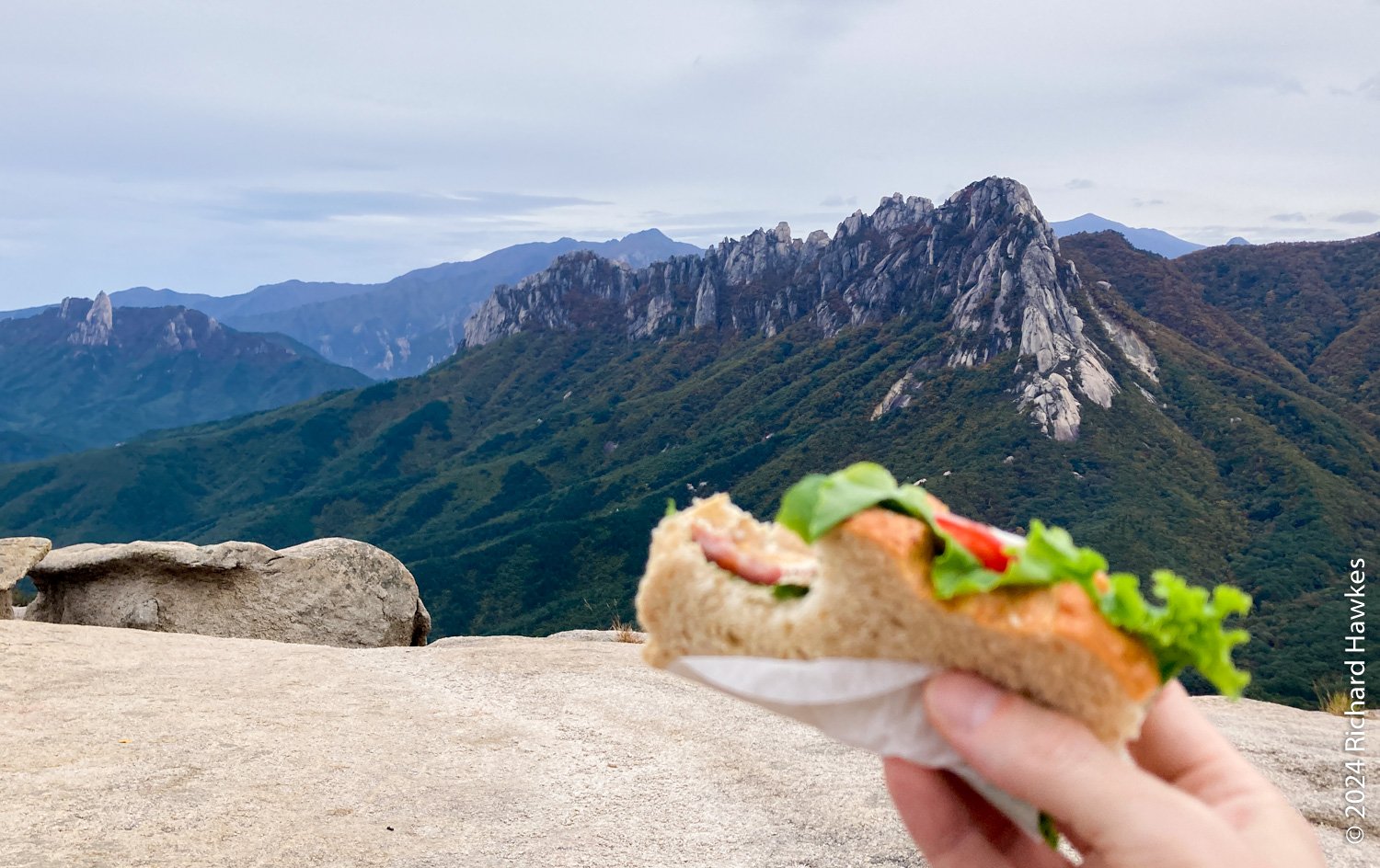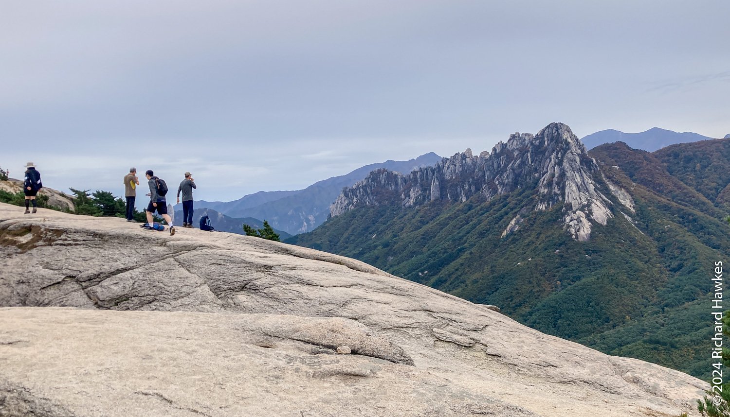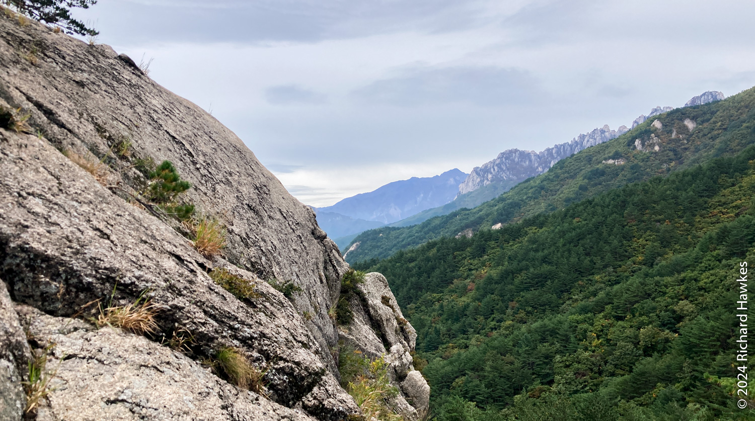 Seongindae (성인대) looks on to Ulsanbawi (울산바위) over a valley. It features a series of wide rocky plateaus with epic views. I went there based on an Instagram post. There’s also Hwaamsa (화암사) temple to explore with it’s views straight down to Sokcho city. This was the day 1 of a five-day trip to Sokcho.