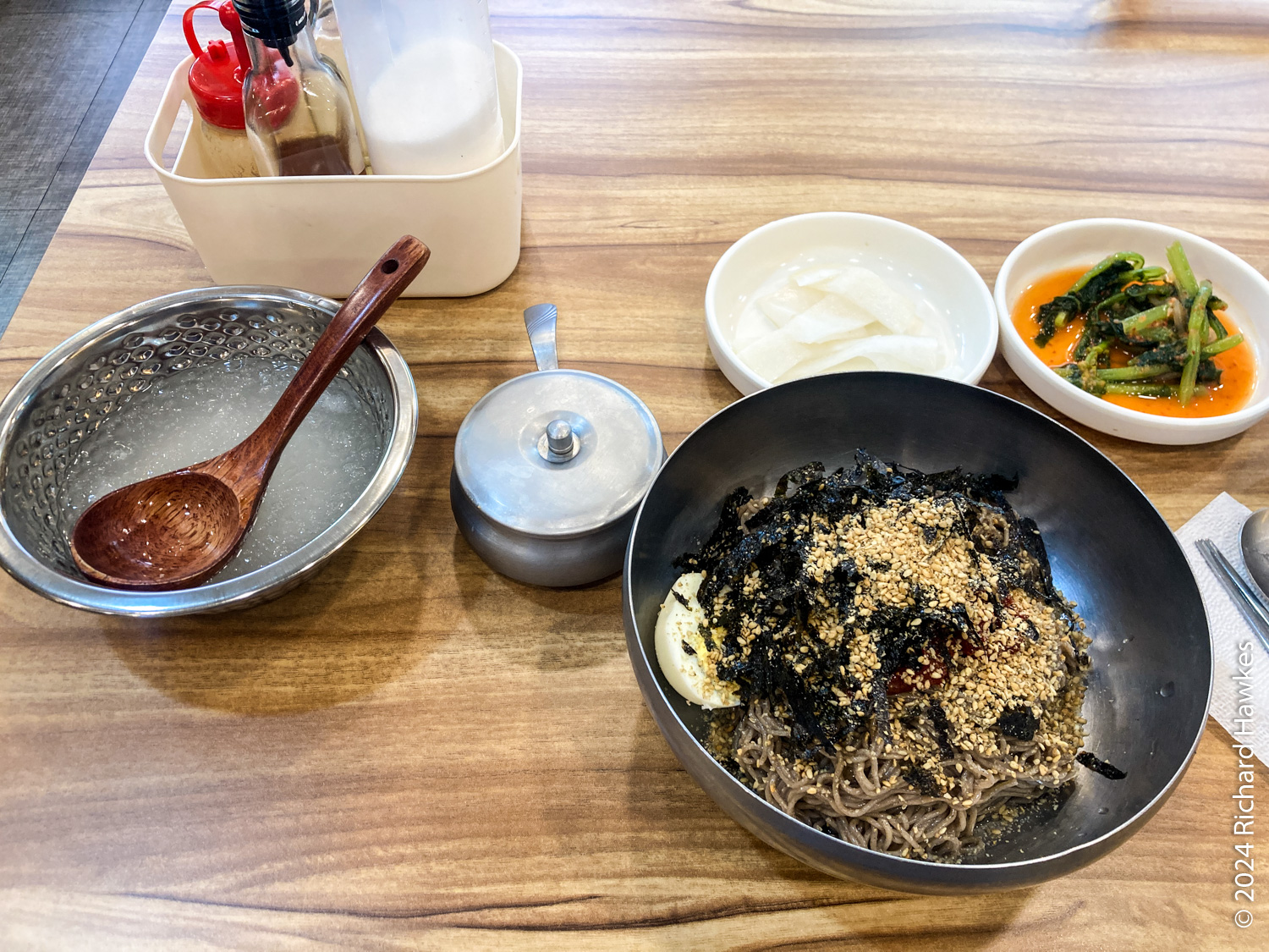 I got the 8:40 bus out from Gosok Terminal, Gyeongbu line station (경부 line), and arrived at 11:30 at Sokcho Gosok Terminal. Then I had to find my SOCAR; this took a while since it was in B3 of a building still being built and fitted out! I drove to get some hiking food (sandwiches and buns from either Paris Baguette or Tous les Jours, then got lunch of local style cold noodles called Makguksu (막국수).