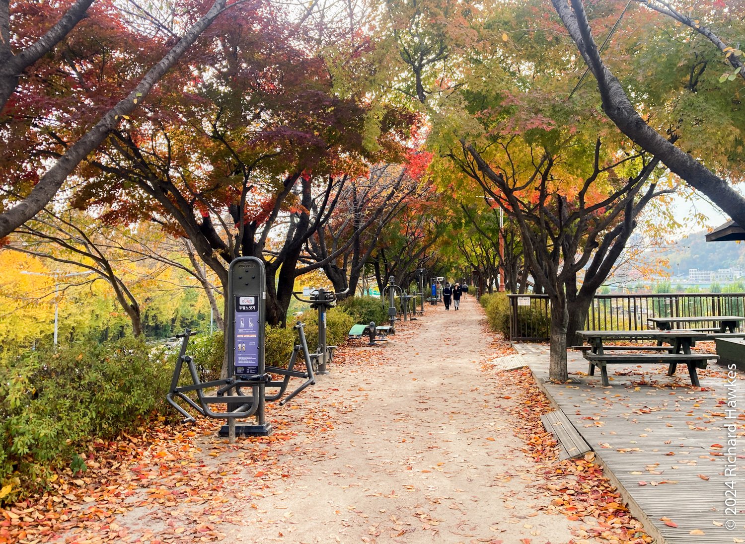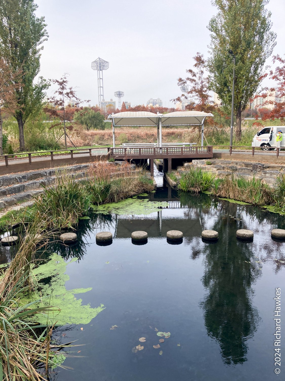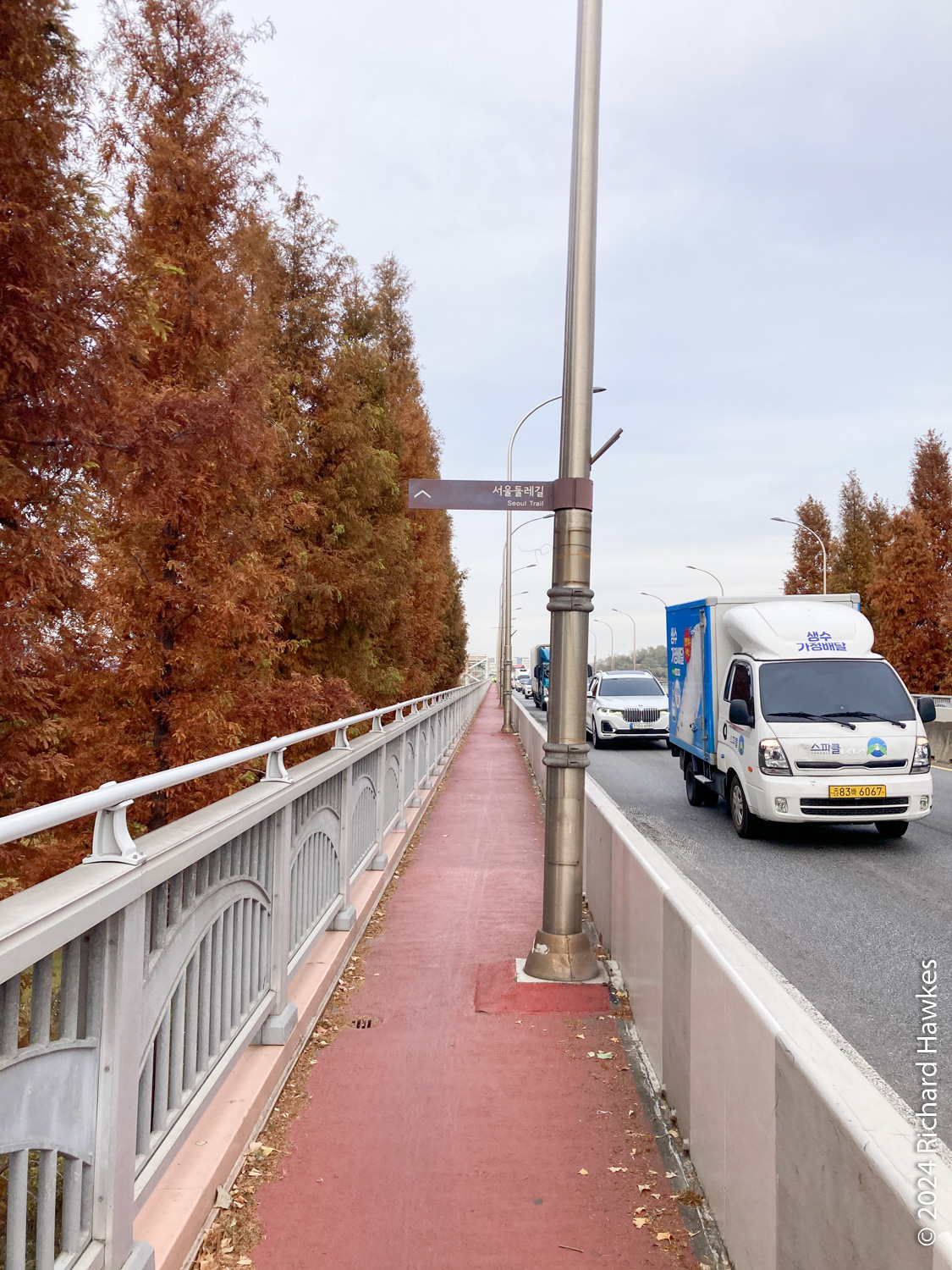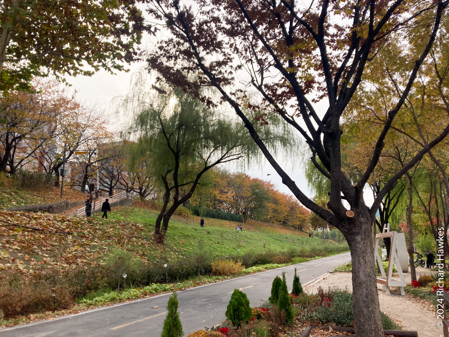 Anyway, now I was in very familiar territory, having ridden along this section many times in the years. It goes past Nanji Park and campsite, the public outside pool I found this year and into the parks near Sangam and the World Cup stadium. At the parks, you walk amongst beautiful metasequoia trees for ages. At the end of autumn, the change from bright yellow to a deeper reddish, ginger colour. Out of the parks and you walk around an art and culture place built into a set of disused industrial storage tanks. Quite and interesting place I’d visited before, so I didn’t stay, just walk through.
