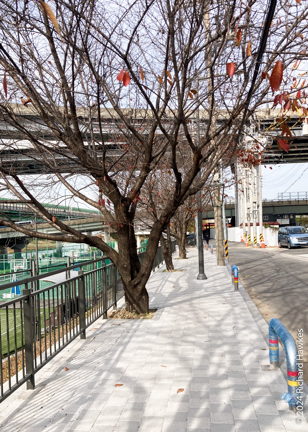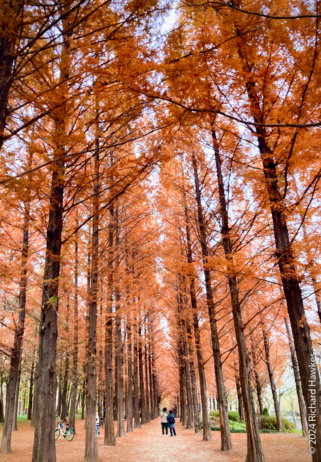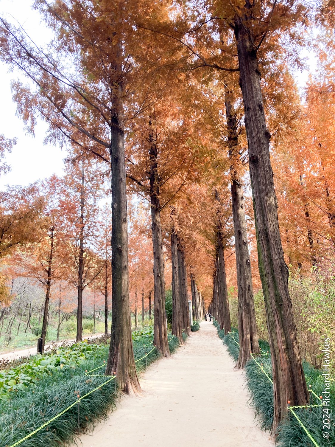 Anyway, now I was in very familiar territory, having ridden along this section many times in the years. It goes past Nanji Park and campsite, the public outside pool I found this year and into the parks near Sangam and the World Cup stadium. At the parks, you walk amongst beautiful metasequoia trees for ages. At the end of autumn, the change from bright yellow to a deeper reddish, ginger colour. Out of the parks and you walk around an art and culture place built into a set of disused industrial storage tanks. Quite and interesting place I’d visited before, so I didn’t stay, just walk through.