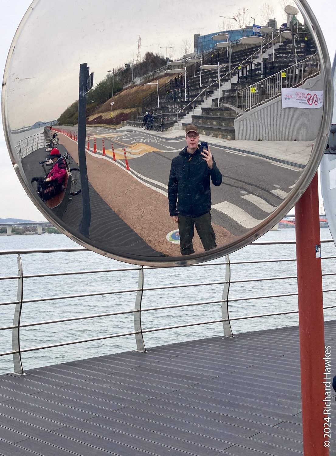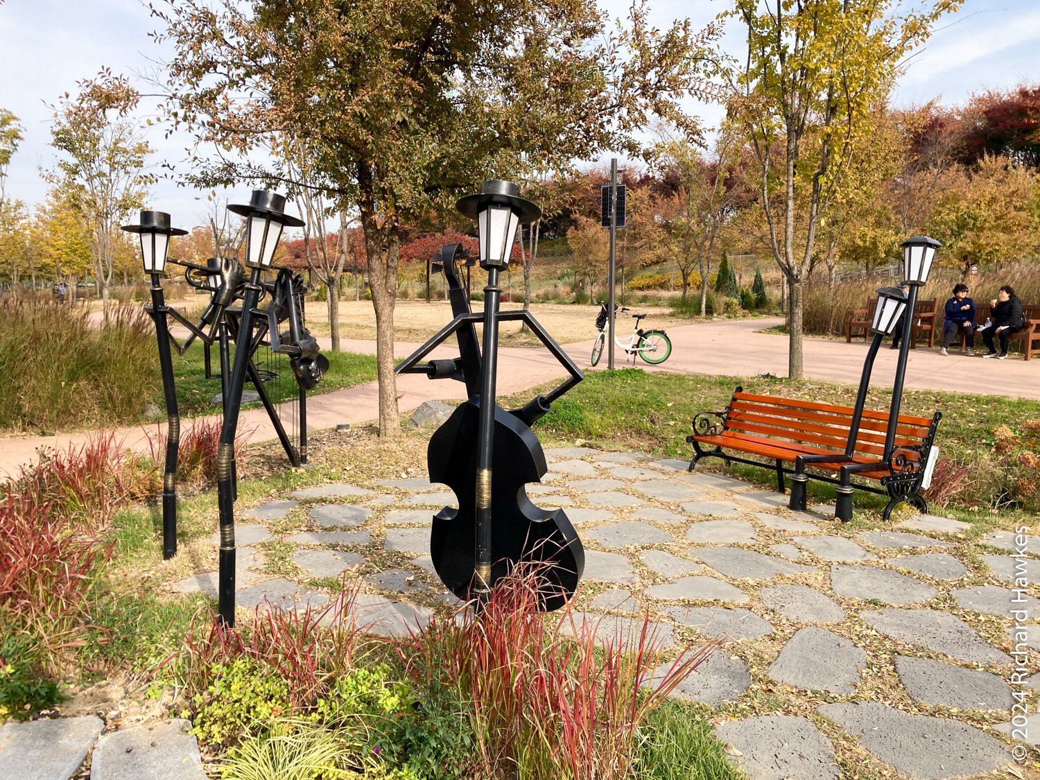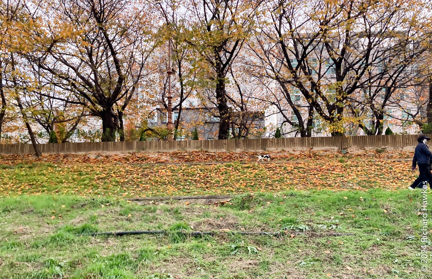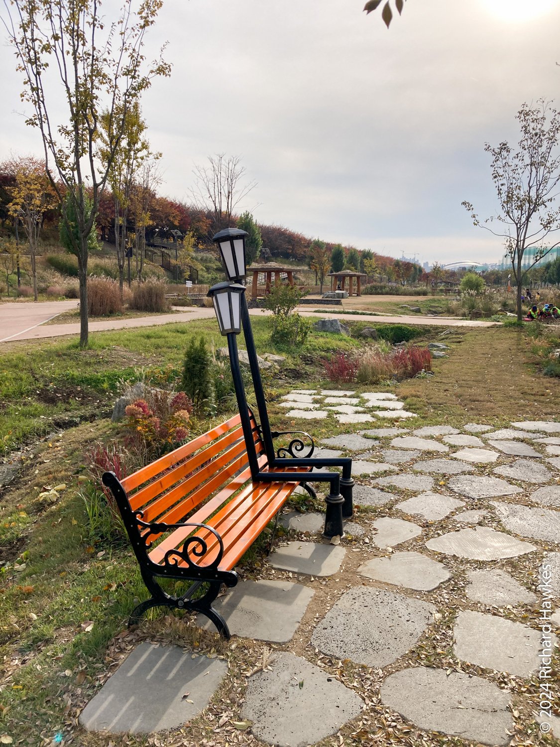 Anyway, now I was in very familiar territory, having ridden along this section many times in the years. It goes past Nanji Park and campsite, the public outside pool I found this year and into the parks near Sangam and the World Cup stadium. At the parks, you walk amongst beautiful metasequoia trees for ages. At the end of autumn, the change from bright yellow to a deeper reddish, ginger colour. Out of the parks and you walk around an art and culture place built into a set of disused industrial storage tanks. Quite and interesting place I’d visited before, so I didn’t stay, just walk through.