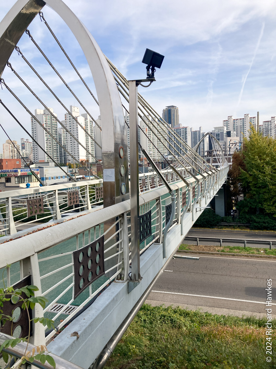 This would be my last section of the day. It would end up at Jeungsan Station, near my home, so great! No long subway and bus ride to do! You go over the long bridge and can take an elevator down to continue the trail. The elevator was out of service though, so had to clumsily wheel my city bike down the winding stairs…