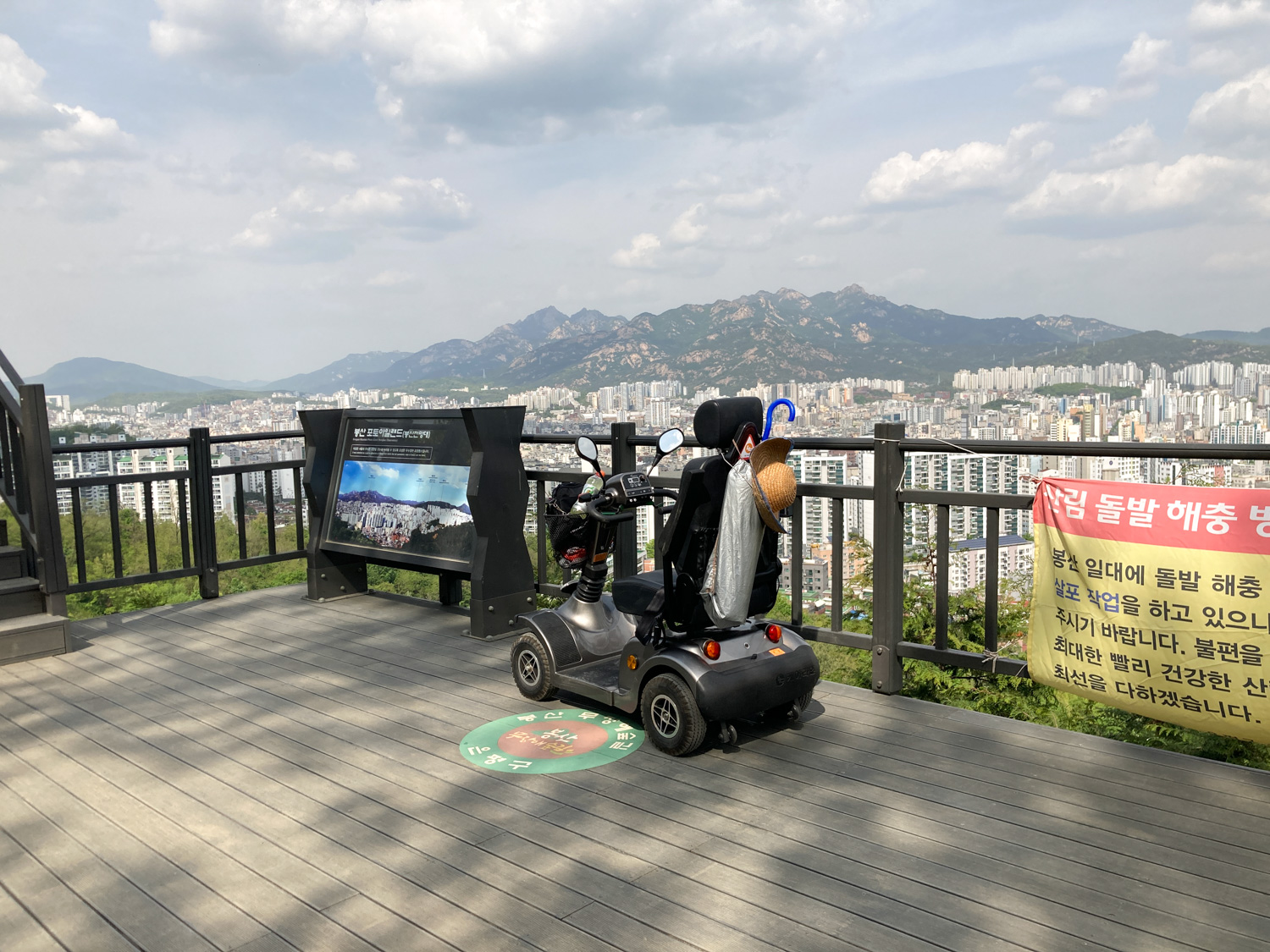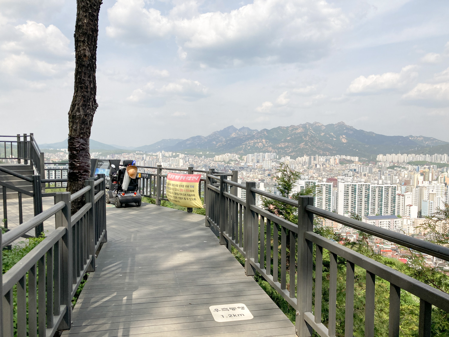 The trail starts from near Gate 3 of Jeungsan Station on Line 6 and goes north west through a residential area. Then you go through a park and exercise area then forest before you get onto the ridge of Bongsan Mountain. The ridge is forested and popular with locals. There are sections just off the Seoul Trail that are relatively new wooden walkways; these run from the base and zig-zag up to the viewpoints at the top. The most impressive thing is that there are NO steps, only rampway: wheelchair access all the way! The wooden decking and views to Bukhansan are quite cool.