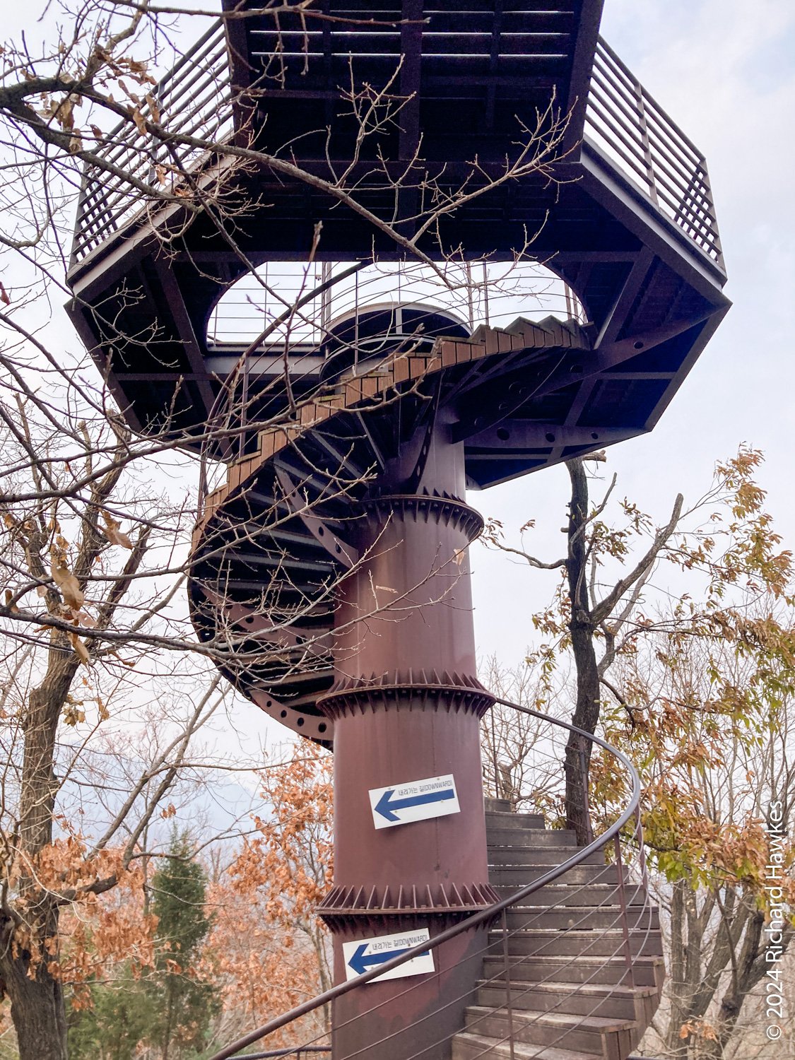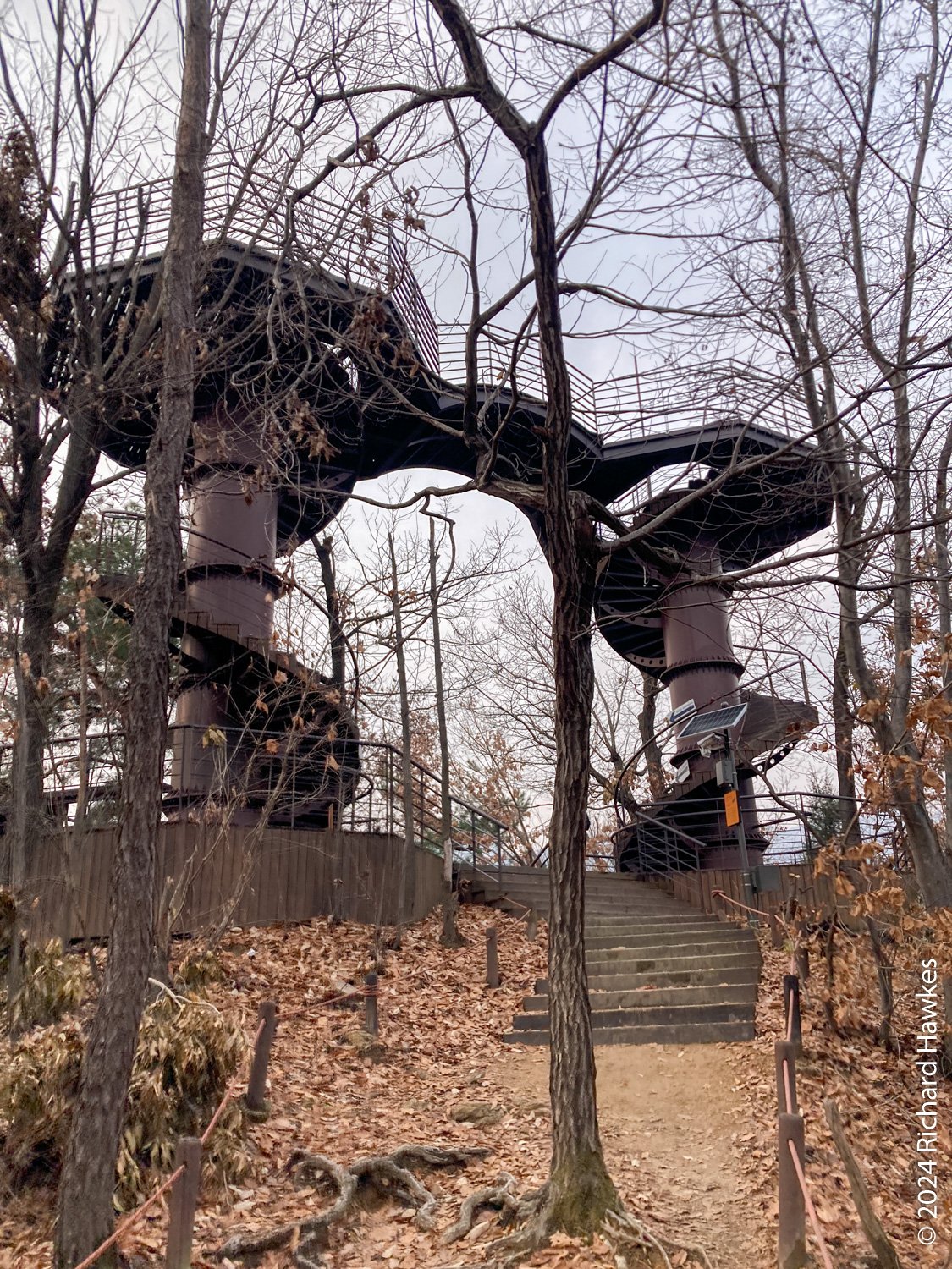 The trail now goes off road and is forested most of the way. The hill were quite moderate, no big inclines. The trees are mostly bare now and the leaves are thick on the ground. About half way, you come across an observation tower you can go up to see around. It’s a double tower linked by a little walkway. From there, saw how hazy the air was today.