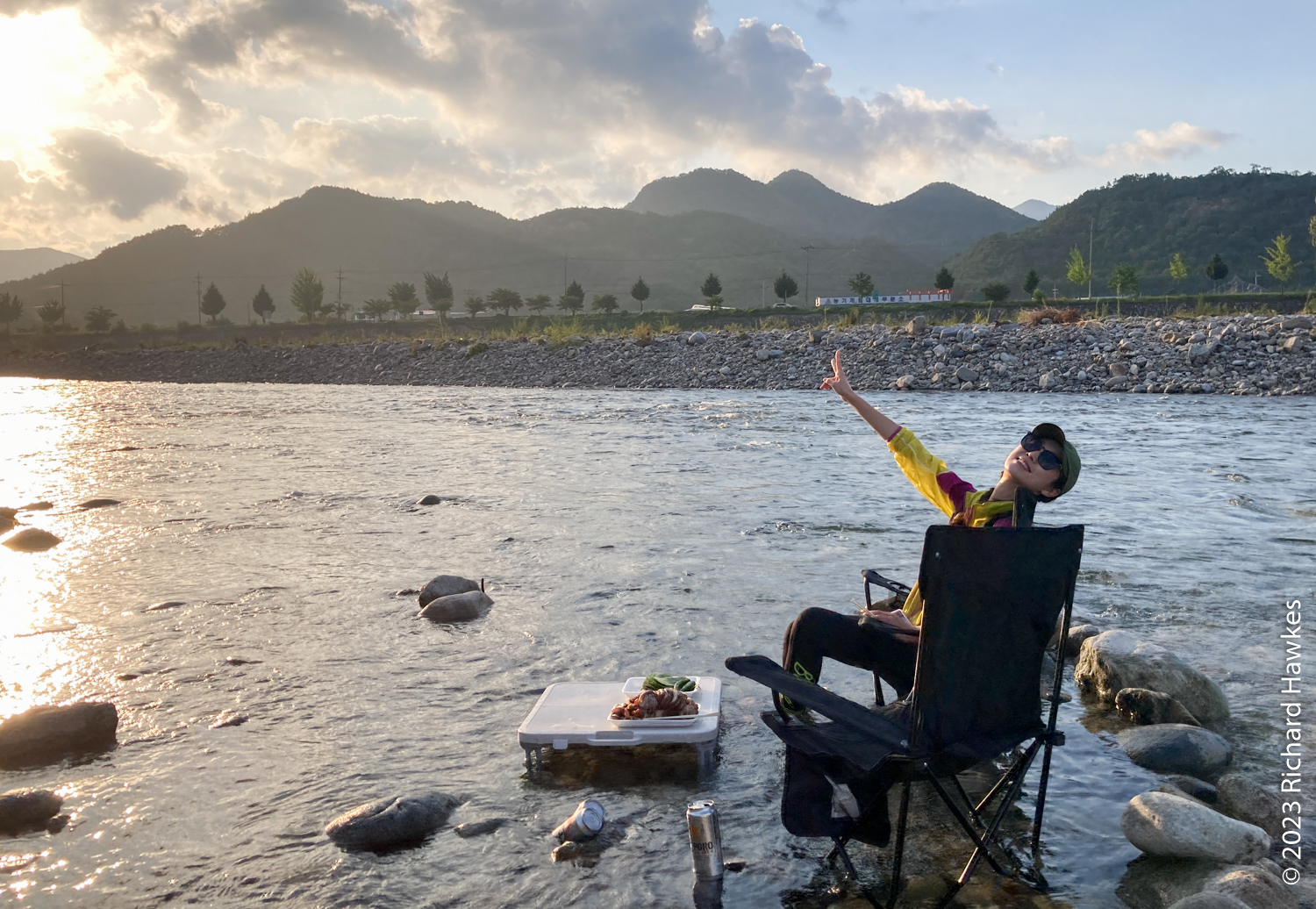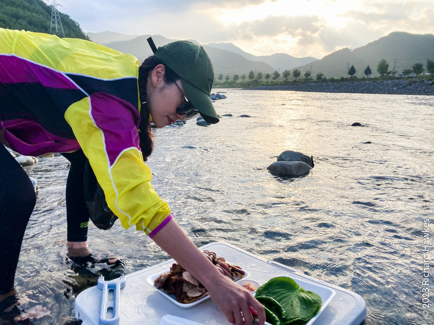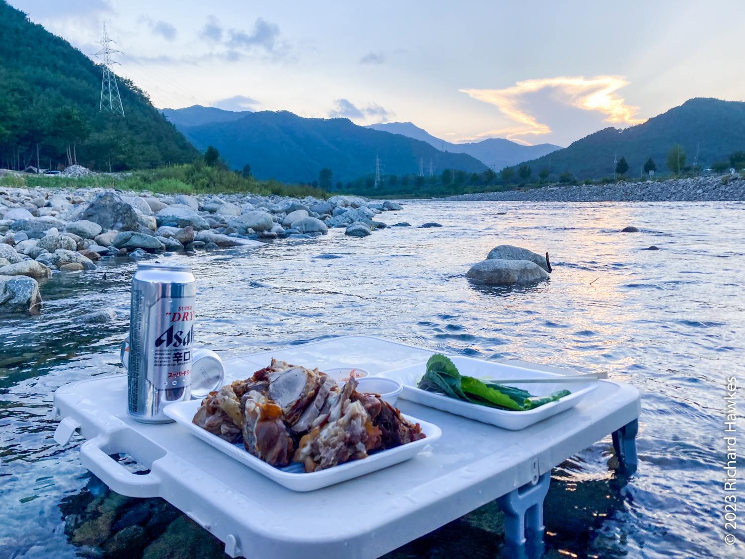 In the town of Wondeokeup, we bought beers and some bossam (steamed pork) and some fried chicken to take back to the campsite. We set up our plastic table and camping chairs out in the shallow stream and ate and drank as the sun got lower. Lovely evening! Later, we drank some plum wine next to the tent before showering and heading to bed.
