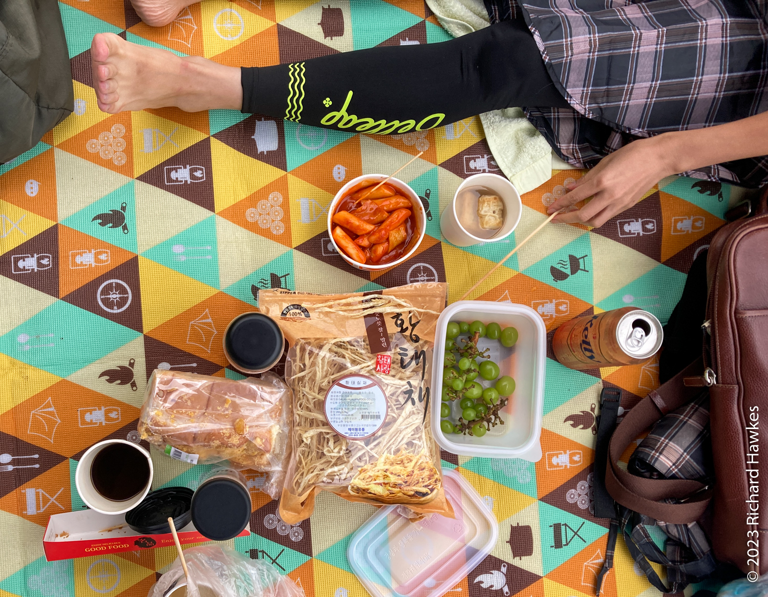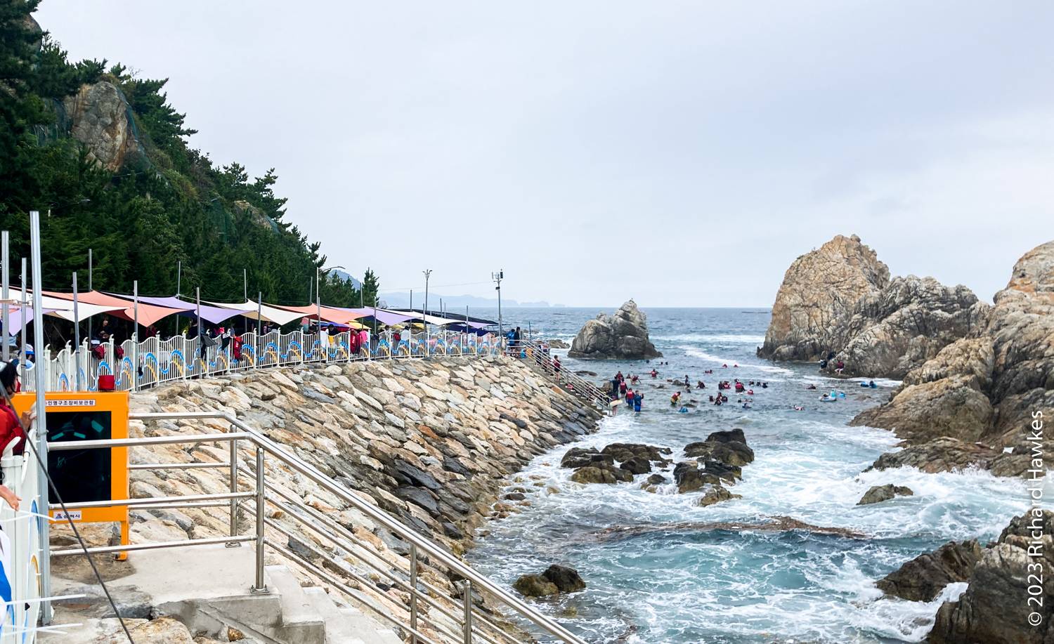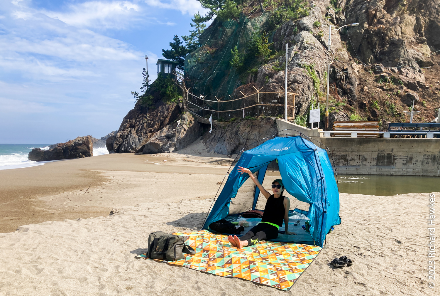 We snorkelled at Janghohang Harbour, then visited Gopohang Beach, a sandy beach with extremely aggressive waves. We finished with a lovely meal sitting in the steam by our tent. This was the second day of me and Romana’s seven-day road trip to the east coast.