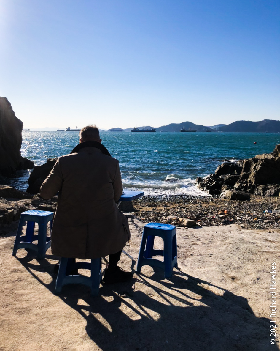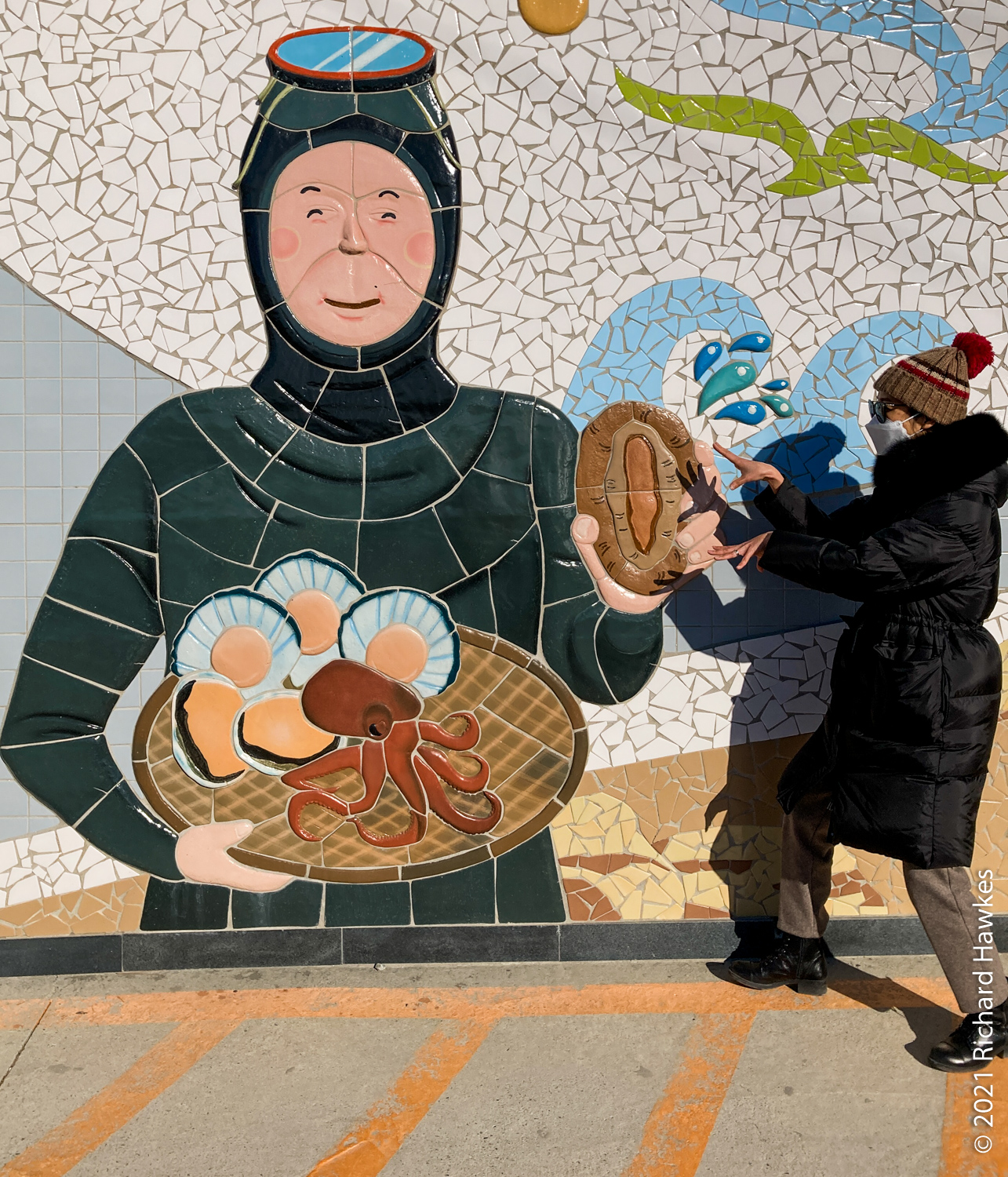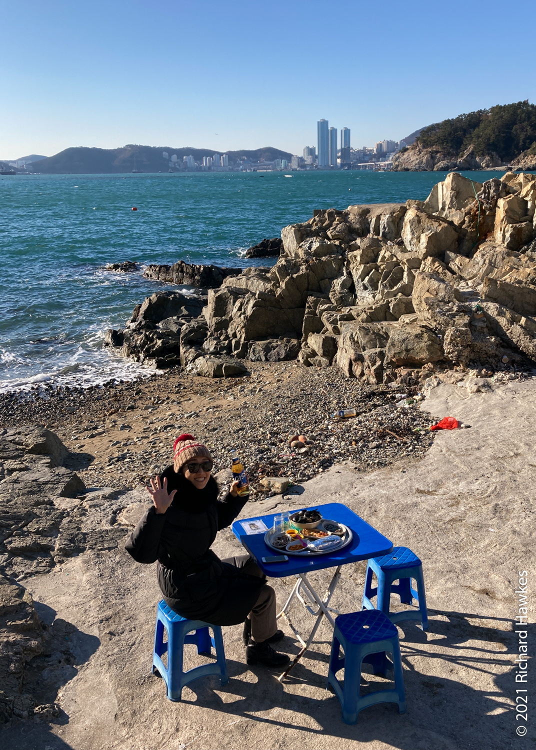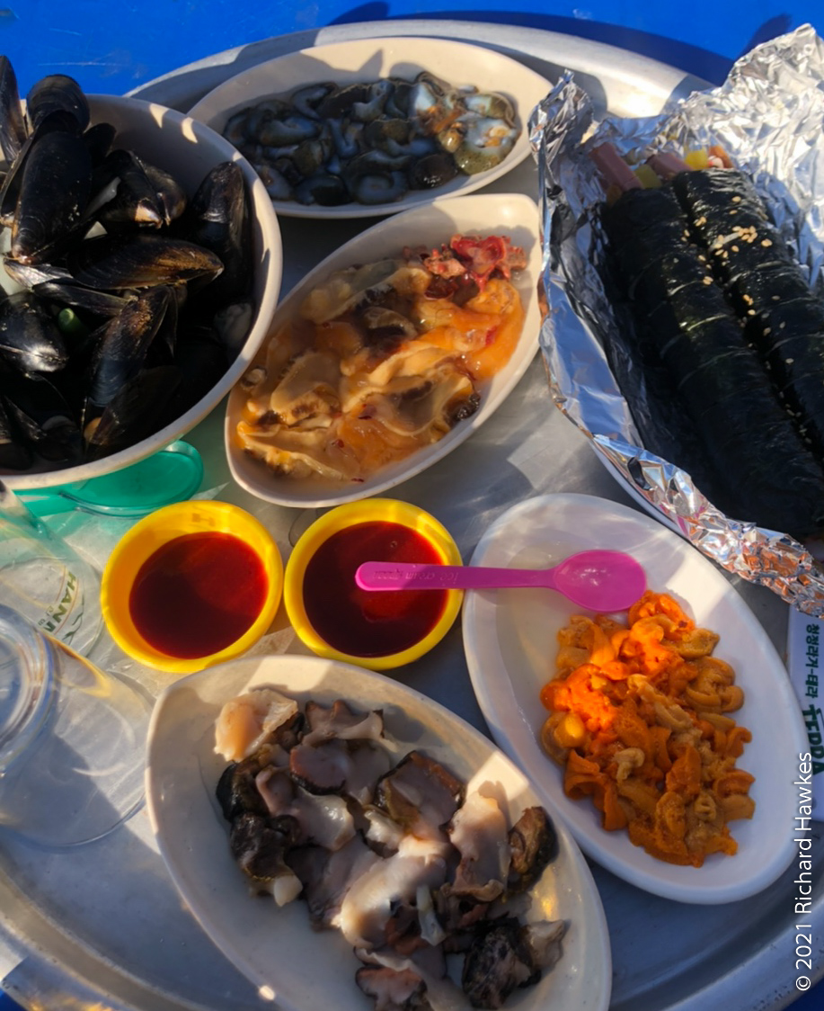 With our bags, we got on a red bus direct to Busan Station. The trip is just over an hour. We stashed the suitcase at the subway station lockers then took another bus to Yeongdo (영도) for seafood. We’d been to this island before for seafood on the rocky coast underneath Yeongdo lighthouse in the winter of 2012. This time, Romana had found another place to try on the west side of the island, called Haenyeochon (해녀촌). This is a place where (traditionally) woman seafood divers (Haenyeo 해녀) go fishing and sell their wares! I suppose the are has been modernised a little as they seemed to be operating from a new building by the sea rather than from tent. Also, I don’t know if the woman here were the actual haenyeo or just preppers and sellers; perhaps they fish in the mornings and sell in the afternoons. In any case, we saw quite a few haenyeo working on our seaside walks yesterday.