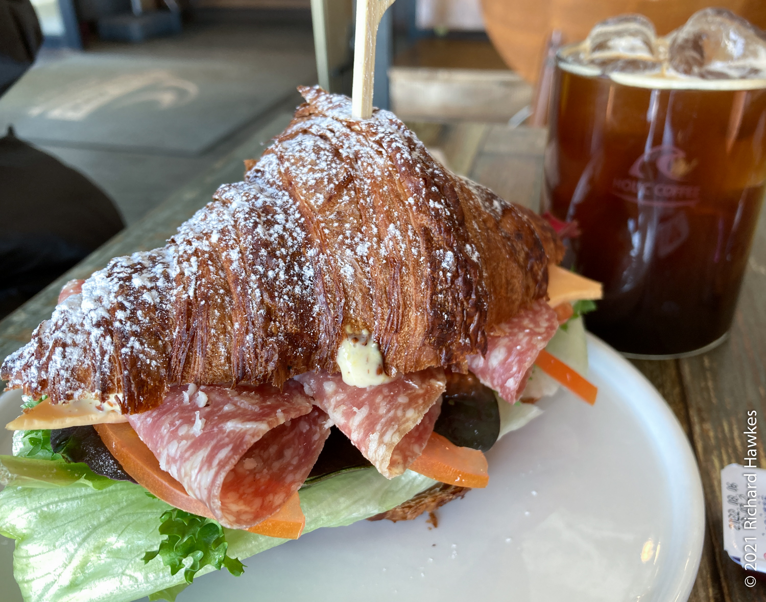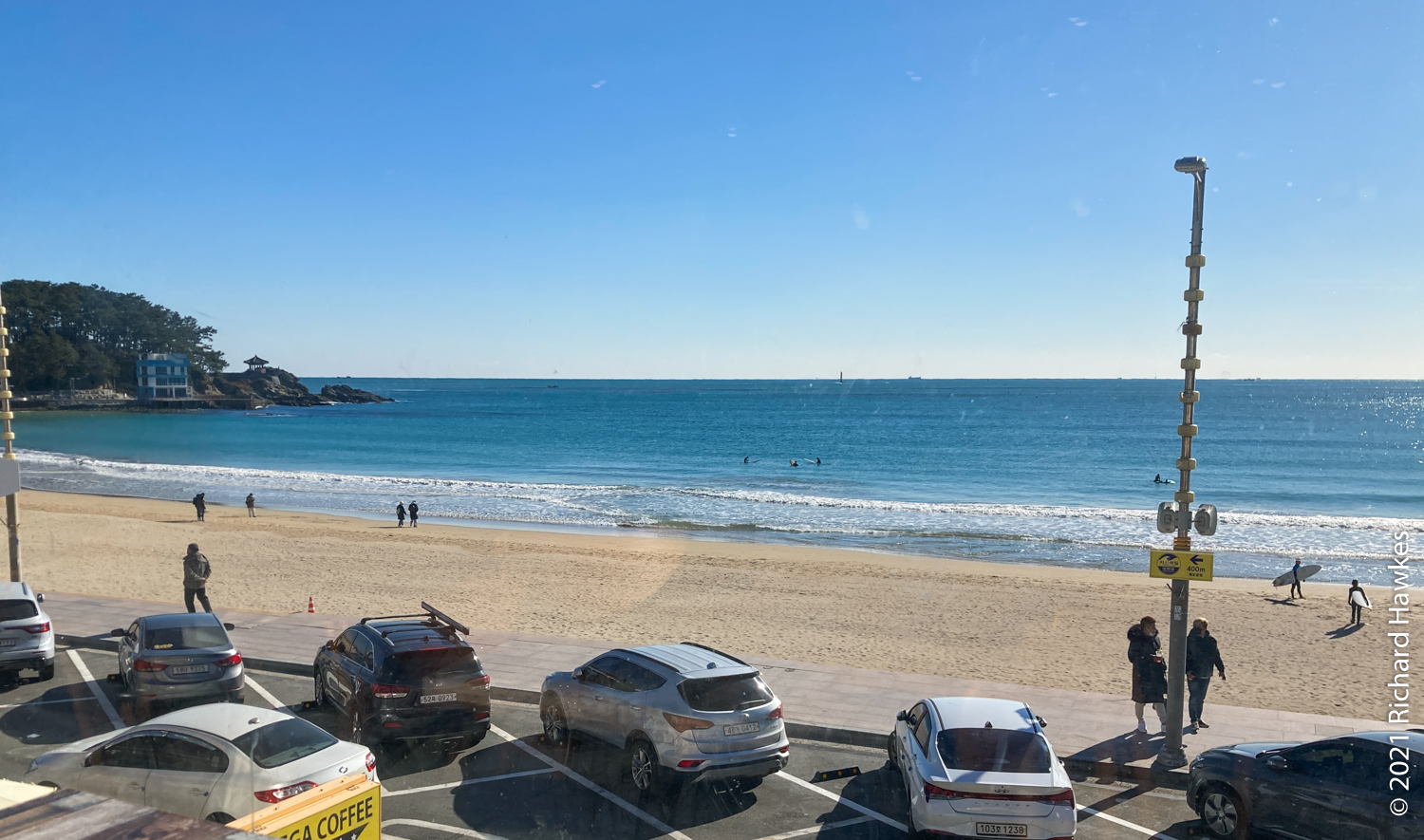 At about 10:30 on the last day, we strolled along to Surfholic (서프홀릭), a beachfront surf school with a cafe and bar (this is my second time here). We got croissants and coffee and watched the December surfers. I came here last month on my solo trip. Next time down here, we’ll try some surfing and then some beers in the bar; they have a craft beer on tap.