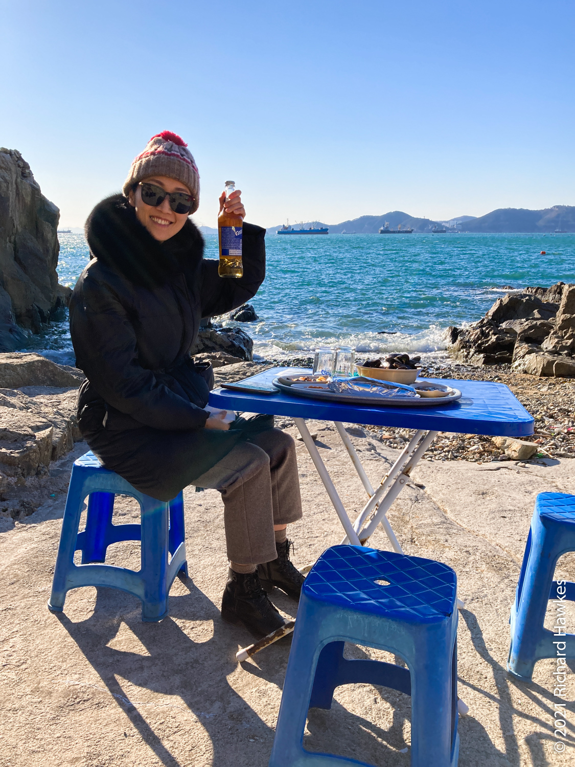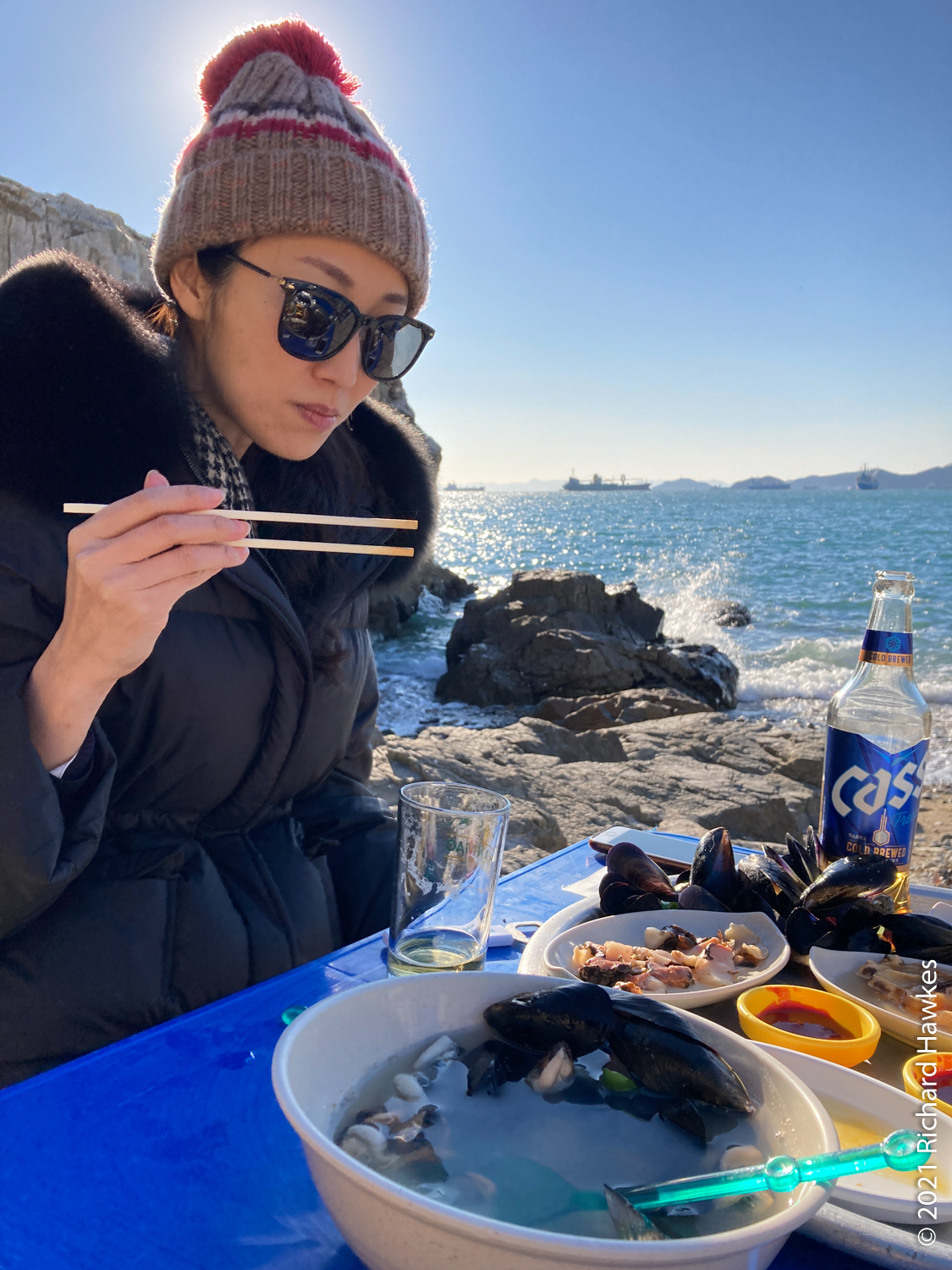 At Haenyeochon, you order your food at the building then walk (carefully) down to the rocky coast, set upi your own plastic table then eat! We set up right by the sea as you can see… I’m not a huge fan of the weird looking seafood like sea cucumbers and slimy innards, so I mainly had mussel soup! However the woman in the building recommended topping the kimbap with the orange sea urchin; this seems to be a nice way to enjoy sea urchin! This, with a few beers looking out to sea on this clear day was very nice. It also wasn’t that cold or windy which helped!
