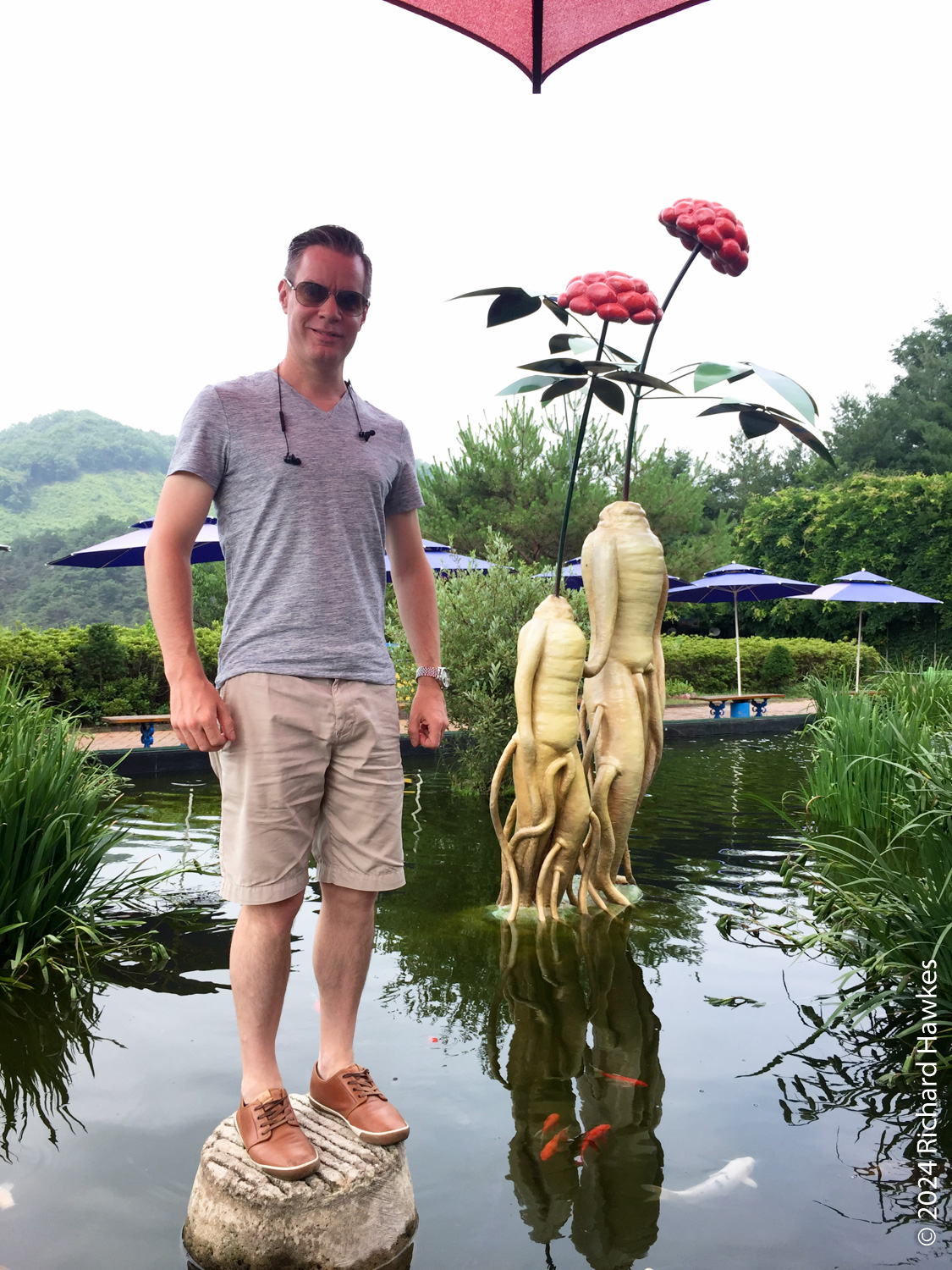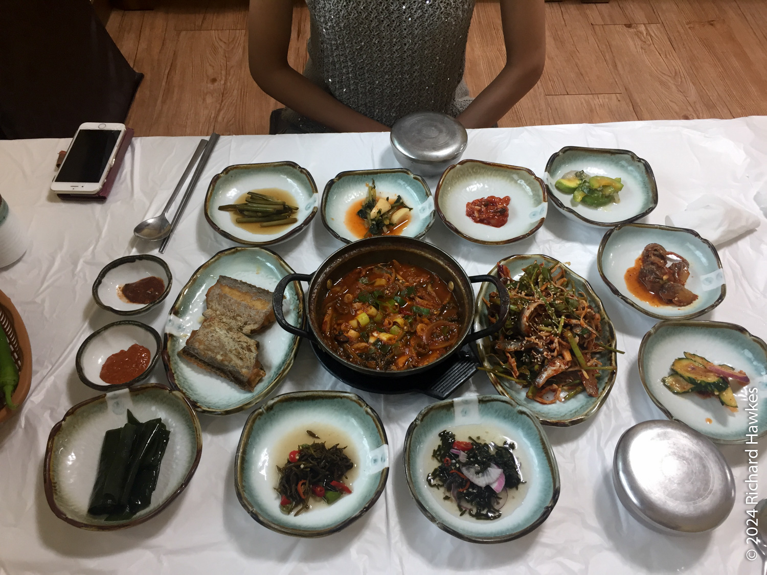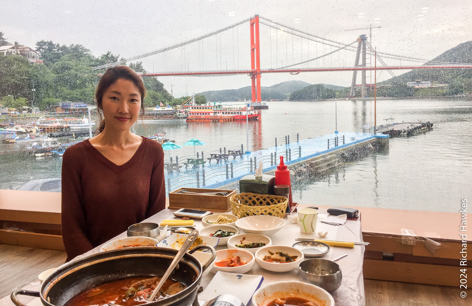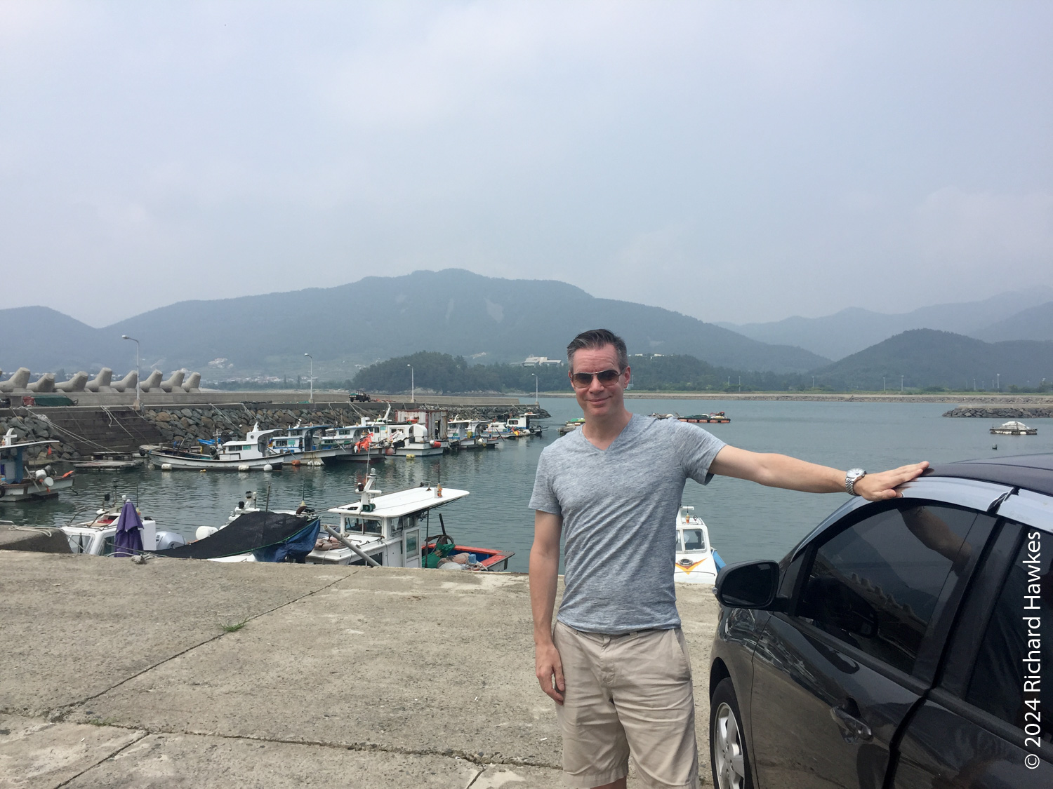 After leaving the temple, we stopped at a reservoir. Then we headed north to get lunch. On the way, we dropped by an odd museum in a huge rundown house full of what seemed like random objects; no idea what it was called either, only that it was on the east coast (I’ve checked using the location info on the photo; it’s now a glamping campsite so they must have torn everything down!). There’s an area near the western bridge with a lot of restaurants that Romana found. Yujin Sashimi (유진횟집) raw fish restaurant was on the second floor looking out to the harbour and the old style navy boats. The sashimi was as expected, featuring mainly skate. We enjoyed the view and food before heading back to the pension.