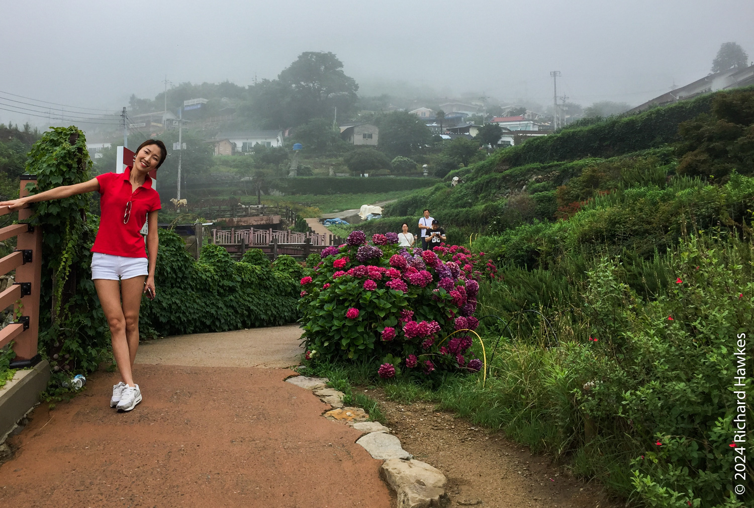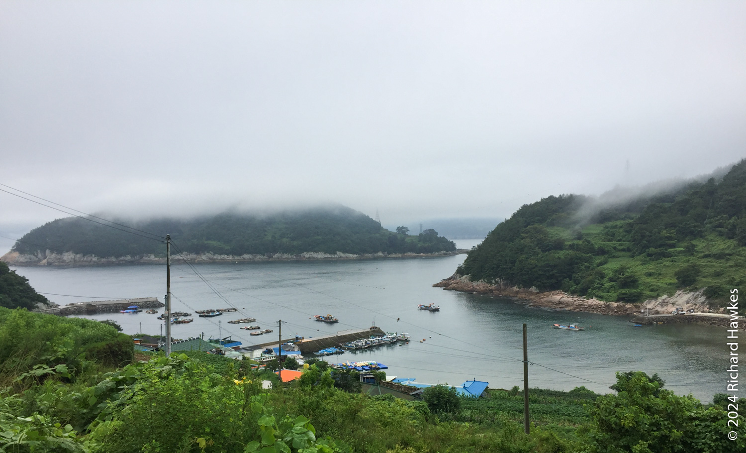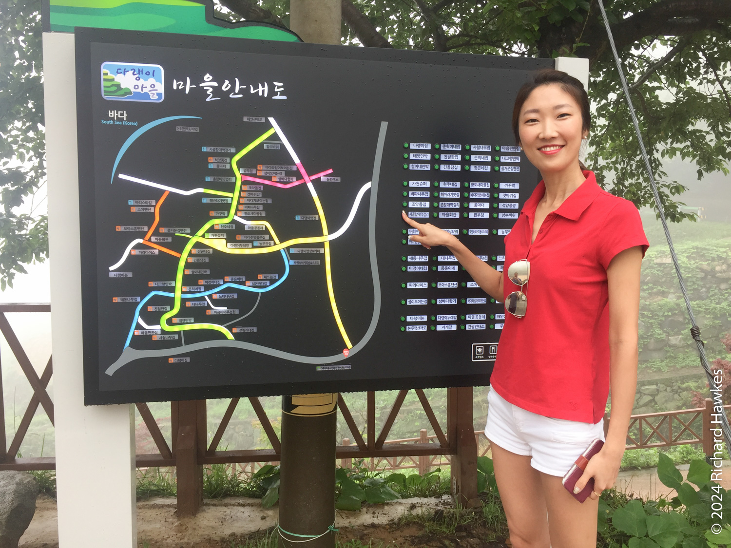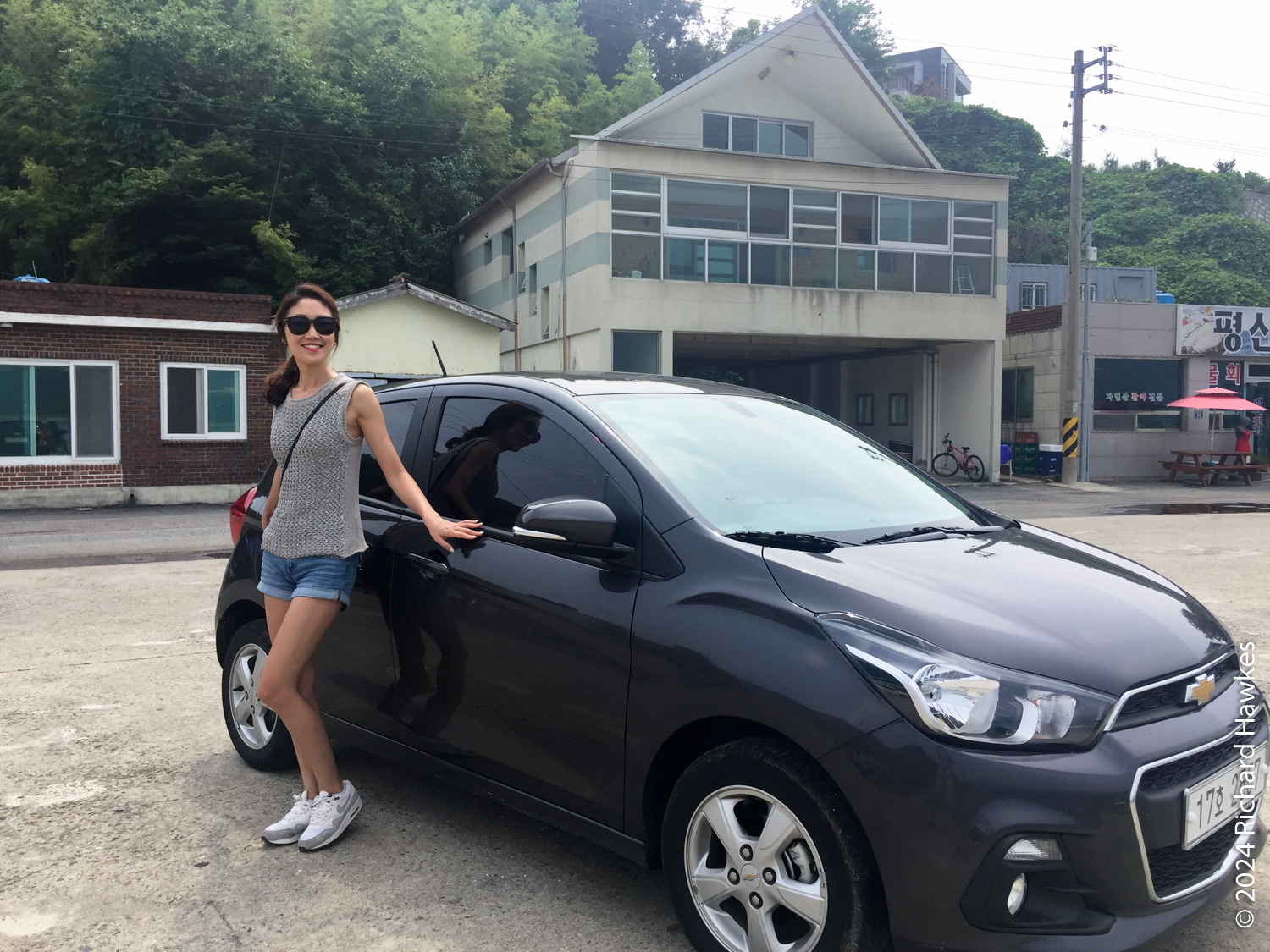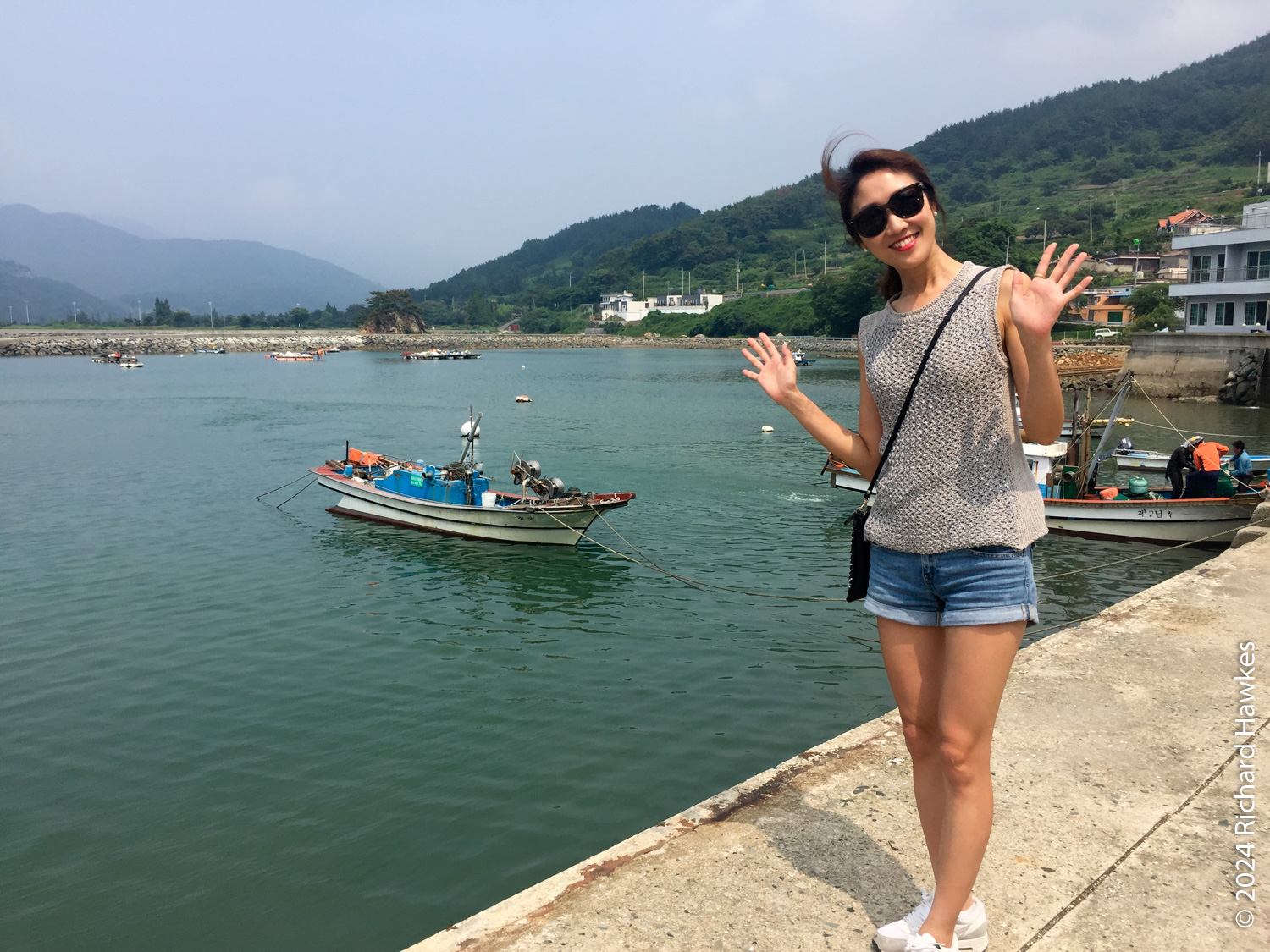 We drove from town south and east. There were lovely lush green fields on the way where we stopped for photos. Next, we stopped at a harbour area on the east called Pyeongsan. After that we drove west then up through the middle part of the island, the west again to Jigokhang harbour area where we had lunch at Anchovy and Kalchi and Hello (멸치랑칼치 and hello.).