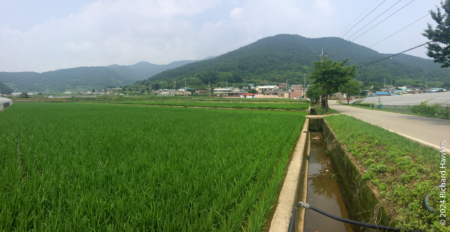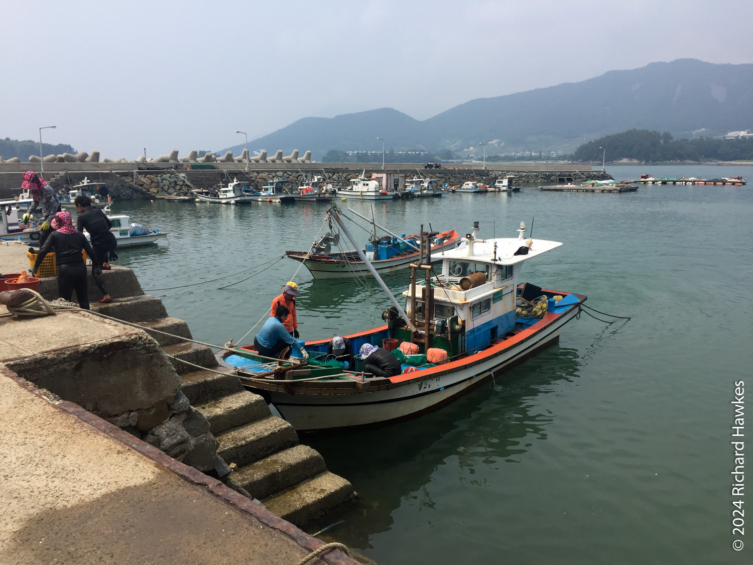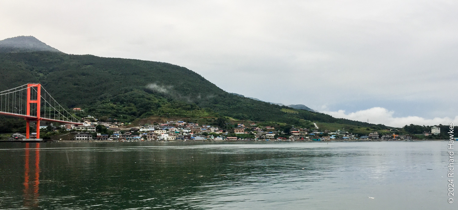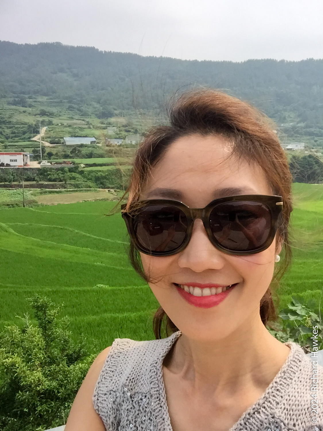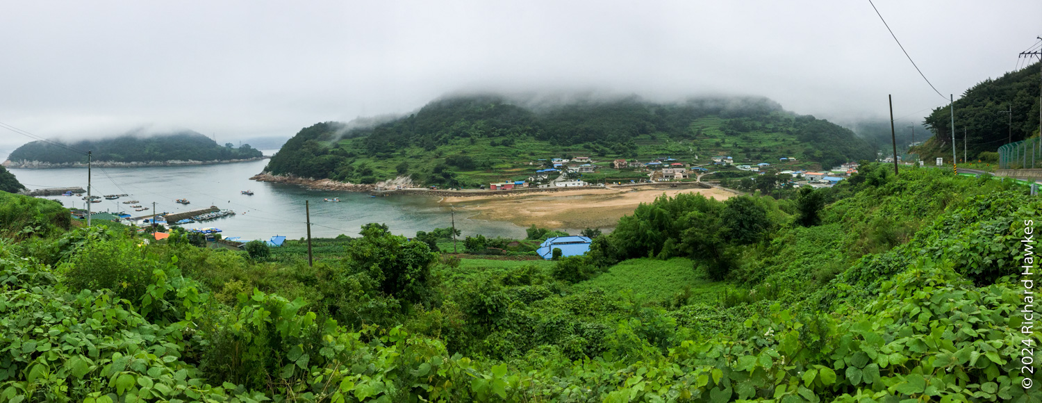 We drove from town south and east. There were lovely lush green fields on the way where we stopped for photos. Next, we stopped at a harbour area on the east called Pyeongsan. After that we drove west then up through the middle part of the island, the west again to Jigokhang harbour area where we had lunch at Anchovy and Kalchi and Hello (멸치랑칼치 and hello.).