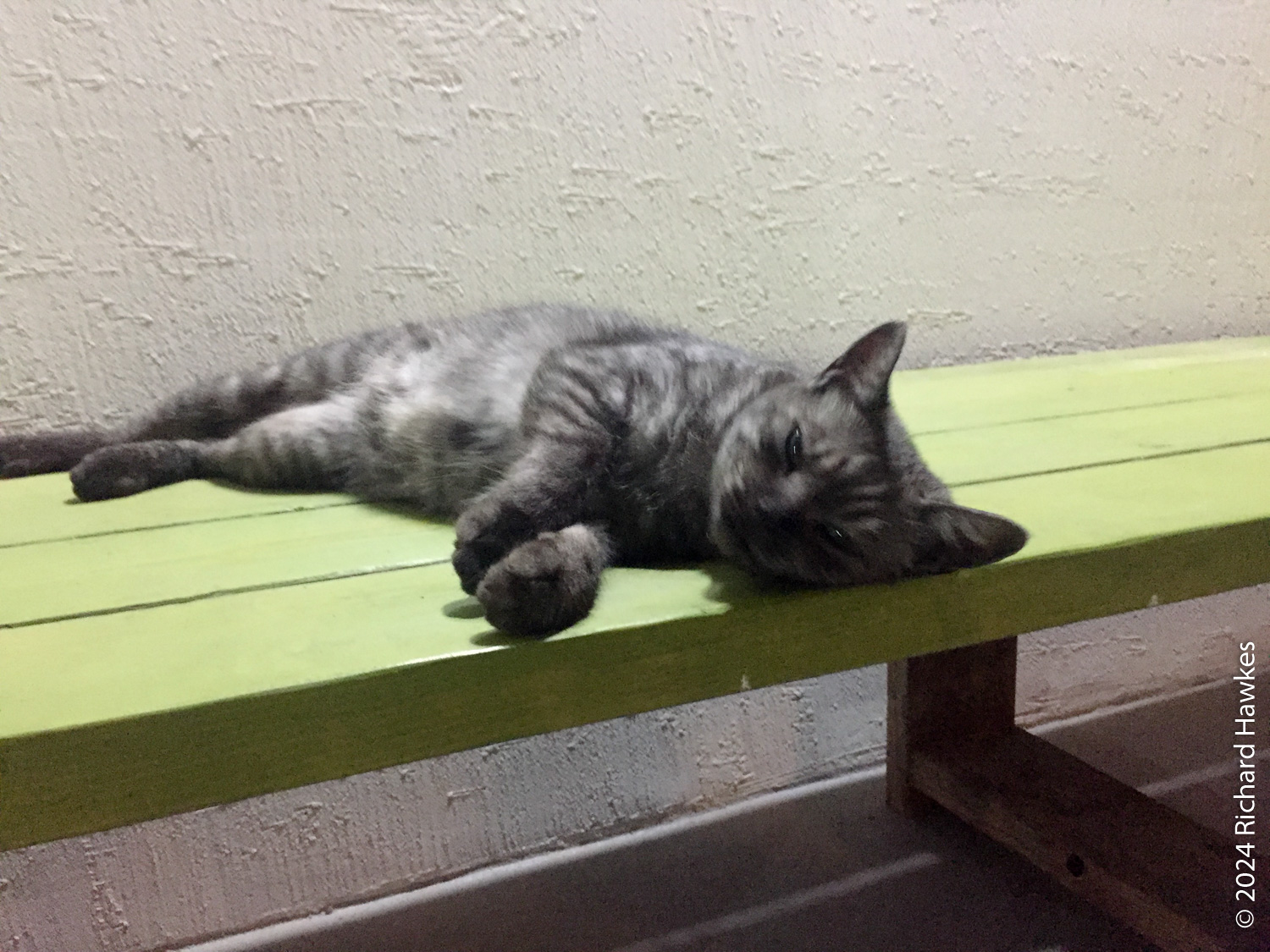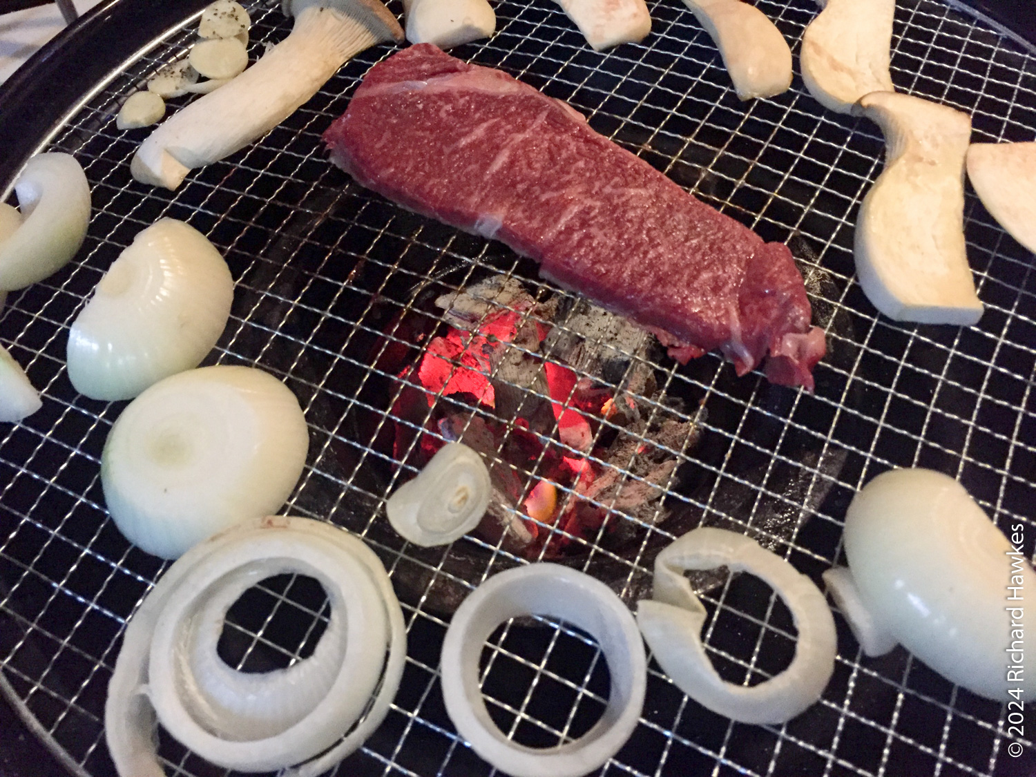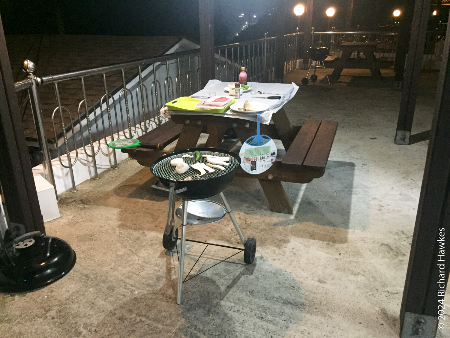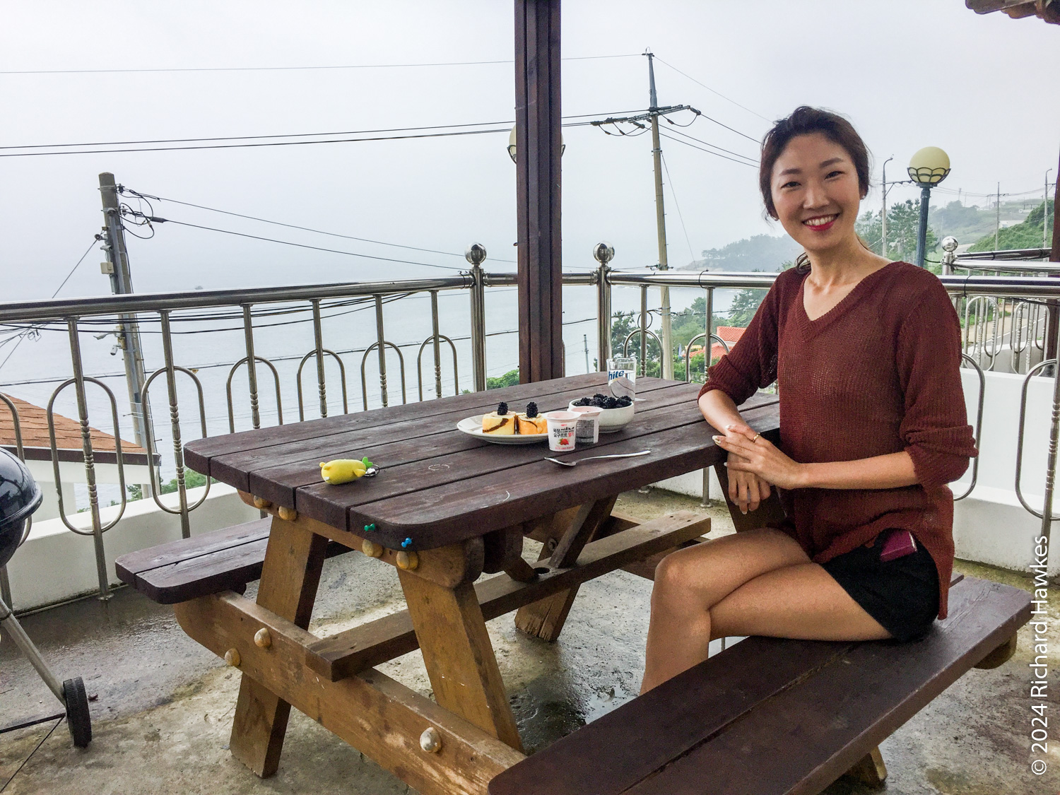 We started making our way to where our accommodation was. We stayed at a place called Namhae Pension 920 (남해펜션920) on the south west coast. We bought some food to cook (beef and vegetables) then headed there. It had a lovely, terrace with covered barbeque area looking out to the sea. We cooked up the steak and drank some bokbunja wine and made friends with a black cat!