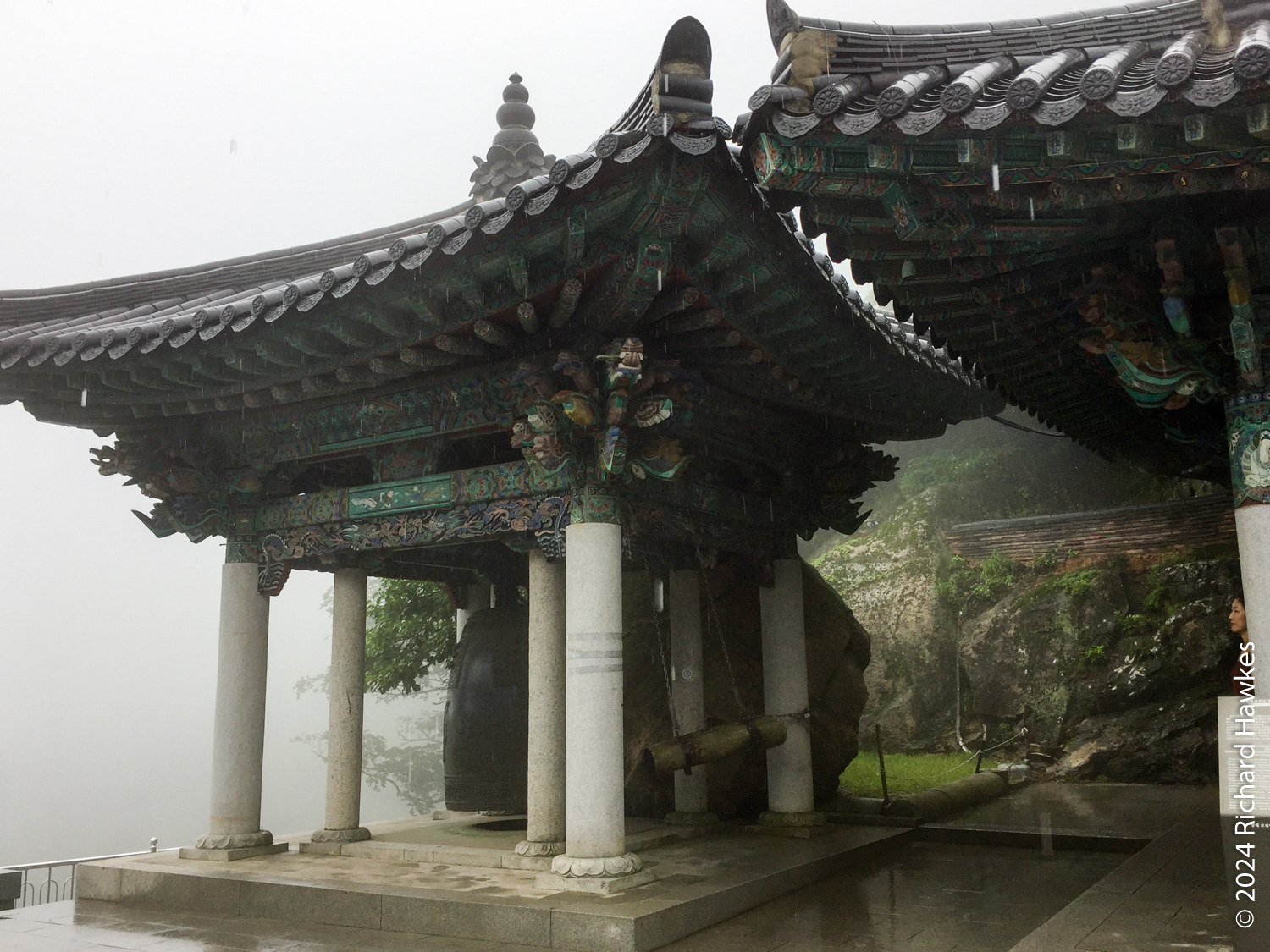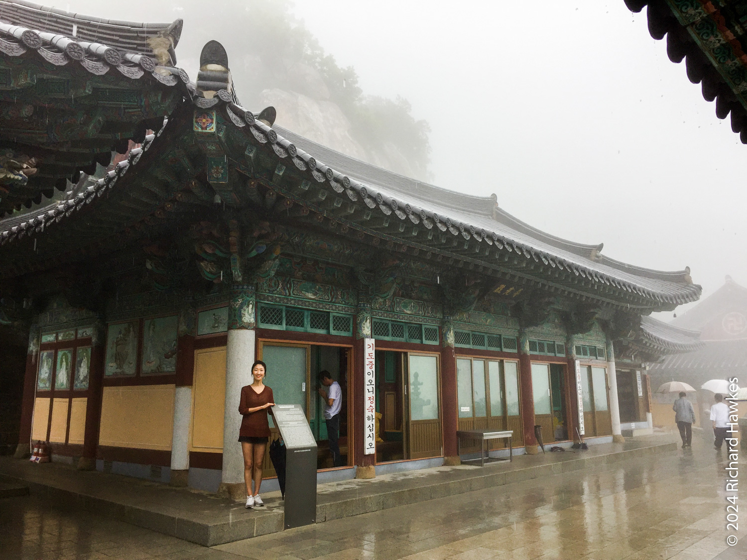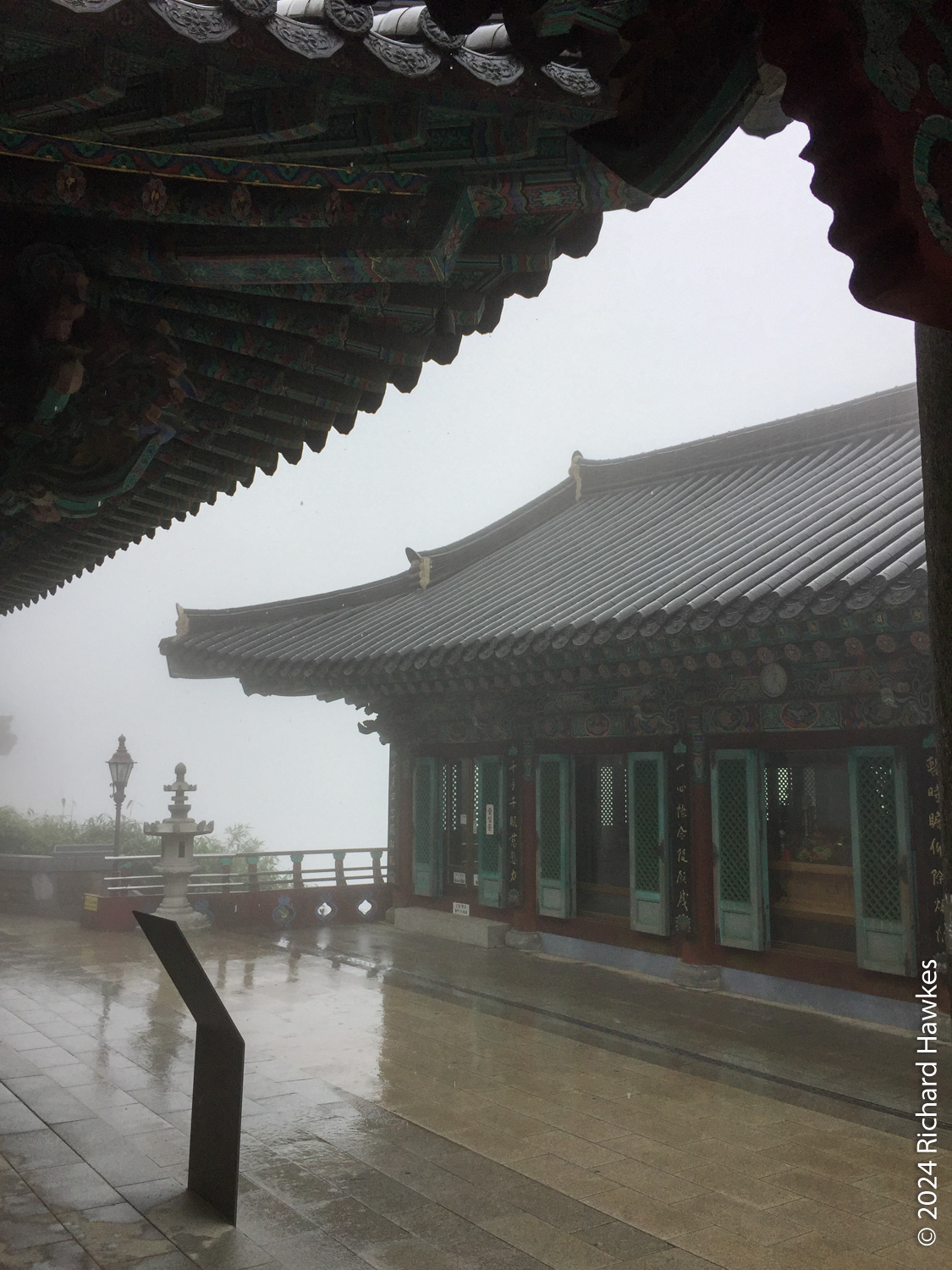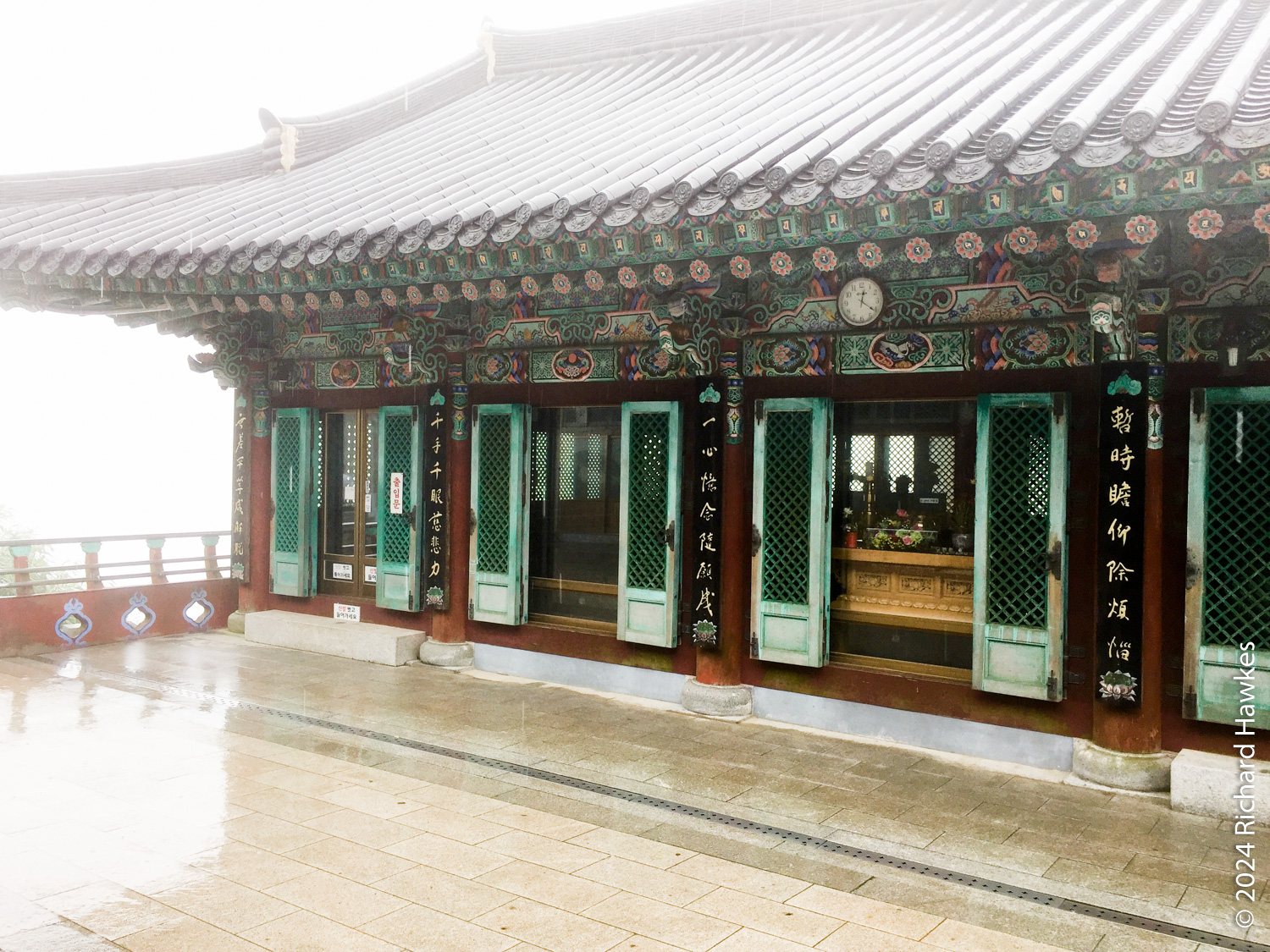 We had a convenience store breakfast on the terrace and looked out to what promised to be a very wet day! Nearby is a well-known mountain temple called Boriam, so off we went! It was raining pretty hard by the time we got there. There’s a parking lot on the east side that you approach from the north west. There’s shuttle bus (I think), so no hiking necessary. Because of the rain there weren’t any views from the wide temple terrace out to sea, but the fog gave the whole temple a lovely and eerie atmosphere. Check my post from 2023 to see the temple in better weather!
