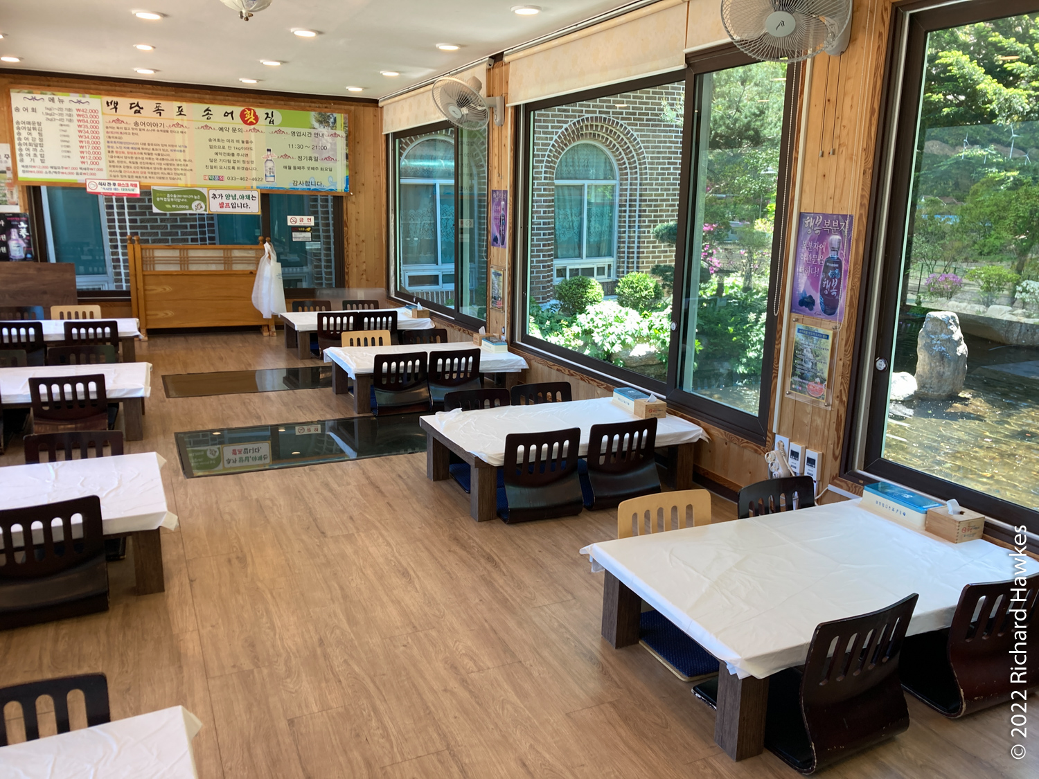 We took an early bus from the apartment, then a packed subway to one of the main intercity bus terminals in Seoul. Then we got on a mega-comfy limousine bus across to Sokcho on the east coast. Along the way, we stopped off at a motorway services with great views into the valleys. We picked up out rental car then drove to a trout farm restaurant for some trout sushi and deep fried trout scampi: Baekdam Waterfall Trout Restaurant 백담폭포송어회.