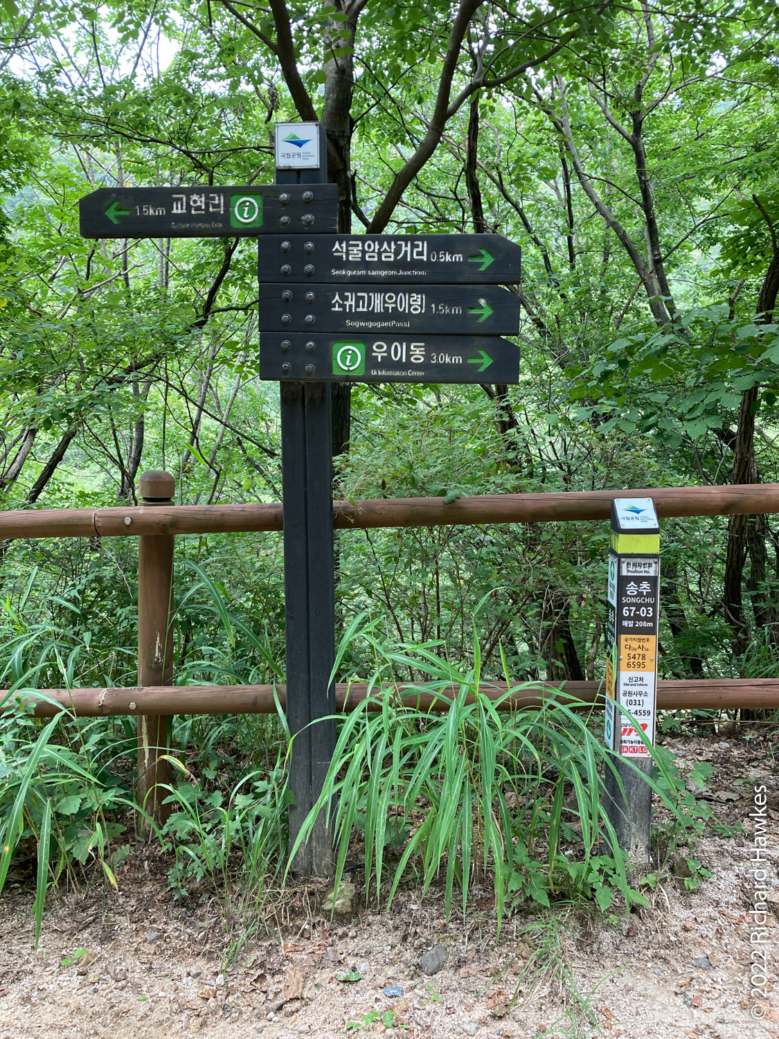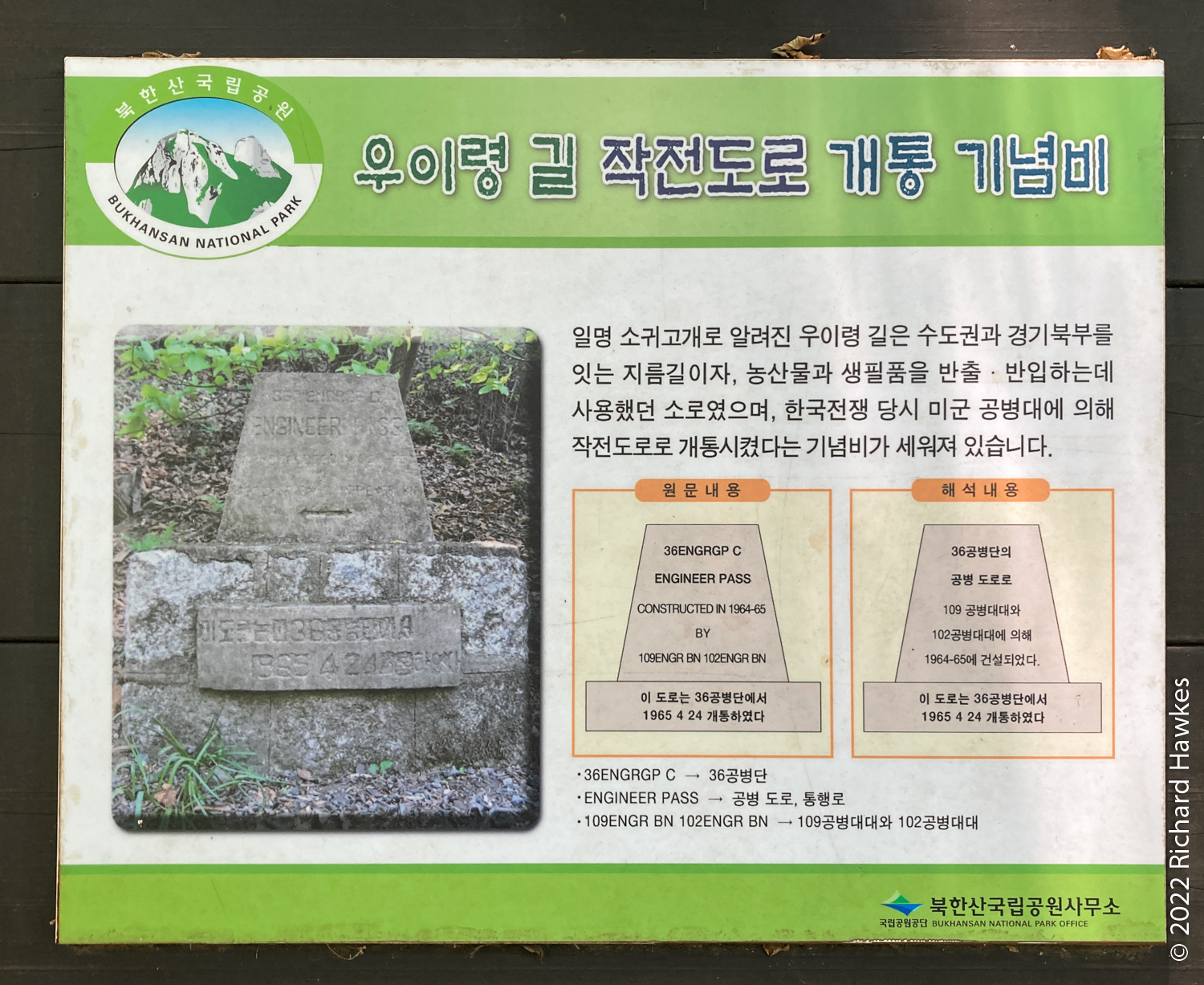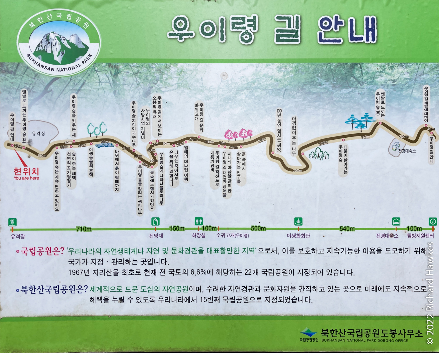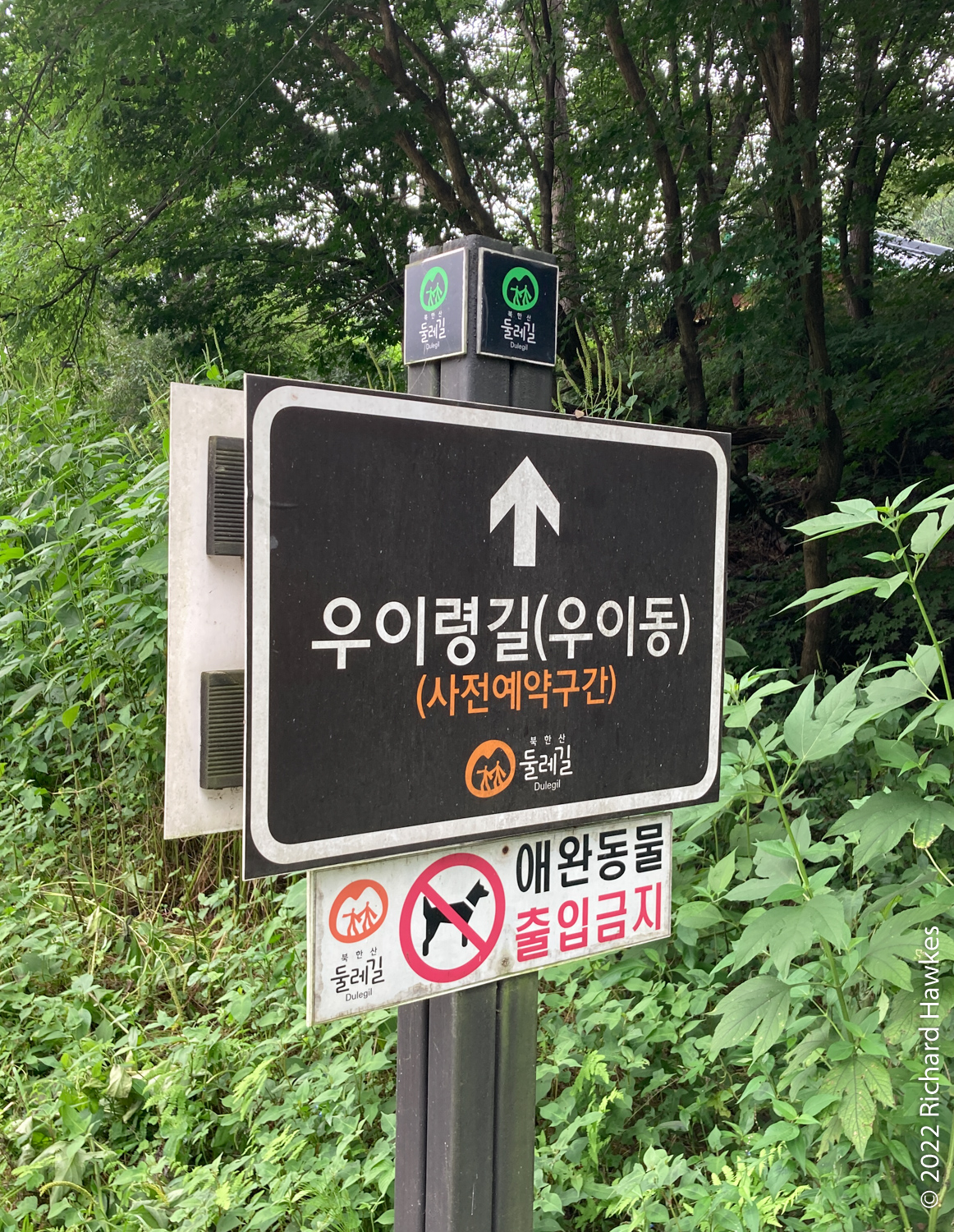 The Uiryeong-gil (우이령길) trail goes from the north-west part of Bukhansan National Park following a valley south-east to Ui-dong. It’s also known as the Bukhansan Dulle-gil Trail 21 (북한산둘레길21구간), and 가을단풍길(우이령길). You’ll to make need a reservation for this route on account of the military installations along the trail. Do that at the Korean National Park Service (KPNS) reservation website.
