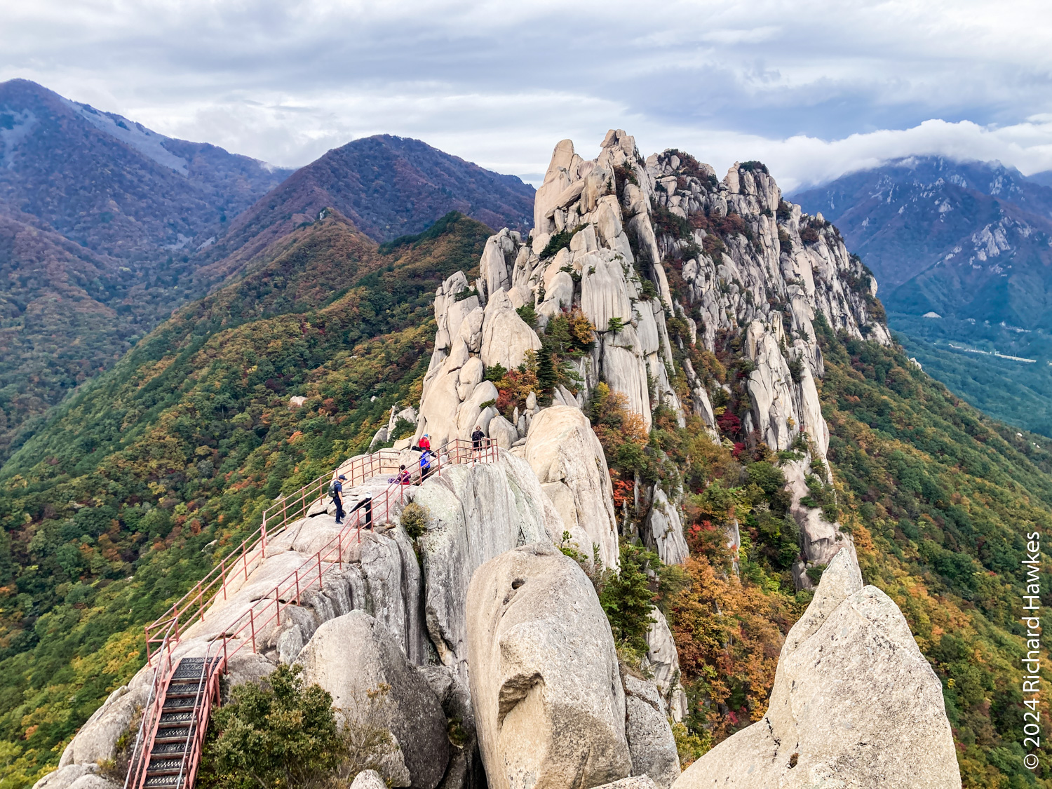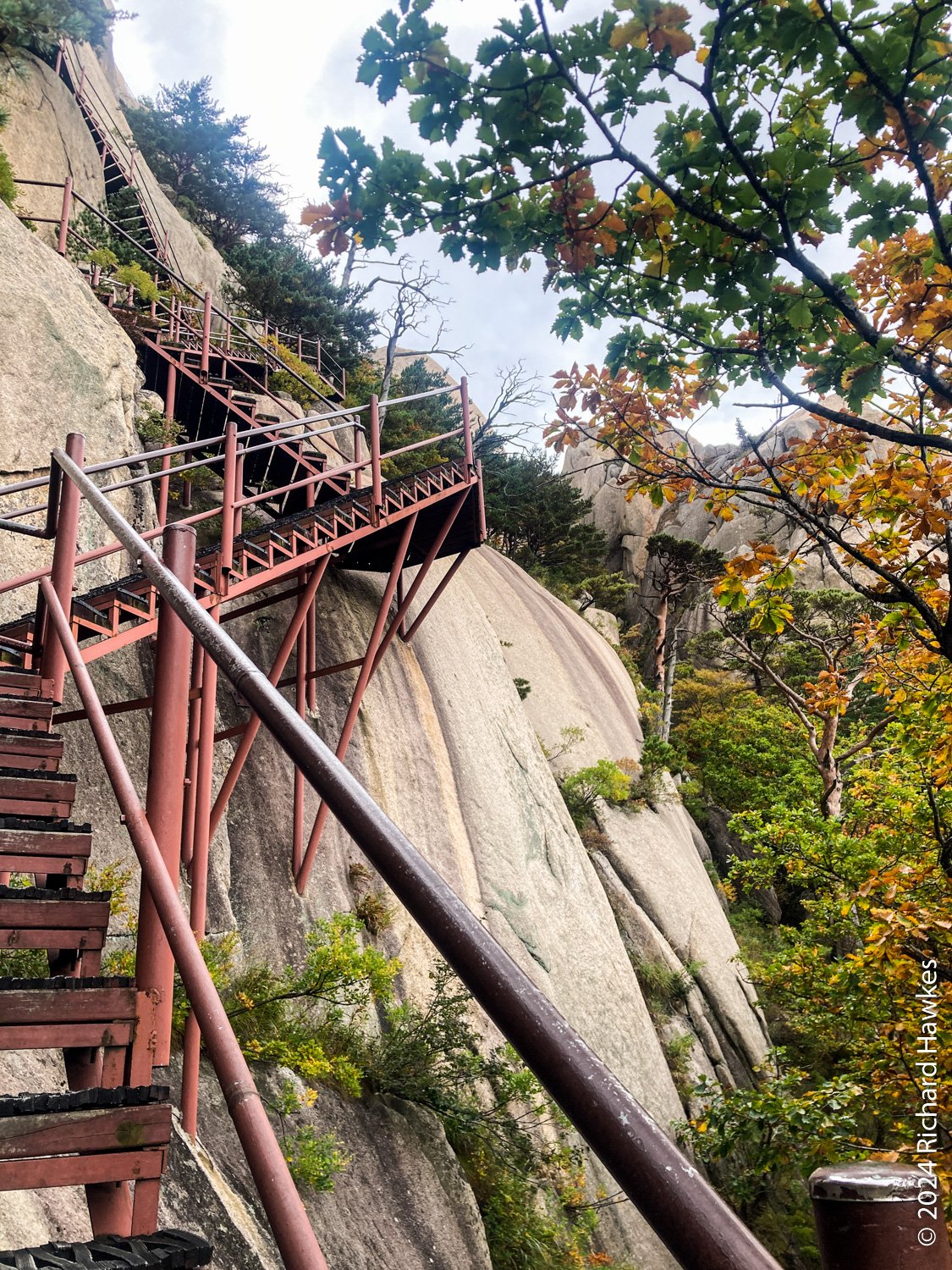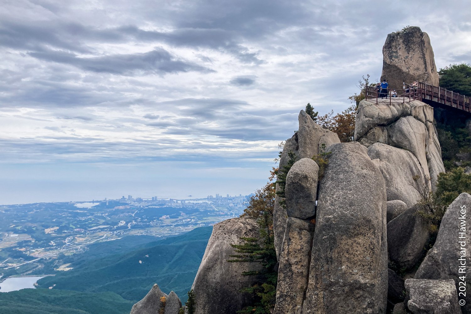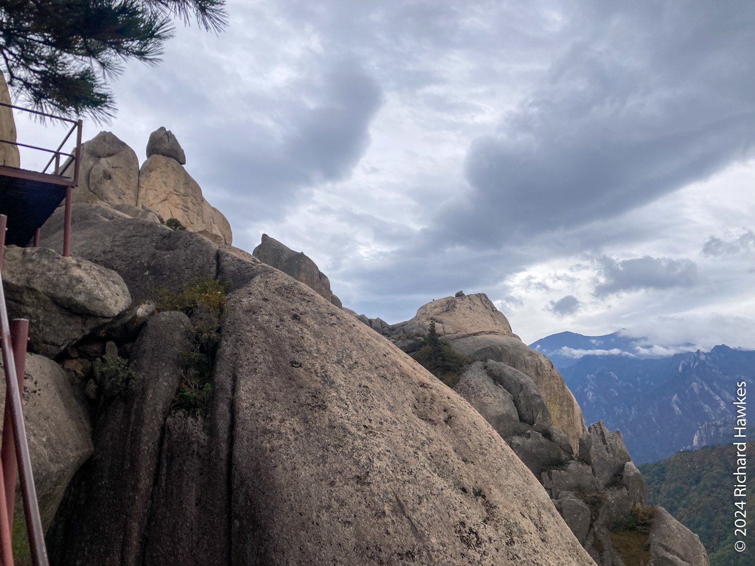 About half way up the trees start to disappear and you can look back into the park. It’s fantastic, even down there! The further up you go, when you look back during you breaks more and more of the ranges behind you show themselves. The final parts of the stairway take you onto the side of the rocks and it’s an awesome feeling. At the top, there are three viewing decks to visit. I could look over the valley to where I was the day before on Seongindae (성인대).