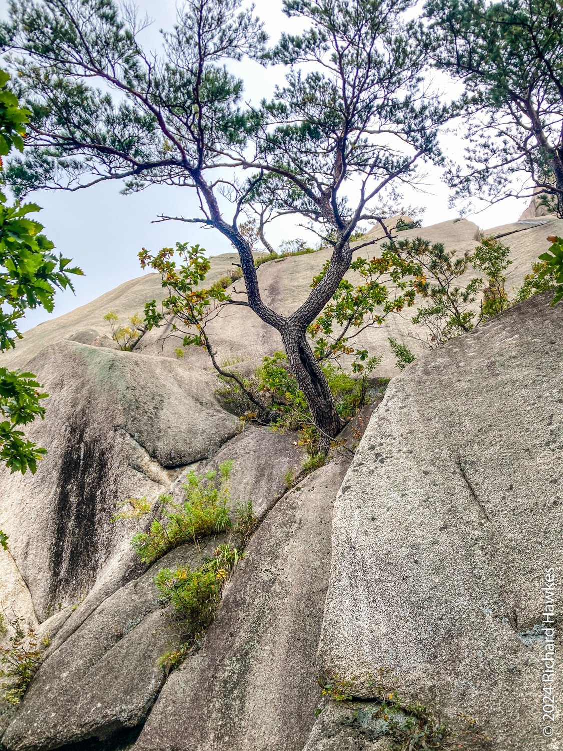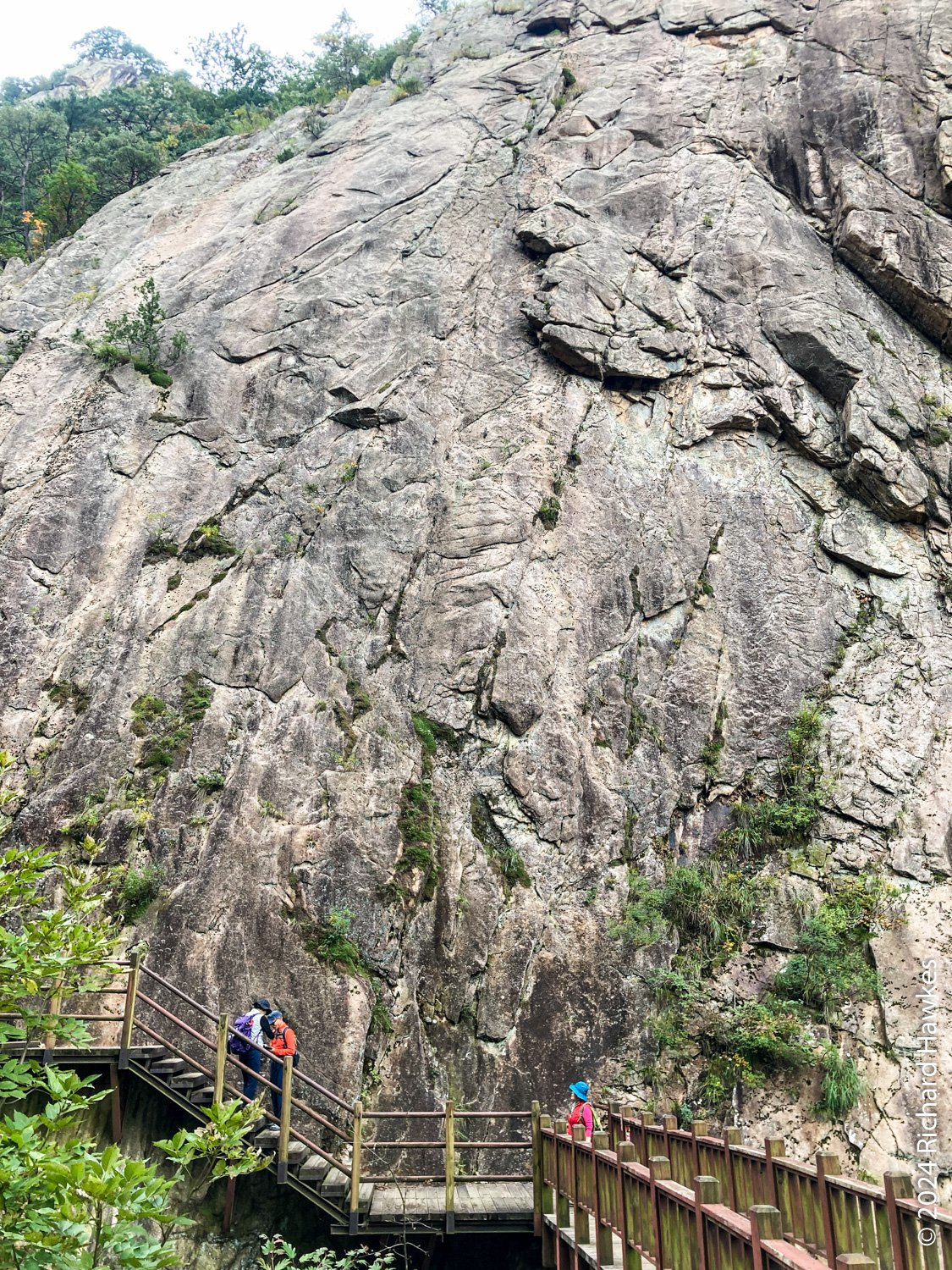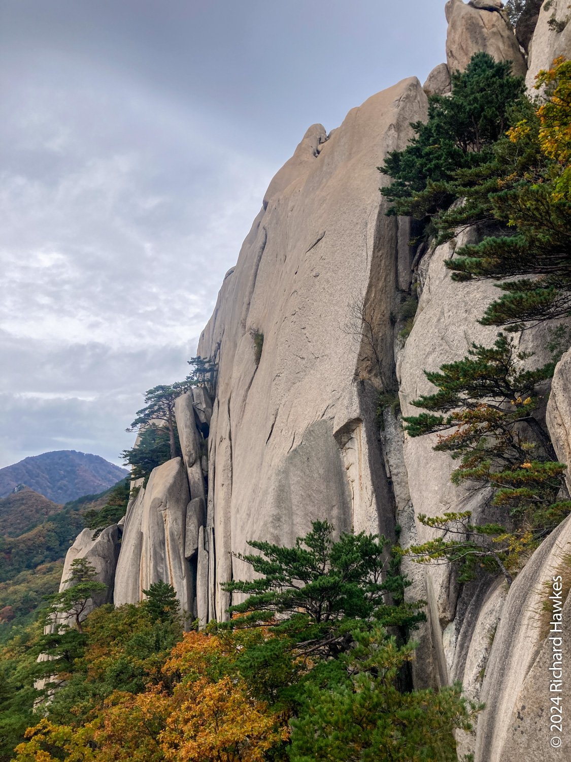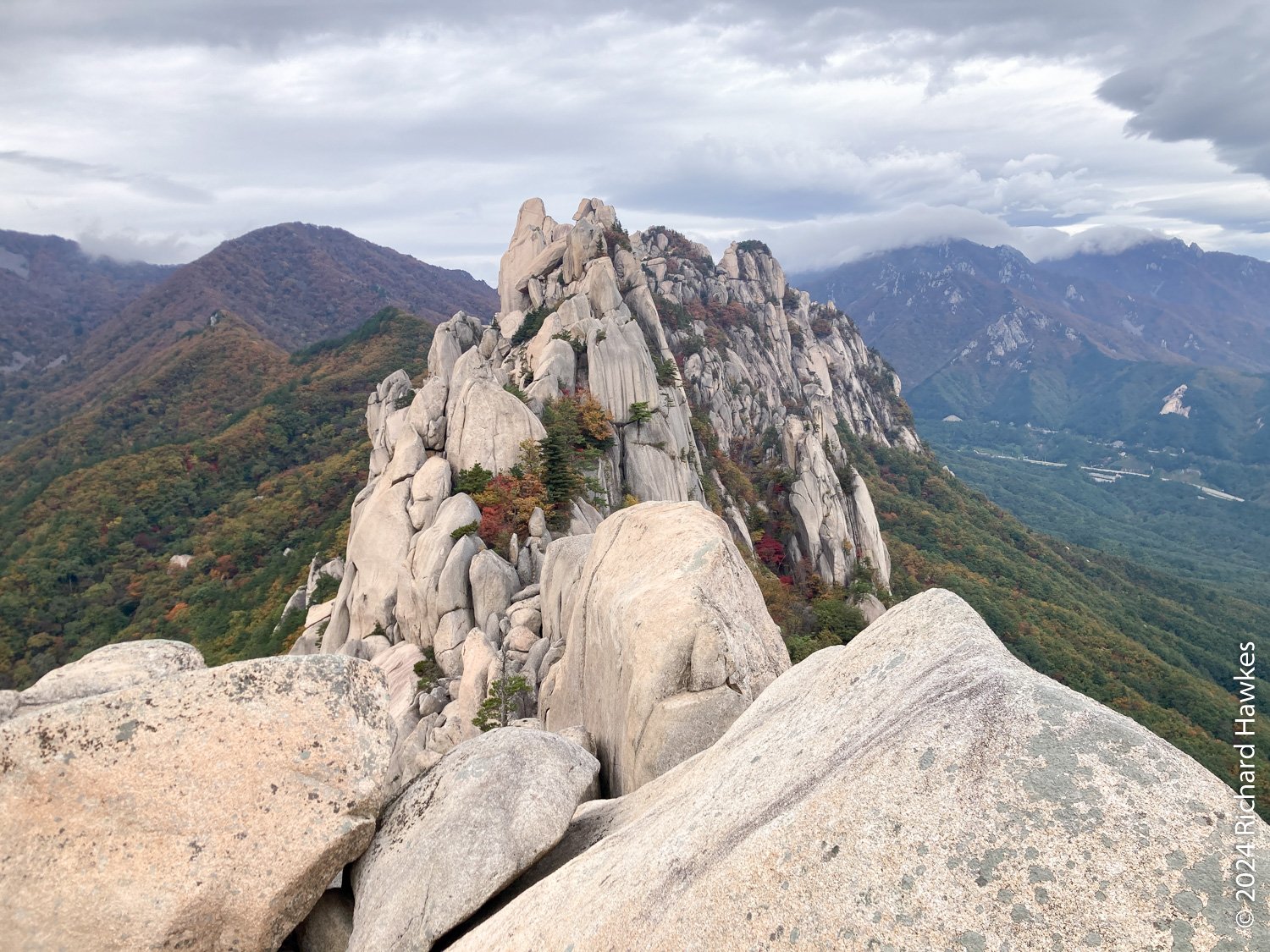 About half way up the trees start to disappear and you can look back into the park. It’s fantastic, even down there! The further up you go, when you look back during you breaks more and more of the ranges behind you show themselves. The final parts of the stairway take you onto the side of the rocks and it’s an awesome feeling. At the top, there are three viewing decks to visit. I could look over the valley to where I was the day before on Seongindae (성인대).