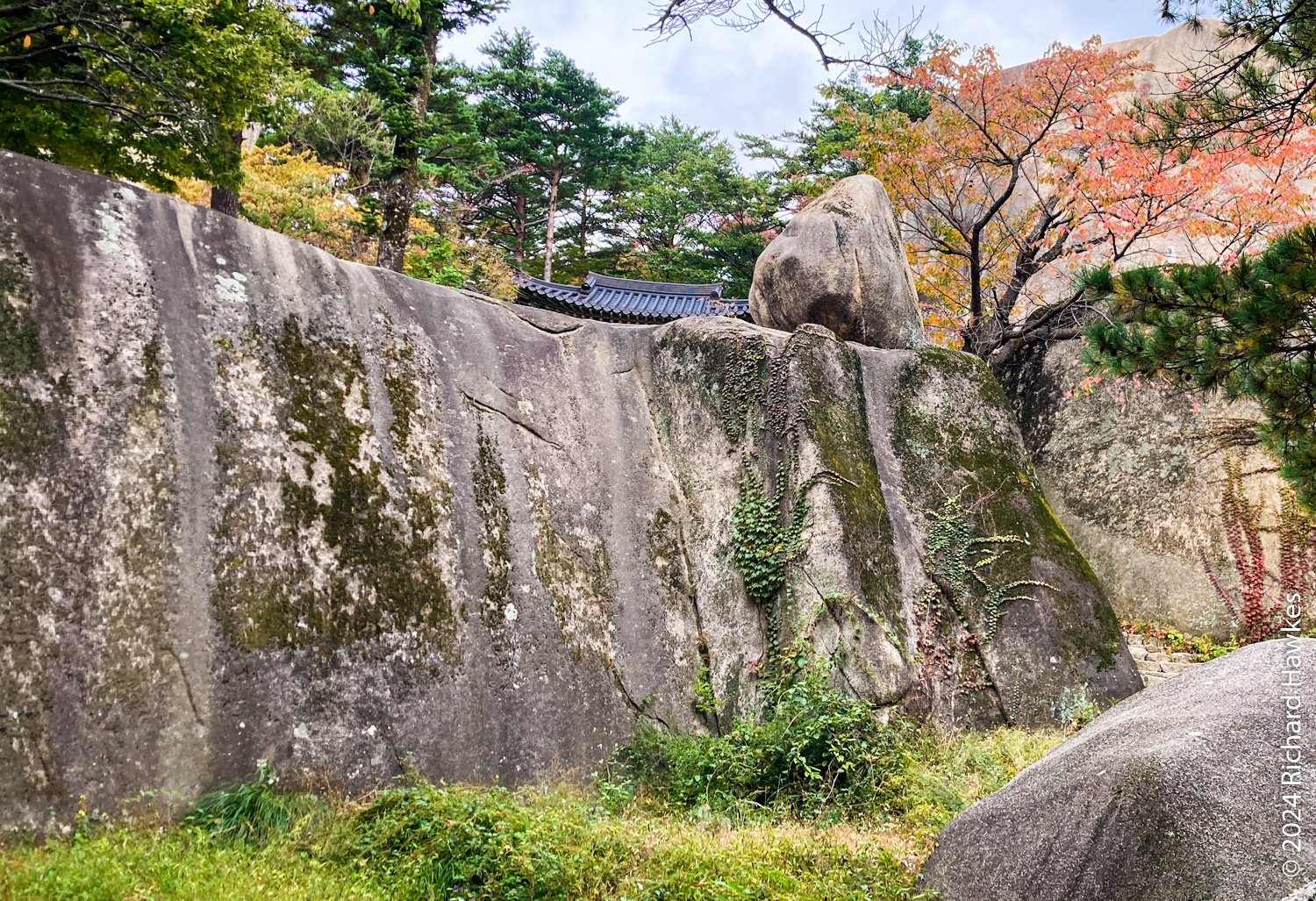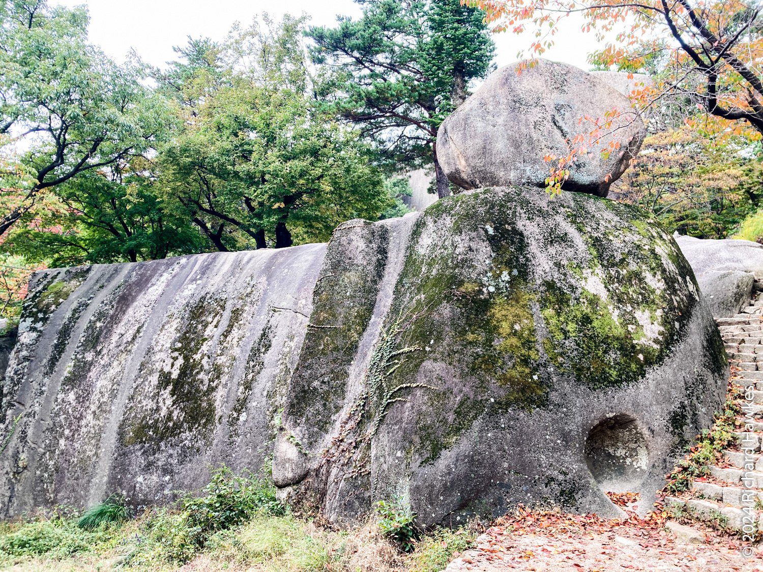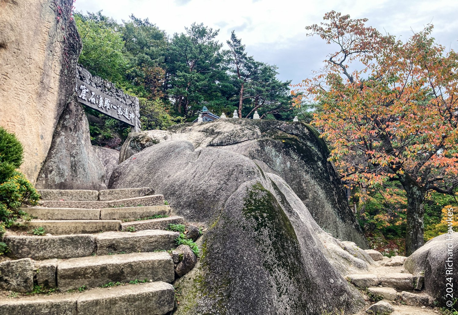 There was construction work on the main trail, and the diversion went through the forest on the left of the stream. It was a little harder work as the path was rocky and uneven, but basically easy. Then I was then heading up at a steady incline on rocky steps taking a few breathers. Eventually, you get to Gyejoam (계조암) a hermitage with the famous Heundeulbawi rock (흔들바위) that you can wobble, but is impossible to roll.