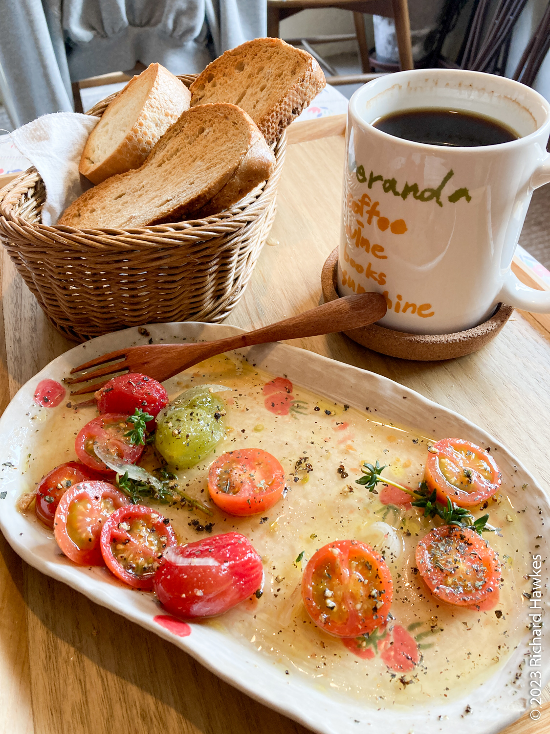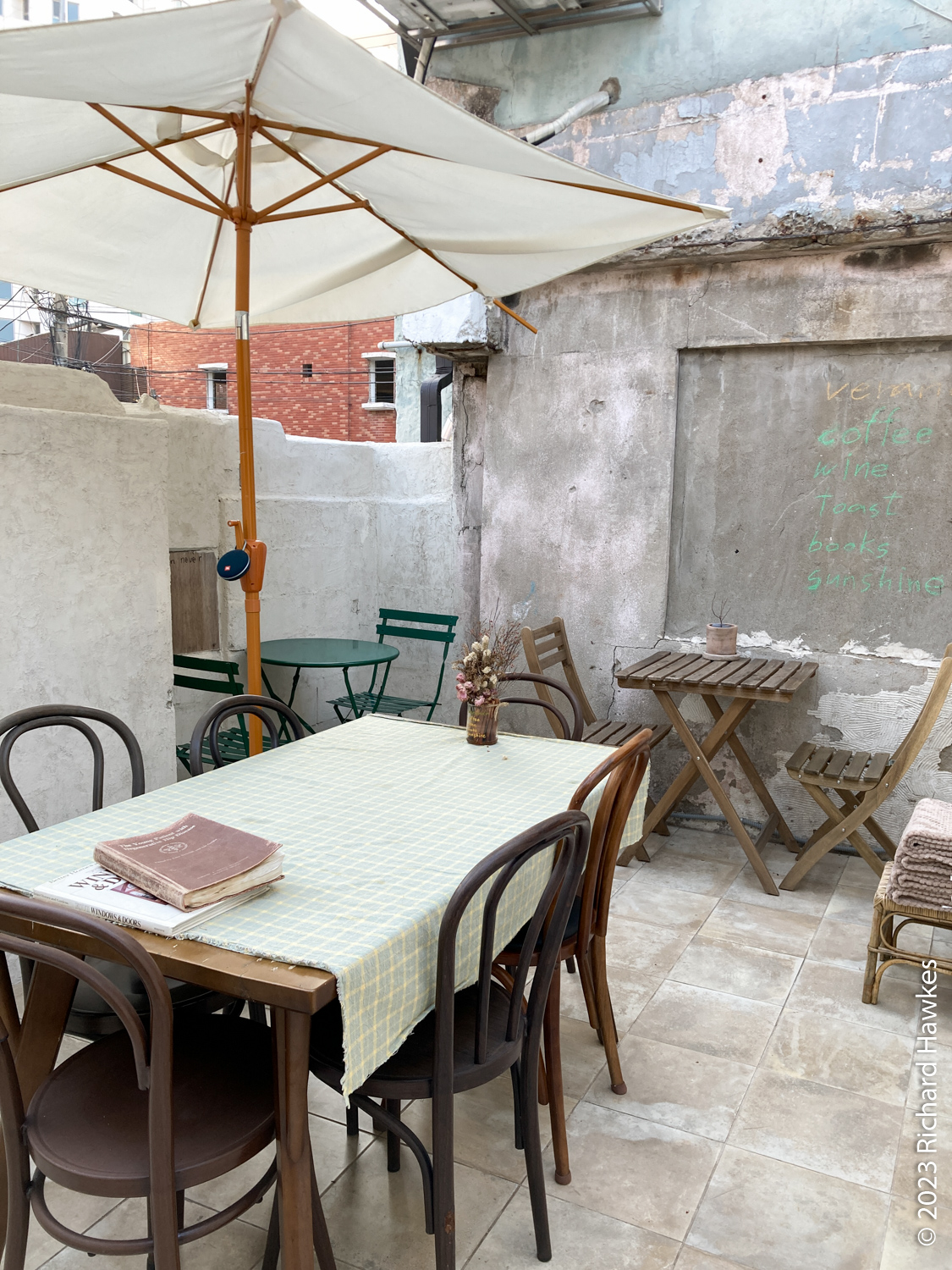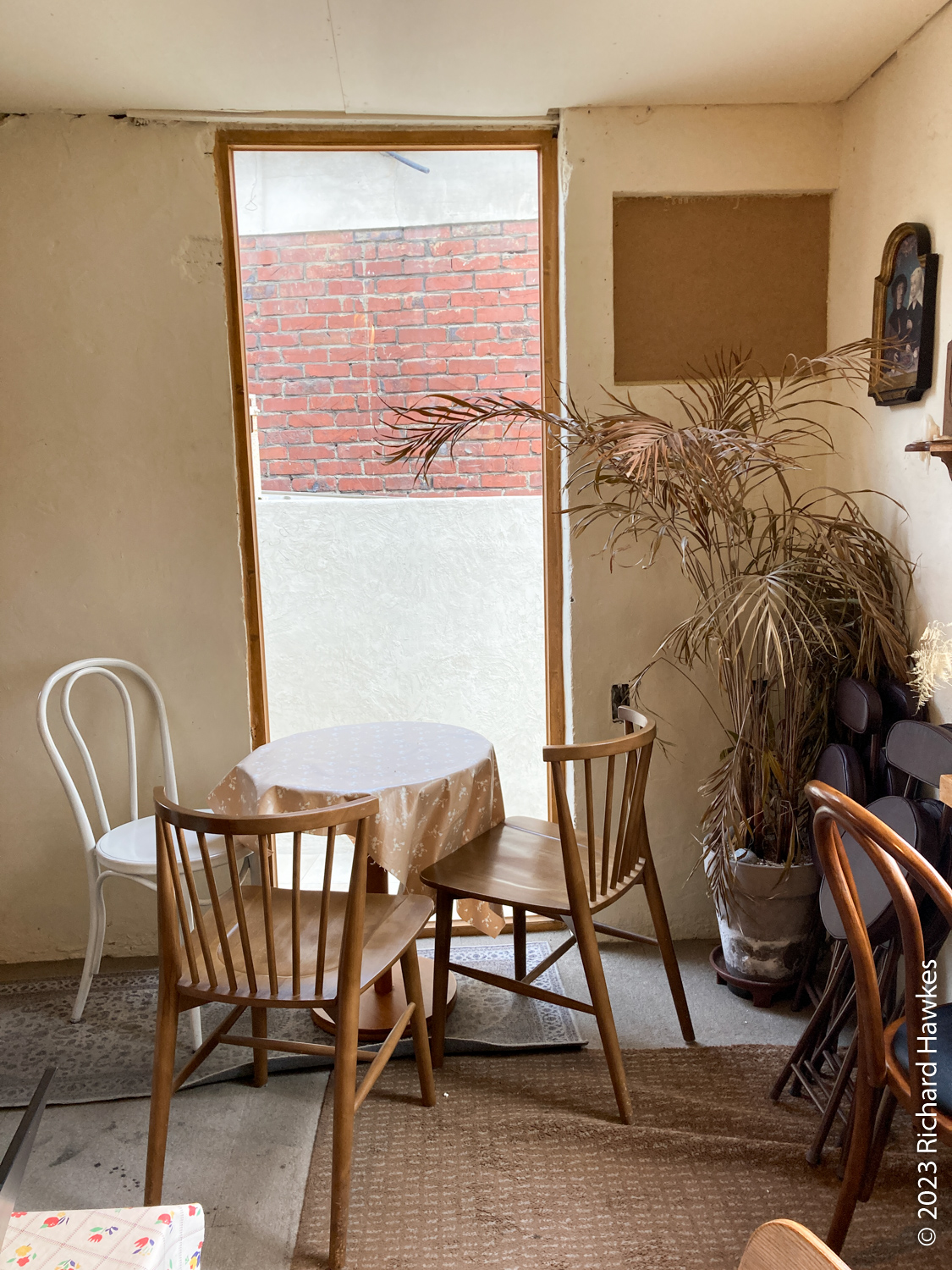 They serve regular coffees and teas, plus a small selection of food. I didn’t sit outside because it was full while I was there. I took a few photos after they left.
