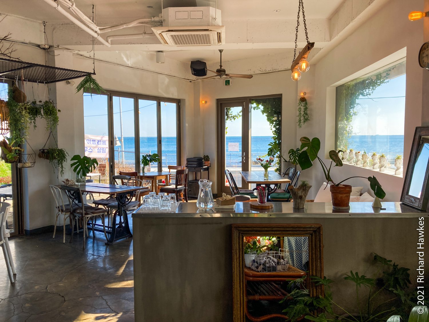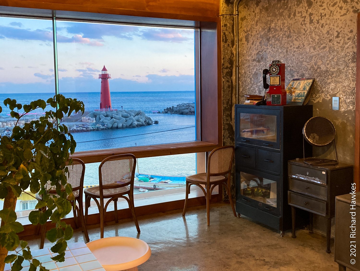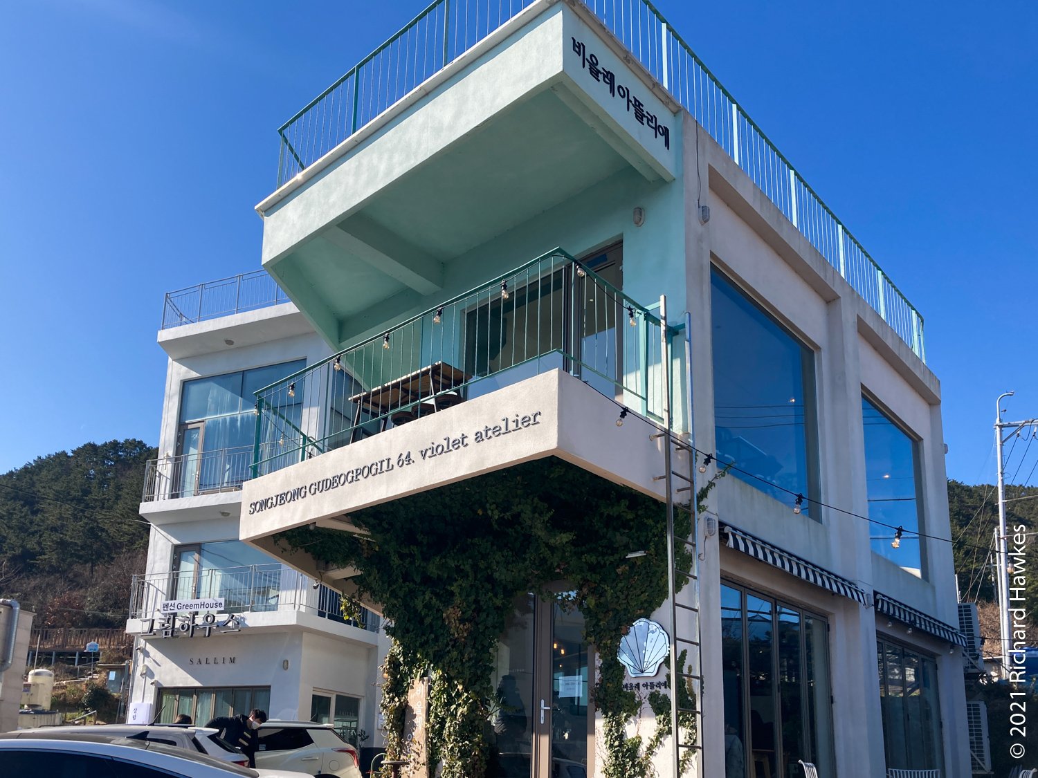 We walked to Violet Atelier (비올레아뜰리에) a brunch cafe in a new building overlooking the sea. We enjoyed the view, the sun streaming through the windows and the photo ops! The food and coffee was great.