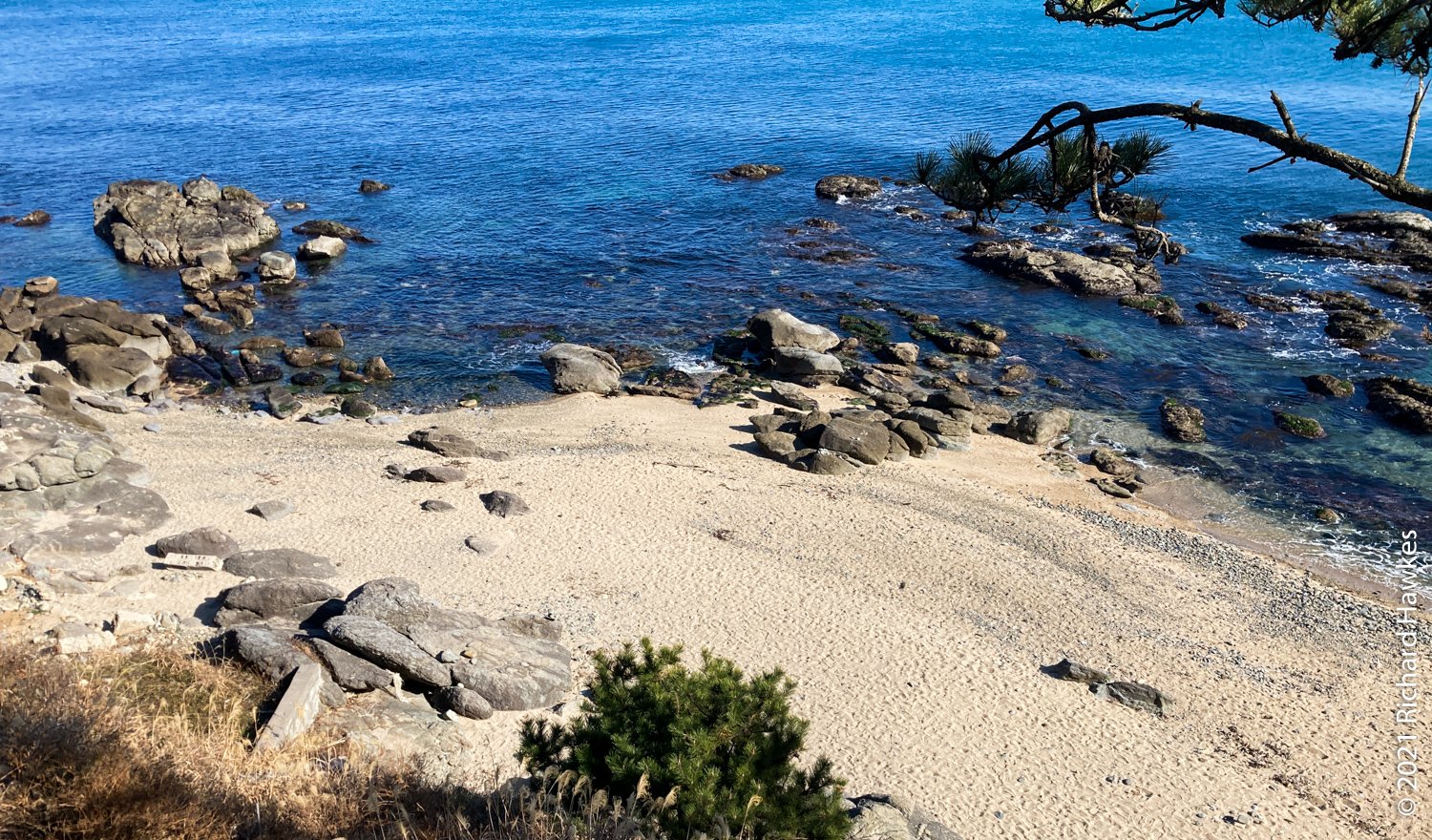 Well rested, we walked south along the beach for a short way. The beach gives way to a rocky coast.