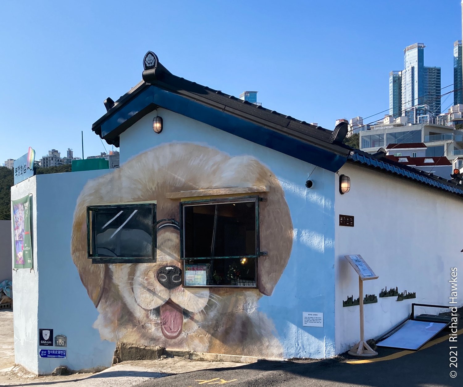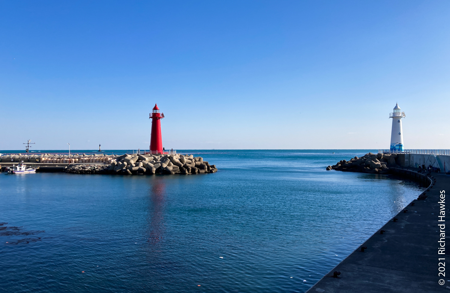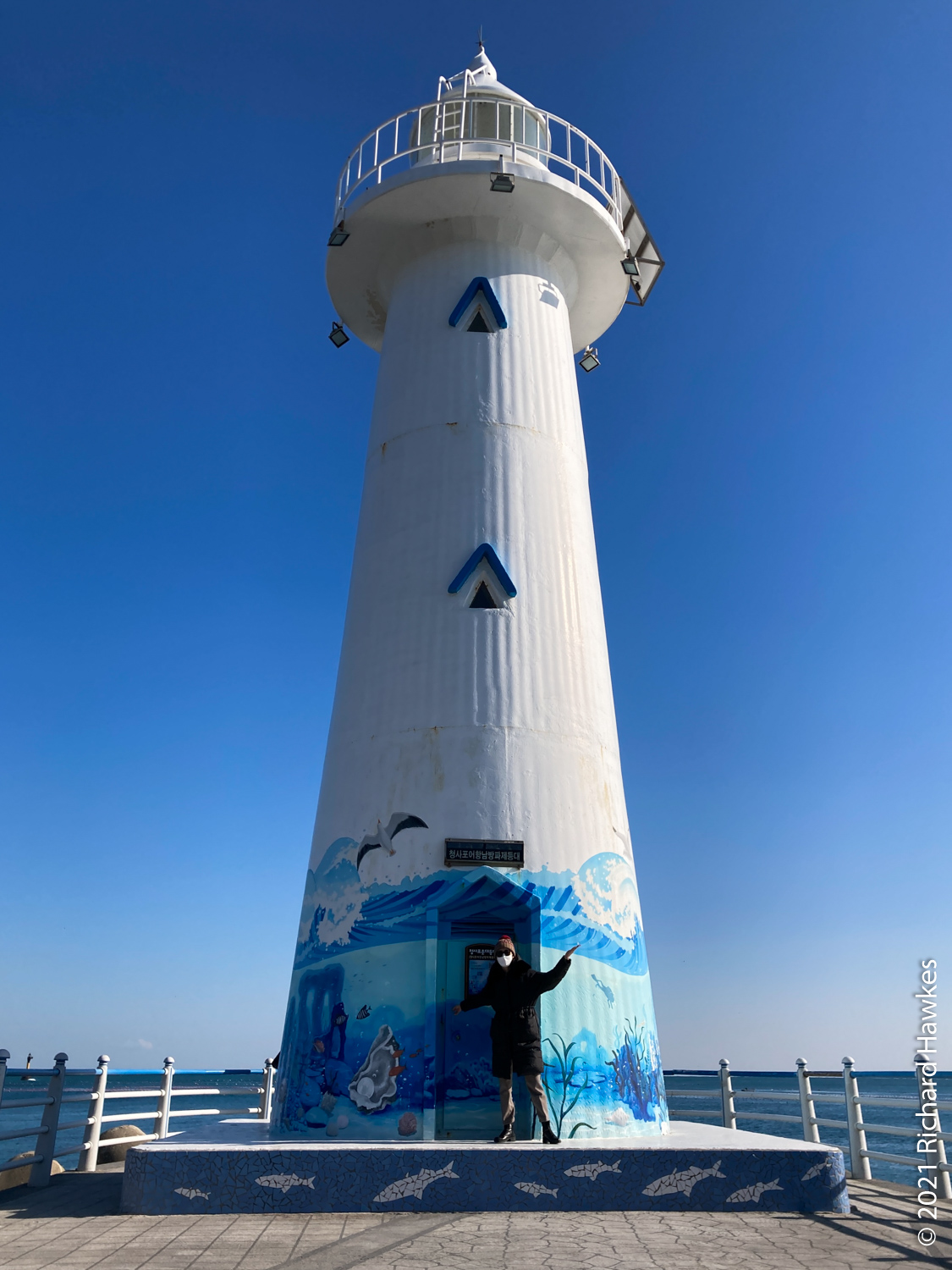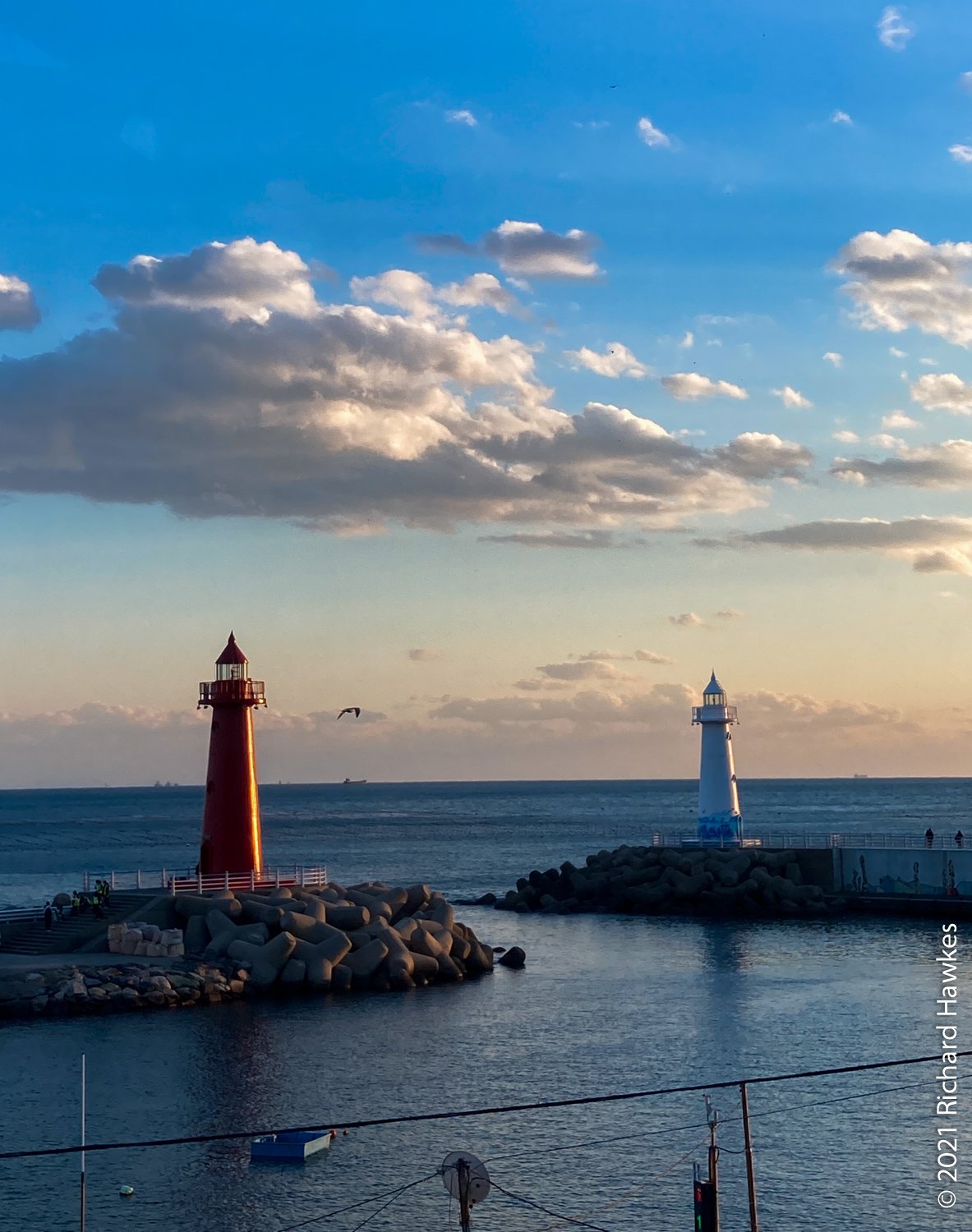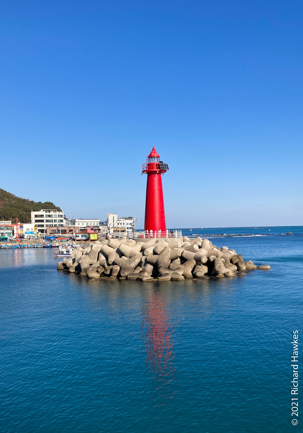 We then walked south along the coast to Cheongsapo Harbour (청사포). You can walk along the shore for some of the trail and also along the wooden walkway that runs alongside the Haeundae Blueline Park tram tracks. This goes all the way to the famous Haeundae Beach in Busan. The harbour is quaint with two lighthouses. The village behind it is quite small and on a hill.