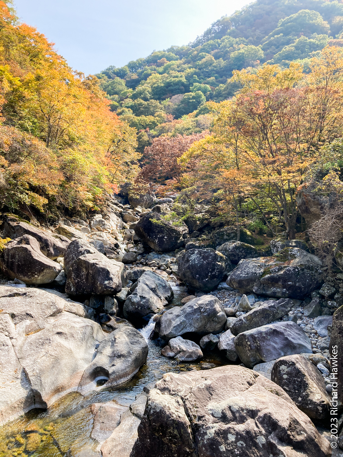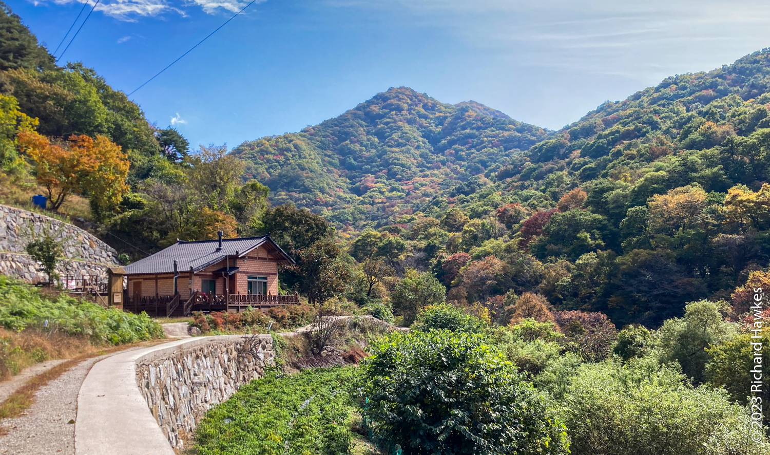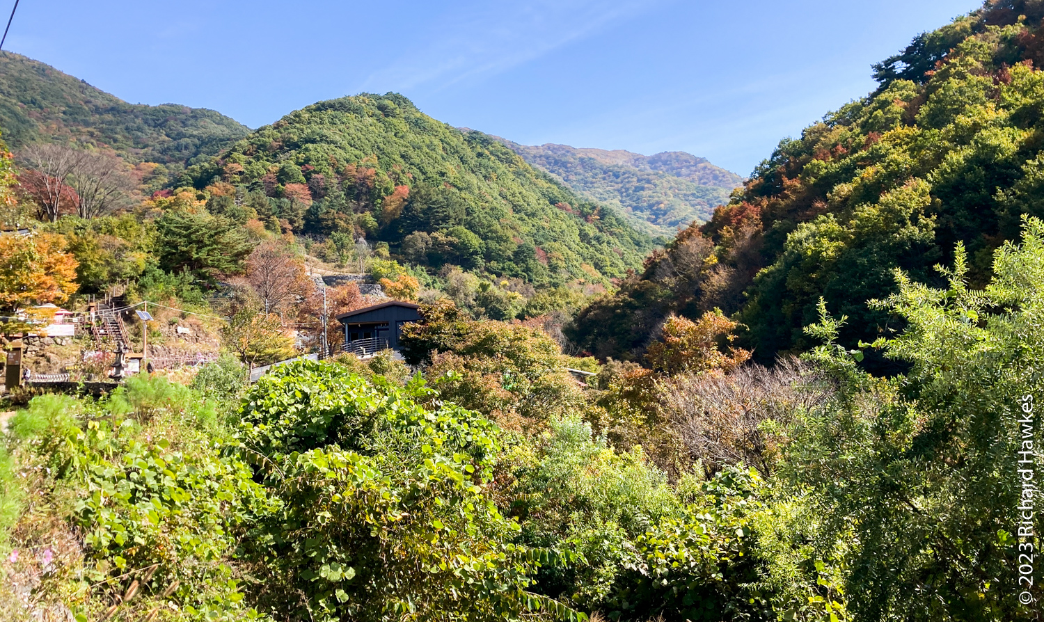 I left Hanok Guesthouse (무아 한옥 게스트하우스) at 8:30 and drove about 40 minutes east to the Baemsagol entrance to Jirisan National Park (지리산국립공원뱀사골탐방안내소). There’s a village up the valley with a forested valley trail going up. There’s also a single lane road but this is only for residents, guesthouse users, and park rangers to drive on. It about an hour’s walk to get to the village.