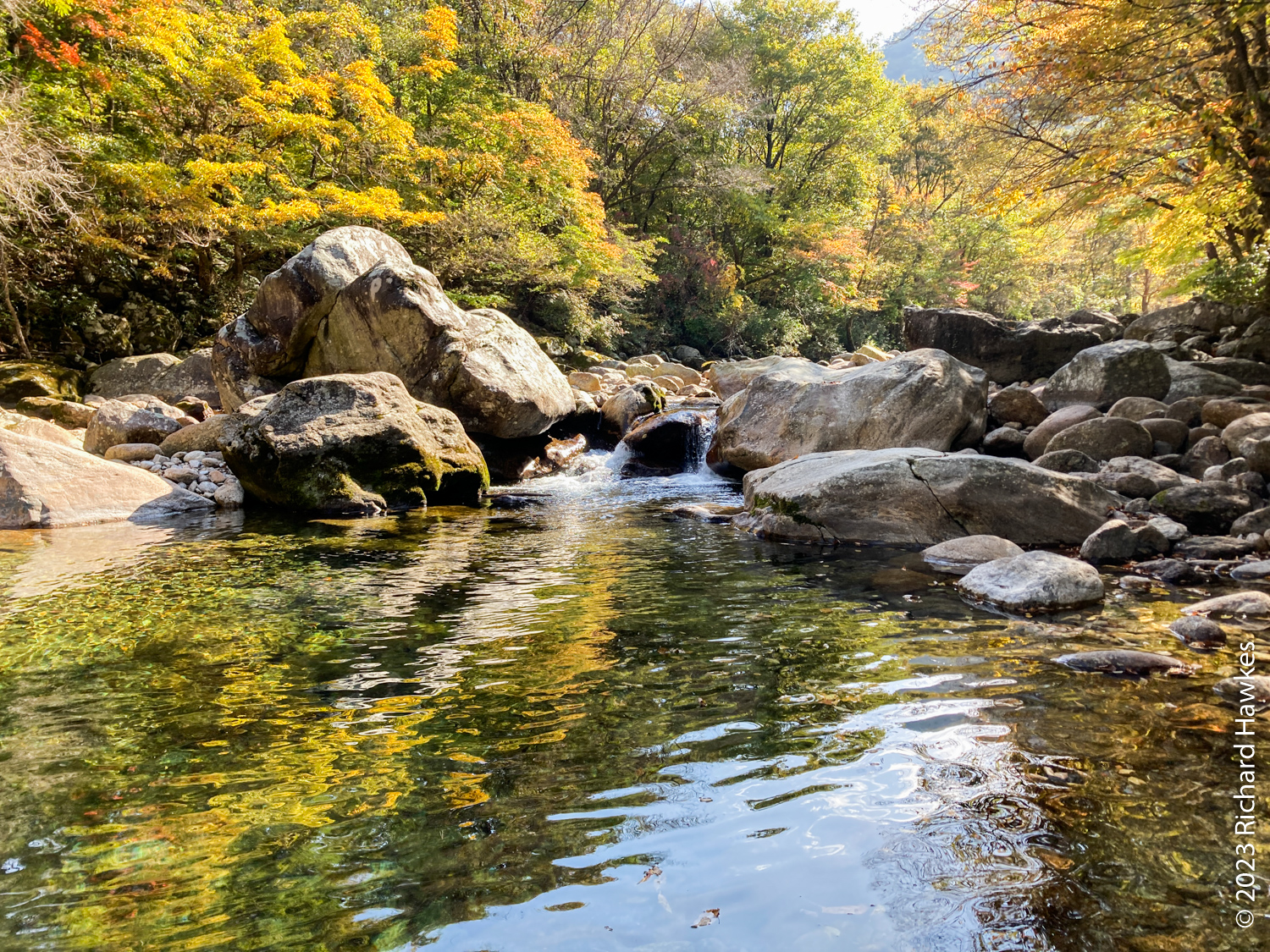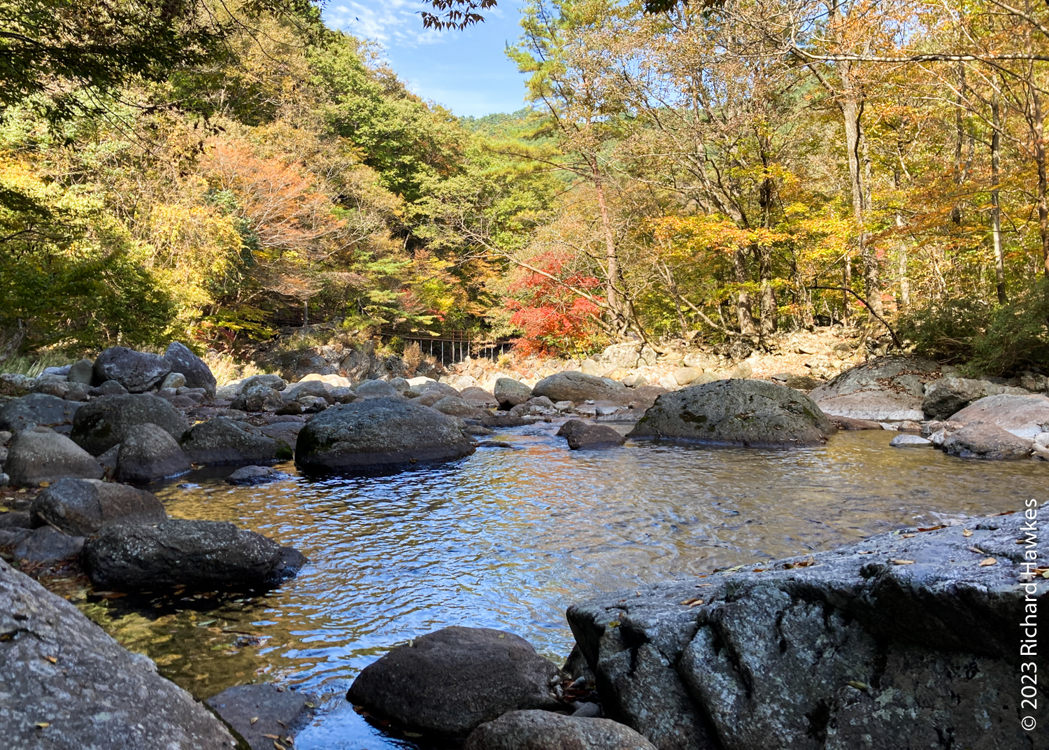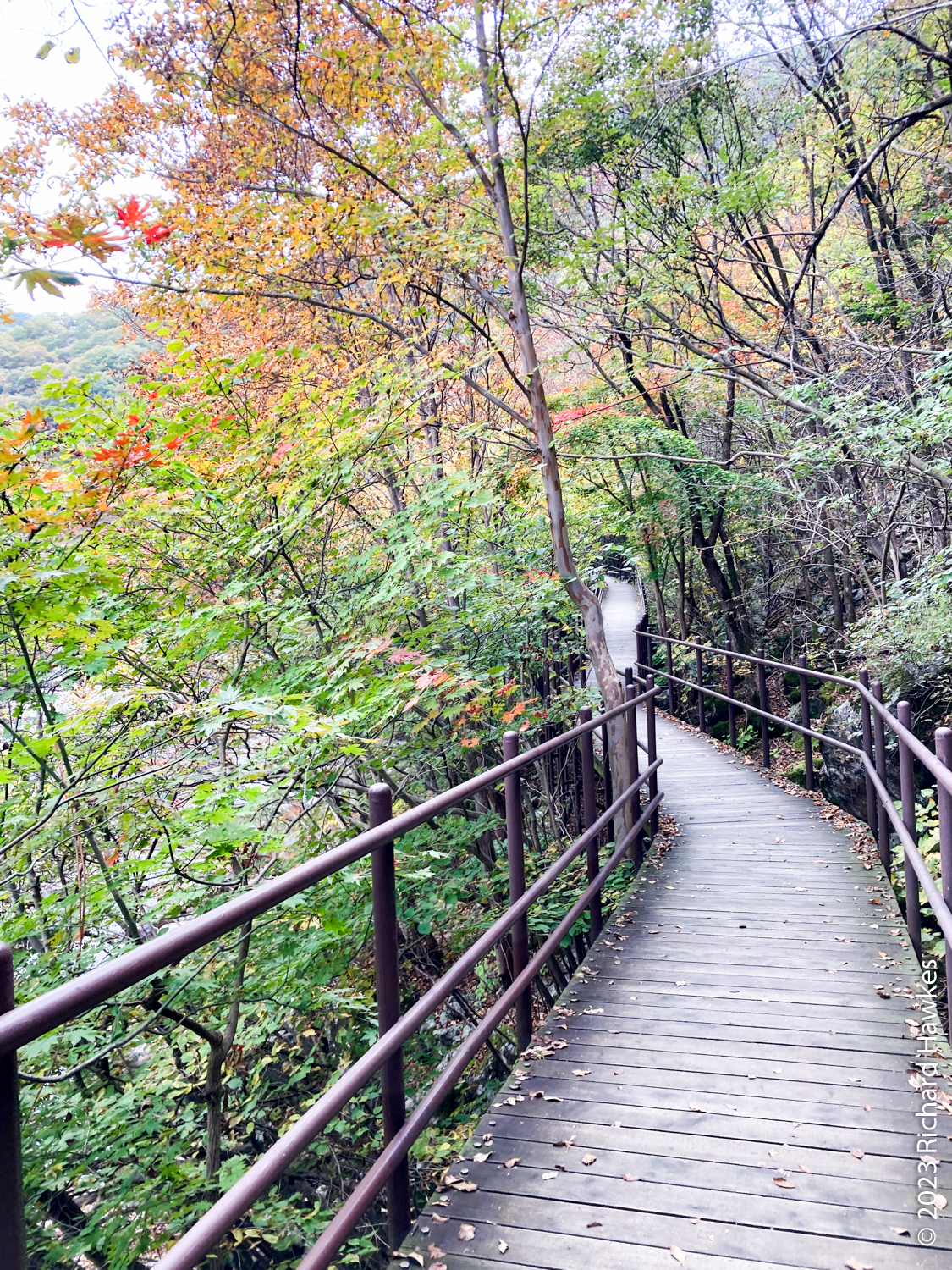 I left Hanok Guesthouse (무아 한옥 게스트하우스) at 8:30 and drove about 40 minutes east to the Baemsagol entrance to Jirisan National Park (지리산국립공원뱀사골탐방안내소). There’s a village up the valley with a forested valley trail going up. There’s also a single lane road but this is only for residents, guesthouse users, and park rangers to drive on. It about an hour’s walk to get to the village.