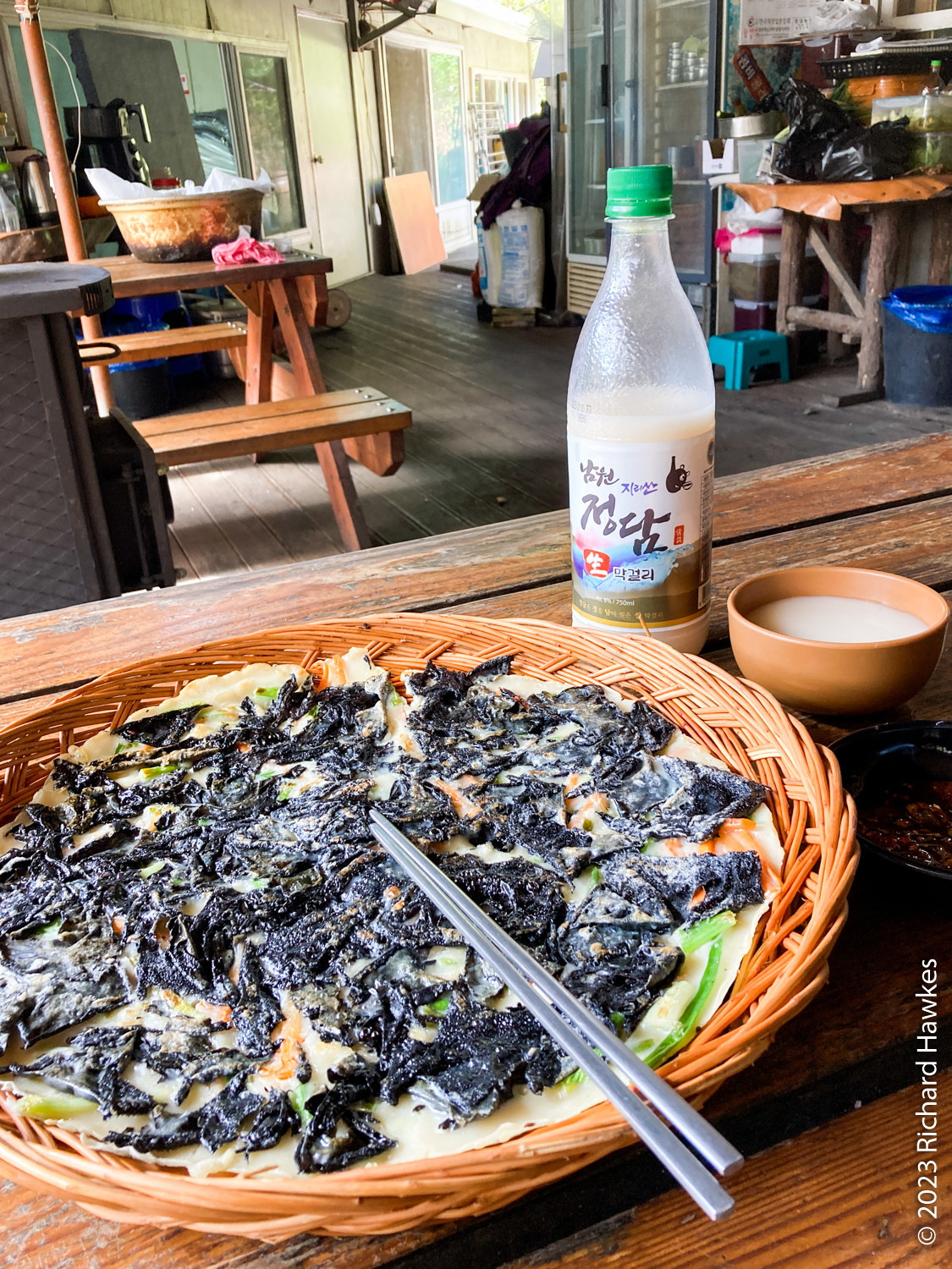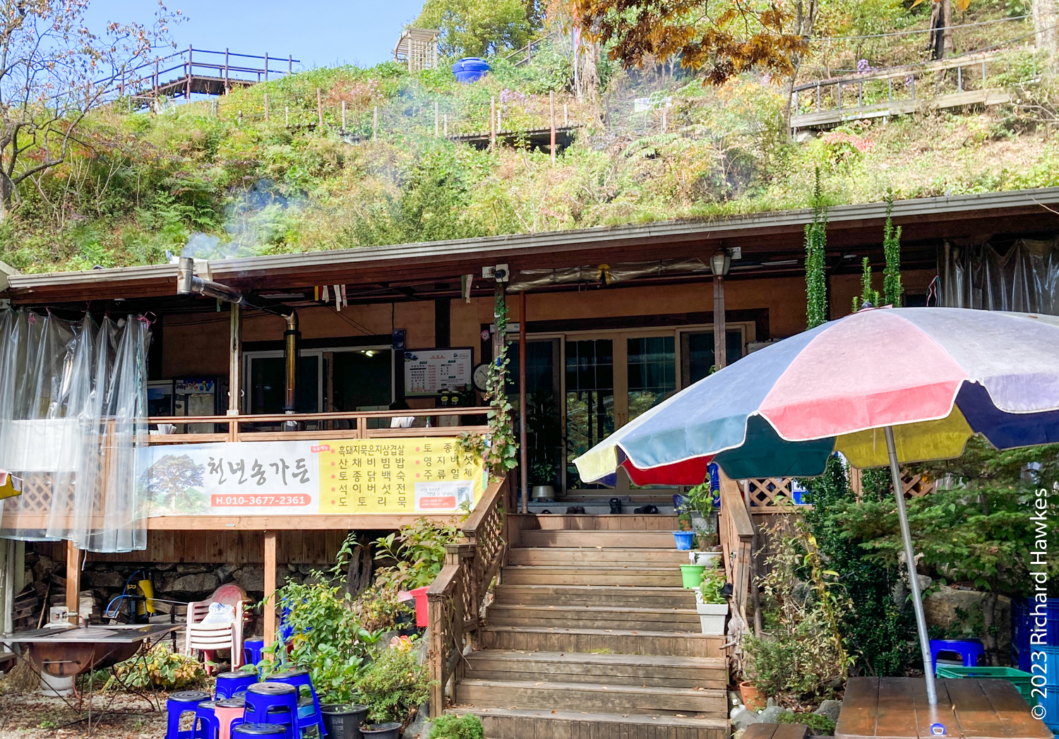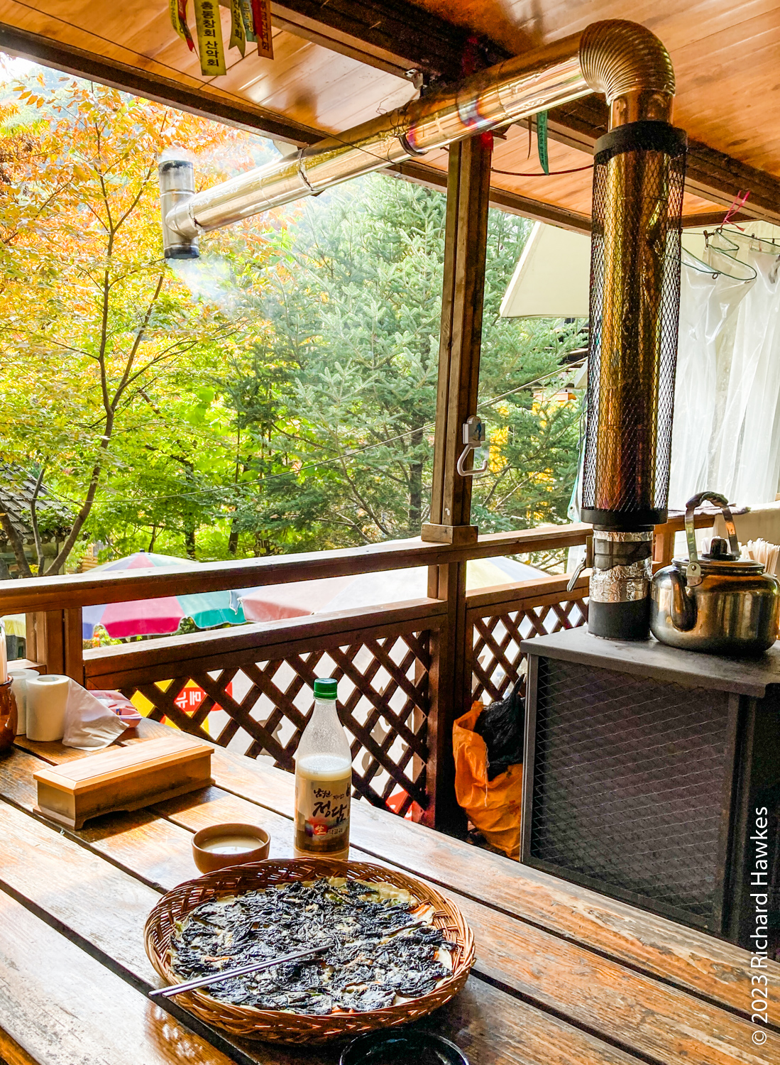 The village itself is a mixture of small and large houses, some quite new. There aren’t any old hanoks which was what I was expecting. There are also quite a few places to stay and about five or so restaurants. After exploring the village up and down the few lanes, I had a lunch of pajeon and makgeolli at Cheonnyeonsong Garden (천년송가든). It was a residential house with a dining area inside and a small terrace. I sat on the terrace next to a wood burning stove. The woman gave me a cup of hot medicinal tea from a kettle that was on the stove and later brought me a delicious Korea pancake (jeon) toped with black mushrooms harvested from the hills. I also had a bottle of the local makgeolli. It was all very idyllic and cosy.