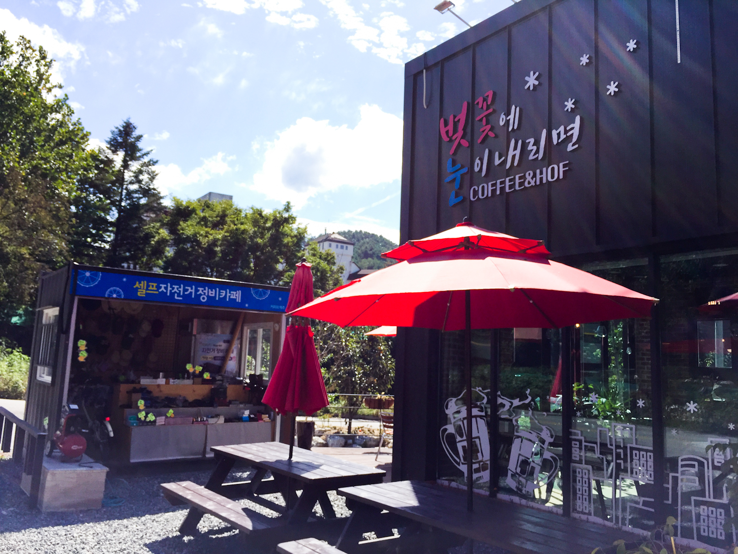 On my final morning, (on my way to meet my wife, brother-in-law and two nieces for one night camping and BBQ in Yangpyeong), I stopped by a cool looking village for a coffee at a coffee shop/cycle repair shop, with more great views of the mountains.