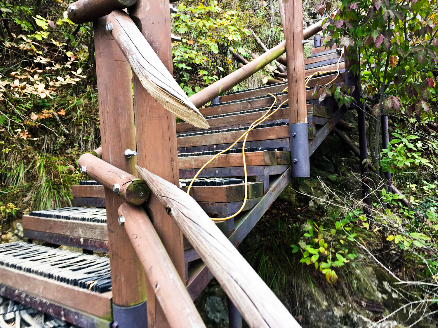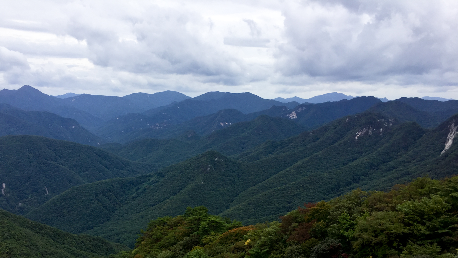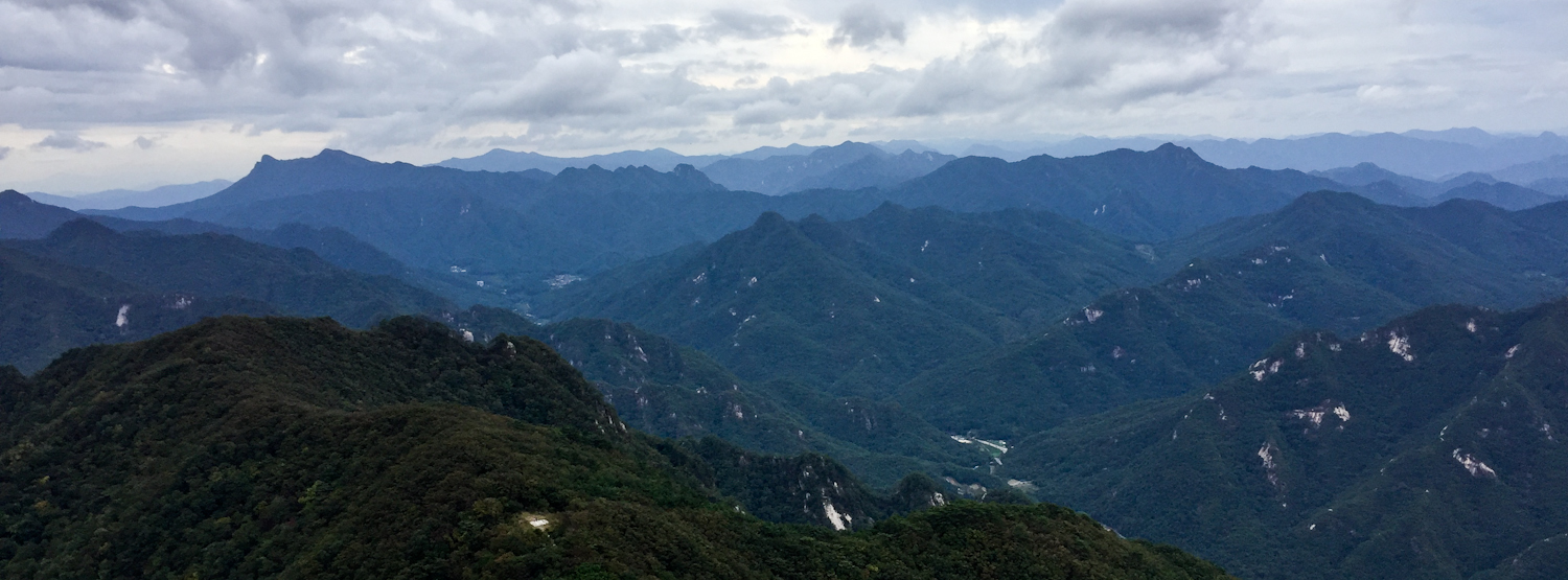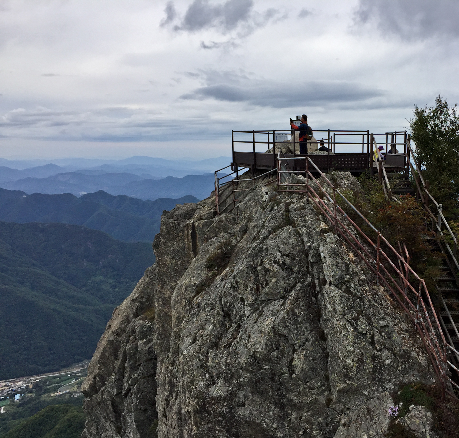 My route took me east, then north to the peak (Yeongbong – 영봉), then retraced my steps south a bit then west via an alternative route to Jagwangsa temple (광사). It took about 6 hours in total and was quite challenging. The mountain is fantastic though. Getting to the peak is quite straightforward and there are a lot of walkways and steps, par for the course in Korea. One set of metal steps was very impressive, On the way, I met a work crew rebuilding the walkways. They were all from Russia and Kazakhstan and were quite chatty. They were camping on the mountain during the week and were being supplied with a Soviet-era helicopter which I had passed parked the previous day while looking for the campsite and had heard buzzing around the mountain while hiking.